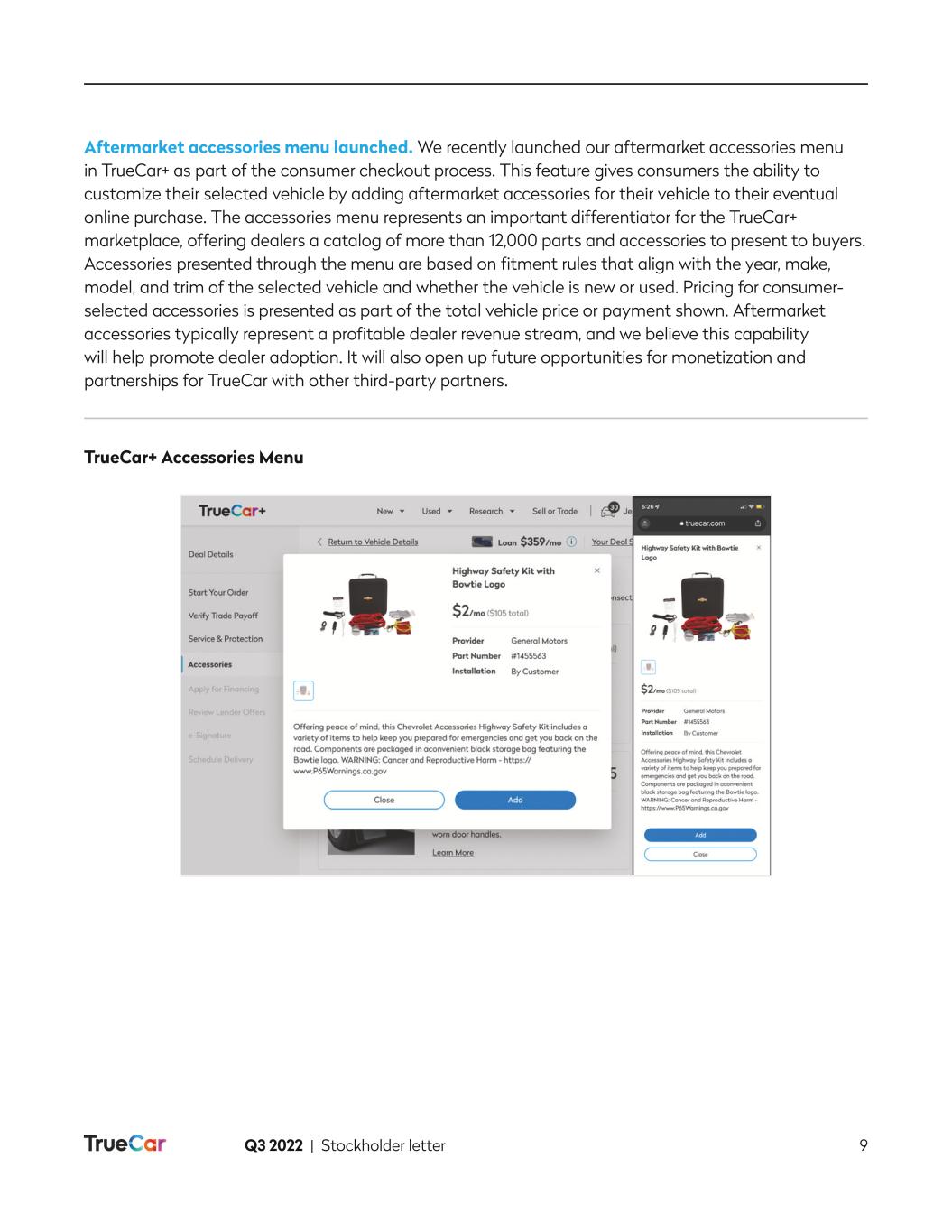 Q3 2022 | Stockholder letter 9 Aftermarket accessories menu launched. We recently launched our aftermarket accessories menu in TrueCar+ as part of the consumer checkout process. This feature gives consumers the ability to customize their selected vehicle by adding aftermarket accessories for their vehicle to their eventual online purchase. The accessories menu represents an important differentiator for the TrueCar+ marketplace, offering dealers a catalog of more than 12,000 parts and accessories to present to buyers. Accessories presented through the menu are based on fi tment rules that align with the year, make, model, and trim of the selected vehicle and whether the vehicle is new or used. Pricing for consumer- selected accessories is presented as part of the total vehicle price or payment shown. Aftermarket accessories typically represent a profi table dealer revenue stream, and we believe this capability will help promote dealer adoption. It will also open up future opportunities for monetization and partnerships for TrueCar with other third-party partners. TrueCar+ Accessories Menu