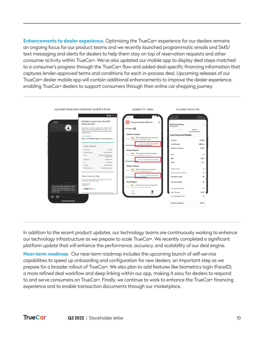 Q3 2022 | Stockholder letter 10 Enhancements to dealer experience. Optimizing the TrueCar+ experience for our dealers remains an ongoing focus for our product teams and we recently launched programmatic emails and SMS/ text messaging and alerts for dealers to help them stay on top of reservation requests and other consumer activity within TrueCar+. We’ve also updated our mobile app to display deal steps matched to a consumer’s progress through the TrueCar+ fl ow and added deal-specifi c fi nancing information that captures lender-approved terms and conditions for each in-process deal. Upcoming releases of our TrueCar+ dealer mobile app will contain additional enhancements to improve the dealer experience, enabling TrueCar+ dealers to support consumers through their online car shopping journey. In addition to the recent product updates, our technology teams are continuously working to enhance our technology infrastructure as we prepare to scale TrueCar+. We recently completed a signifi cant platform update that will enhance the performance, accuracy, and scalability of our deal engine. Near-term roadmap. Our near-term roadmap includes the upcoming launch of self-service capabilities to speed up onboarding and confi guration for new dealers, an important step as we prepare for a broader rollout of TrueCar+. We also plan to add features like biometrics login (FaceID), a more refi ned deal workfl ow and deep linking within our app, making it easy for dealers to respond to and serve consumers on TrueCar+. Finally, we continue to work to enhance the TrueCar+ fi nancing experience and to enable transaction documents through our marketplace.