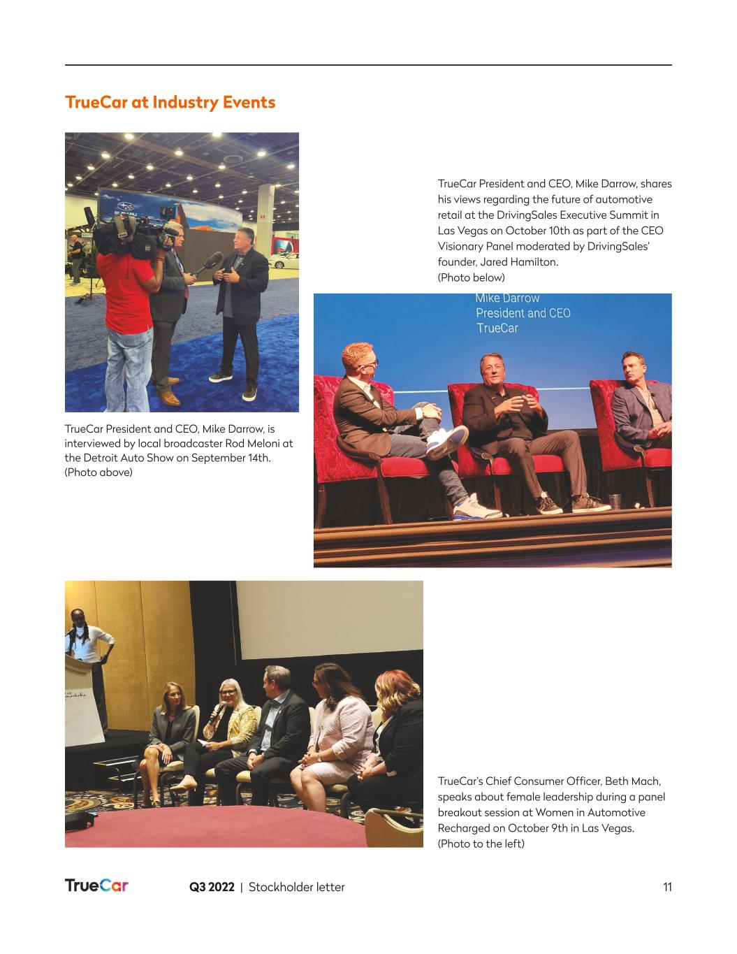 Q3 2022 | Stockholder letter 11 TrueCar at Industry Events TrueCar President and CEO, Mike Darrow, is interviewed by local broadcaster Rod Meloni at the Detroit Auto Show on September 14th. (Photo above) TrueCar President and CEO, Mike Darrow, shares his views regarding the future of automotive retail at the DrivingSales Executive Summit in Las Vegas on October 10th as part of the CEO Visionary Panel moderated by DrivingSales’ founder, Jared Hamilton. (Photo below) TrueCar’s Chief Consumer Offi cer, Beth Mach, speaks about female leadership during a panel breakout session at Women in Automotive Recharged on October 9th in Las Vegas. (Photo to the left)