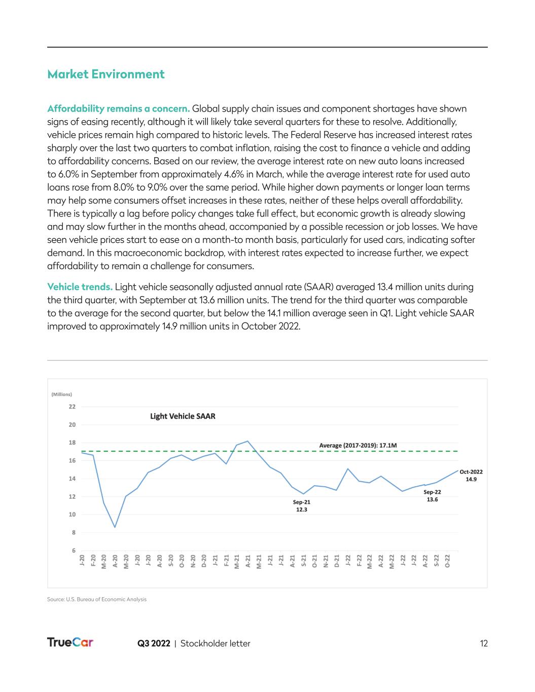 Q3 2022 | Stockholder letter 12 Market Environment Affordability remains a concern. Global supply chain issues and component shortages have shown signs of easing recently, although it will likely take several quarters for these to resolve. Additionally, vehicle prices remain high compared to historic levels. The Federal Reserve has increased interest rates sharply over the last two quarters to combat infl ation, raising the cost to fi nance a vehicle and adding to affordability concerns. Based on our review, the average interest rate on new auto loans increased to 6.0% in September from approximately 4.6% in March, while the average interest rate for used auto loans rose from 8.0% to 9.0% over the same period. While higher down payments or longer loan terms may help some consumers offset increases in these rates, neither of these helps overall affordability. There is typically a lag before policy changes take full effect, but economic growth is already slowing and may slow further in the months ahead, accompanied by a possible recession or job losses. We have seen vehicle prices start to ease on a month-to month basis, particularly for used cars, indicating softer demand. In this macroeconomic backdrop, with interest rates expected to increase further, we expect affordability to remain a challenge for consumers. Vehicle trends. Light vehicle seasonally adjusted annual rate (SAAR) averaged 13.4 million units during the third quarter, with September at 13.6 million units. The trend for the third quarter was comparable to the average for the second quarter, but below the 14.1 million average seen in Q1. Light vehicle SAAR improved to approximately 14.9 million units in October 2022. Source: U.S. Bureau of Economic Analysis