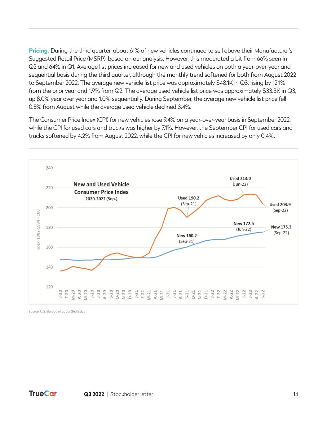 Q3 2022 | Stockholder letter 14 Source: U.S. Bureau of Labor Statistics Pricing. During the third quarter, about 61% of new vehicles continued to sell above their Manufacturer’s Suggested Retail Price (MSRP), based on our analysis. However, this moderated a bit from 66% seen in Q2 and 64% in Q1. Average list prices increased for new and used vehicles on both a year-over-year and sequential basis during the third quarter, although the monthly trend softened for both from August 2022 to September 2022. The average new vehicle list price was approximately $48.1K in Q3, rising by 12.1% from the prior year and 1.9% from Q2. The average used vehicle list price was approximately $33.3K in Q3, up 8.0% year over year and 1.0% sequentially. During September, the average new vehicle list price fell 0.5% from August while the average used vehicle declined 3.4%. The Consumer Price Index (CPI) for new vehicles rose 9.4% on a year-over-year basis in September 2022, while the CPI for used cars and trucks was higher by 7.1%. However, the September CPI for used cars and trucks softened by 4.2% from August 2022, while the CPI for new vehicles increased by only 0.4%.