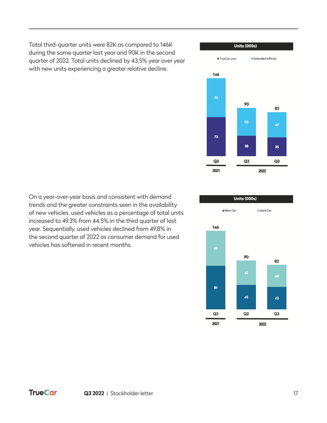 Q3 2022 | Stockholder letter 15 (1) Net loss for Q3 2022 includes a one-time goodwill impairment charge of $59.8 million. (2) Refer to the accompanying fi nancial tables for further details and a reconciliation of the non-GAAP measures presented to the most directly comparable GAAP measures located at the end of this letter. (3) Average Monthly Unique Visitors Revenue $39.1 million vs. $55.0 million in Q3 2021 Traffi c(3) 7.6 million vs. 8.3 million in Q3 2021 Net Loss(1) ($77.1) million vs. ($6.8) million in Q3 2021 Dealers 11,972 vs. 12,906 in Q3 2021 Adj. EBITDA(2) ($8.7) million vs. $1.5 million in Q3 2021 Units 82k vs. 146k in Q3 2021 Cash & Equivalents $193.0 million vs. $250.7 million in Q3 2021 Monetization $473/unit vs. $376/unit in Q3 2021 Third Quarter 2022 Financial Highlights Revenue: $39.1 million, down 29.0% year over year and 7.6% sequentially, due primarily to lower close rates as a result of limited dealer inventories and signifi cantly higher prices for vehicles, a combination that we believe stems mainly from ongoing disruptions seen across the global automotive supply chain, including the continuing semiconductor shortage. Net Loss(1): $(77.1) million, which includes a one-time goodwill impairment charge of $59.8 million, as compared to $(6.8) million in the third quarter of 2021 and $(11.0) million in the second quarter of 2022. Adjusted EBITDA(2): $(8.7) million, as compared to $1.5 million in the third quarter of 2021 and $(5.0) million in the second quarter of 2022. Financial Flexibility: Our balance sheet remained strong with cash and equivalents of approximately $193.0 million and no debt as of September 30, 2022. Third Quarter 2022 Metrics