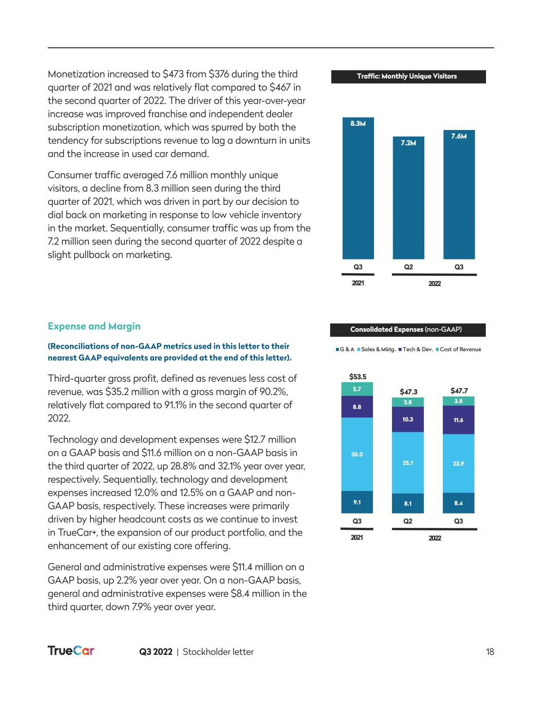 Q3 2022 | Stockholder letter 18 Monetization increased to $473 from $376 during the third quarter of 2021 and was relatively fl at compared to $467 in the second quarter of 2022. The driver of this year-over-year increase was improved franchise and independent dealer subscription monetization, which was spurred by both the tendency for subscriptions revenue to lag a downturn in units and the increase in used car demand. Consumer traffi c averaged 7.6 million monthly unique visitors, a decline from 8.3 million seen during the third quarter of 2021, which was driven in part by our decision to dial back on marketing in response to low vehicle inventory in the market. Sequentially, consumer traffi c was up from the 7.2 million seen during the second quarter of 2022 despite a slight pullback on marketing. Expense and Margin (Reconciliations of non-GAAP metrics used in this letter to their nearest GAAP equivalents are provided at the end of this letter). Third-quarter gross profi t, defi ned as revenues less cost of revenue, was $35.2 million with a gross margin of 90.2%, relatively fl at compared to 91.1% in the second quarter of 2022. Technology and development expenses were $12.7 million on a GAAP basis and $11.6 million on a non-GAAP basis in the third quarter of 2022, up 28.8% and 32.1% year over year, respectively. Sequentially, technology and development expenses increased 12.0% and 12.5% on a GAAP and non- GAAP basis, respectively. These increases were primarily driven by higher headcount costs as we continue to invest in TrueCar+, the expansion of our product portfolio, and the enhancement of our existing core offering. General and administrative expenses were $11.4 million on a GAAP basis, up 2.2% year over year. On a non-GAAP basis, general and administrative expenses were $8.4 million in the third quarter, down 7.9% year over year.