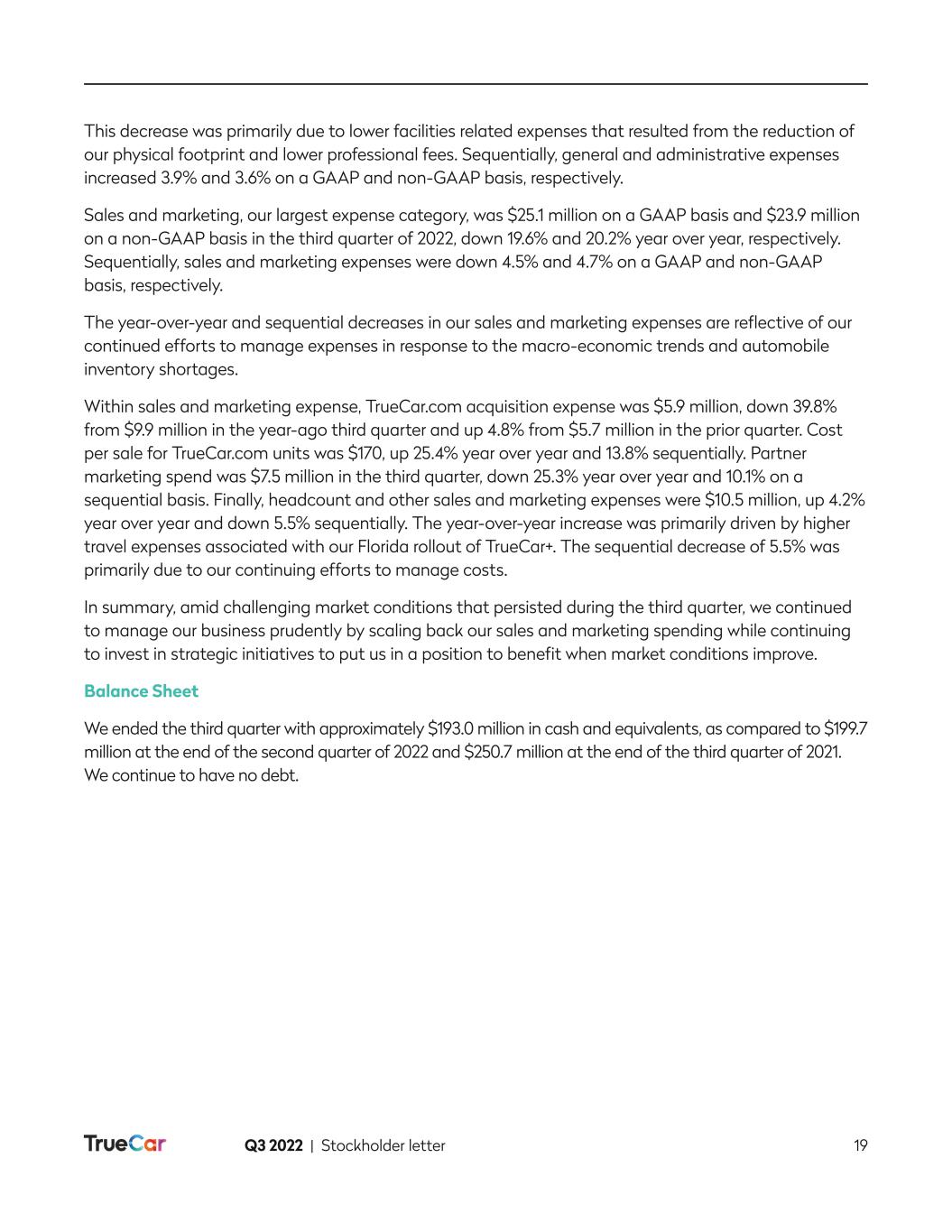 Q3 2022 | Stockholder letter 19 This decrease was primarily due to lower facilities related expenses that resulted from the reduction of our physical footprint and lower professional fees. Sequentially, general and administrative expenses increased 3.9% and 3.6% on a GAAP and non-GAAP basis, respectively. Sales and marketing, our largest expense category, was $25.1 million on a GAAP basis and $23.9 million on a non-GAAP basis in the third quarter of 2022, down 19.6% and 20.2% year over year, respectively. Sequentially, sales and marketing expenses were down 4.5% and 4.7% on a GAAP and non-GAAP basis, respectively. The year-over-year and sequential decreases in our sales and marketing expenses are refl ective of our continued efforts to manage expenses in response to the macro-economic trends and automobile inventory shortages. Within sales and marketing expense, TrueCar.com acquisition expense was $5.9 million, down 39.8% from $9.9 million in the year-ago third quarter and up 4.8% from $5.7 million in the prior quarter. Cost per sale for TrueCar.com units was $170, up 25.4% year over year and 13.8% sequentially. Partner marketing spend was $7.5 million in the third quarter, down 25.3% year over year and 10.1% on a sequential basis. Finally, headcount and other sales and marketing expenses were $10.5 million, up 4.2% year over year and down 5.5% sequentially. The year-over-year increase was primarily driven by higher travel expenses associated with our Florida rollout of TrueCar+. The sequential decrease of 5.5% was primarily due to our continuing efforts to manage costs. In summary, amid challenging market conditions that persisted during the third quarter, we continued to manage our business prudently by scaling back our sales and marketing spending while continuing to invest in strategic initiatives to put us in a position to benefi t when market conditions improve. Balance Sheet We ended the third quarter with approximately $193.0 million in cash and equivalents, as compared to $199.7 million at the end of the second quarter of 2022 and $250.7 million at the end of the third quarter of 2021. We continue to have no debt.