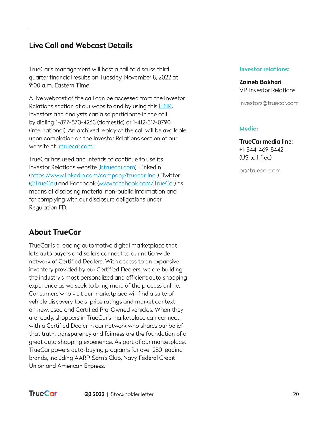 Q3 2022 | Stockholder letter 20 Live Call and Webcast Details TrueCar’s management will host a call to discuss third quarter fi nancial results on Tuesday, November 8, 2022 at 9:00 a.m. Eastern Time. A live webcast of the call can be accessed from the Investor Relations section of our website and by using this LINK. Investors and analysts can also participate in the call by dialing 1-877-870-4263 (domestic) or 1-412-317-0790 (international). An archived replay of the call will be available upon completion on the Investor Relations section of our website at ir.truecar.com. TrueCar has used and intends to continue to use its Investor Relations website (ir.truecar.com), LinkedIn (https://www.linkedin.com/company/truecar-inc-), Twitter (@TrueCar) and Facebook (www.facebook.com/TrueCar) as means of disclosing material non-public information and for complying with our disclosure obligations under Regulation FD. About TrueCar TrueCar is a leading automotive digital marketplace that lets auto buyers and sellers connect to our nationwide network of Certifi ed Dealers. With access to an expansive inventory provided by our Certifi ed Dealers, we are building the industry’s most personalized and effi cient auto shopping experience as we seek to bring more of the process online. Consumers who visit our marketplace will fi nd a suite of vehicle discovery tools, price ratings and market context on new, used and Certifi ed Pre-Owned vehicles. When they are ready, shoppers in TrueCar’s marketplace can connect with a Certifi ed Dealer in our network who shares our belief that truth, transparency and fairness are the foundation of a great auto shopping experience. As part of our marketplace, TrueCar powers auto-buying programs for over 250 leading brands, including AARP, Sam’s Club, Navy Federal Credit Union and American Express. Investor relations: Zaineb Bokhari VP, Investor Relations investors@truecar.com Media: TrueCar media line: +1-844-469-8442 (US toll-free) pr@truecar.com