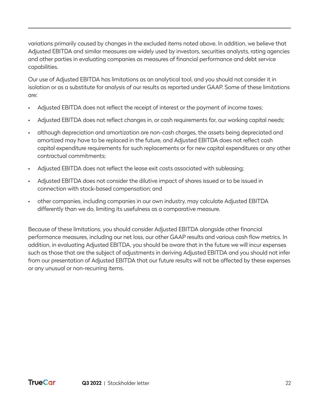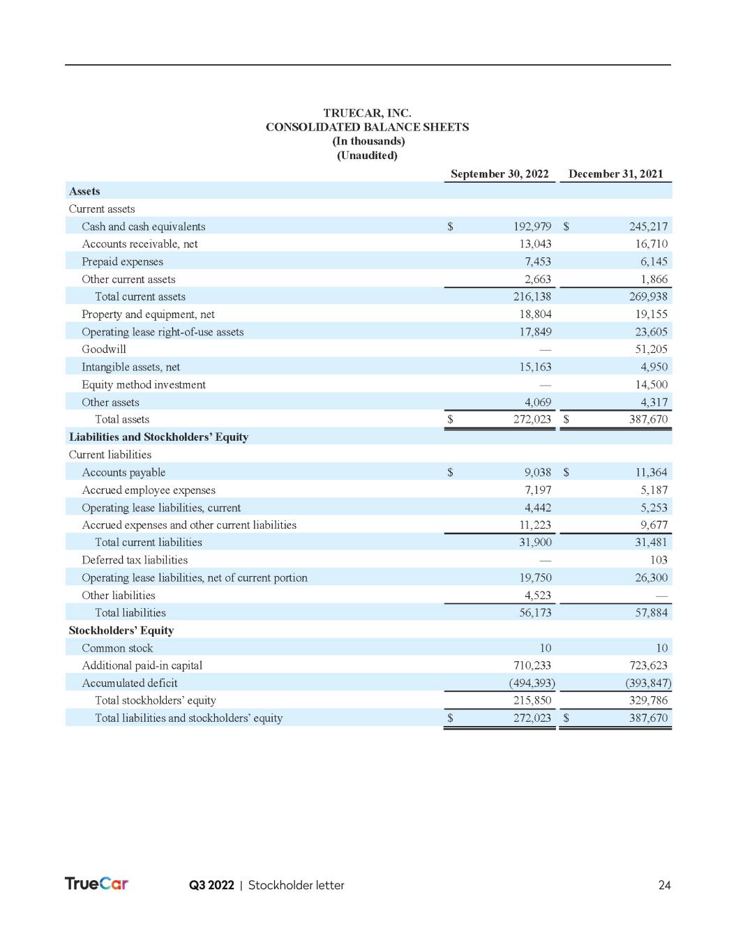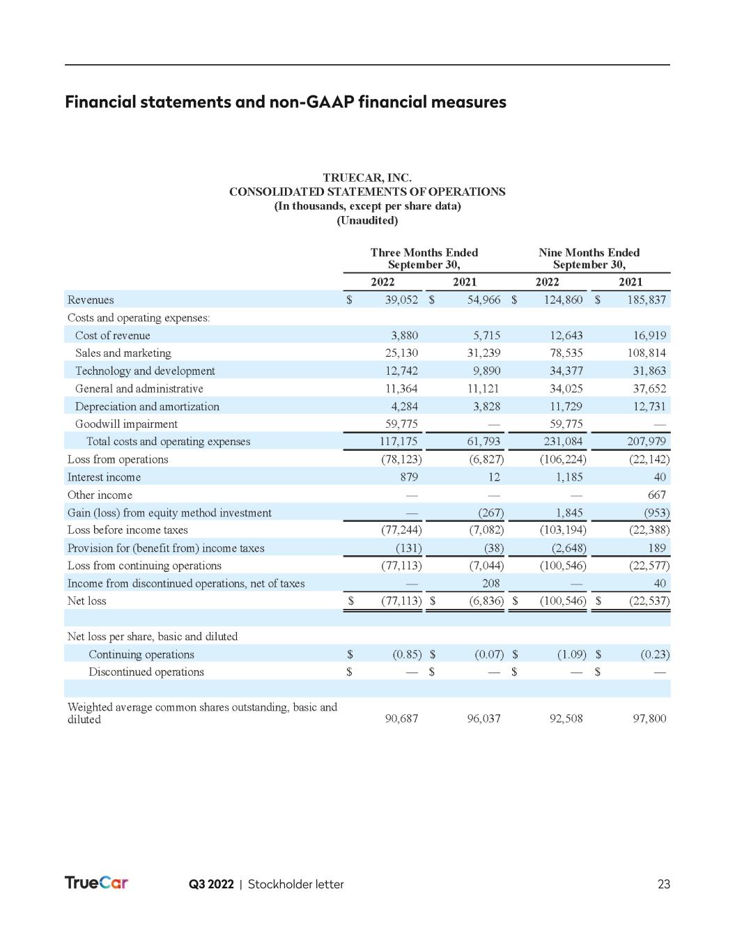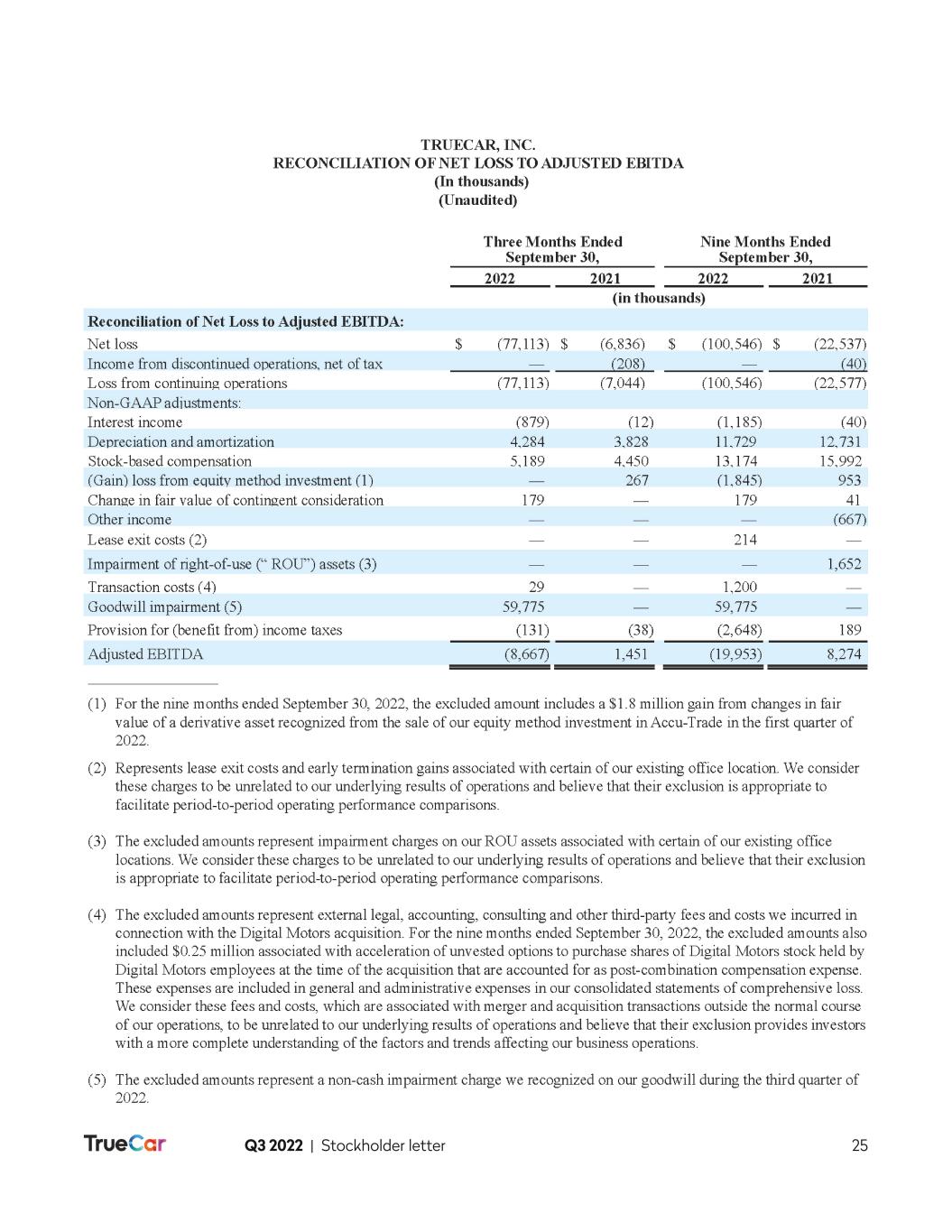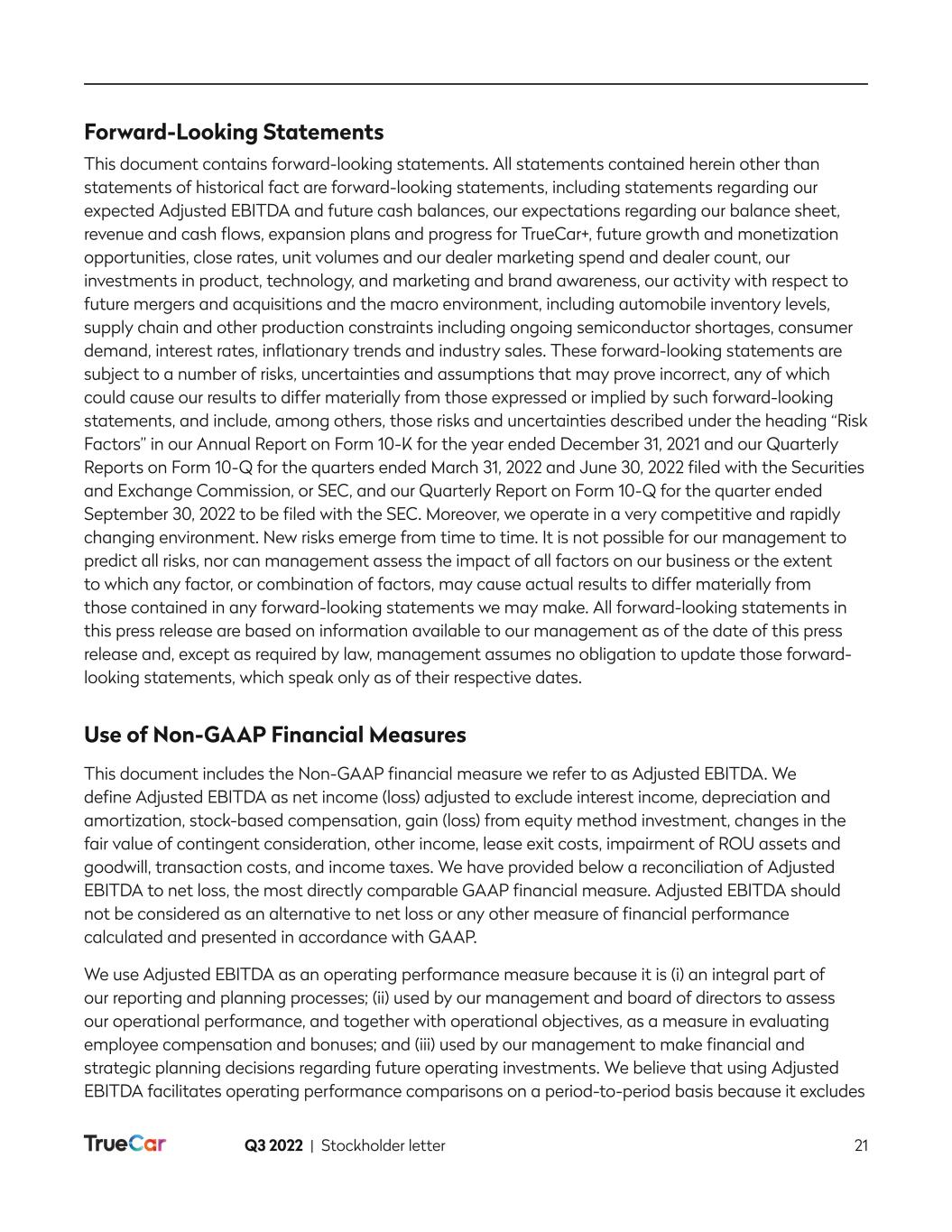 Q3 2022 | Stockholder letter 21 Forward-Looking Statements This document contains forward-looking statements. All statements contained herein other than statements of historical fact are forward-looking statements, including statements regarding our expected Adjusted EBITDA and future cash balances, our expectations regarding our balance sheet, revenue and cash fl ows, expansion plans and progress for TrueCar+, future growth and monetization opportunities, close rates, unit volumes and our dealer marketing spend and dealer count, our investments in product, technology, and marketing and brand awareness, our activity with respect to future mergers and acquisitions and the macro environment, including automobile inventory levels, supply chain and other production constraints including ongoing semiconductor shortages, consumer demand, interest rates, infl ationary trends and industry sales. These forward-looking statements are subject to a number of risks, uncertainties and assumptions that may prove incorrect, any of which could cause our results to differ materially from those expressed or implied by such forward-looking statements, and include, among others, those risks and uncertainties described under the heading “Risk Factors” in our Annual Report on Form 10-K for the year ended December 31, 2021 and our Quarterly Reports on Form 10-Q for the quarters ended March 31, 2022 and June 30, 2022 fi led with the Securities and Exchange Commission, or SEC, and our Quarterly Report on Form 10-Q for the quarter ended September 30, 2022 to be fi led with the SEC. Moreover, we operate in a very competitive and rapidly changing environment. New risks emerge from time to time. It is not possible for our management to predict all risks, nor can management assess the impact of all factors on our business or the extent to which any factor, or combination of factors, may cause actual results to differ materially from those contained in any forward-looking statements we may make. All forward-looking statements in this press release are based on information available to our management as of the date of this press release and, except as required by law, management assumes no obligation to update those forward- looking statements, which speak only as of their respective dates. Use of Non-GAAP Financial Measures This document includes the Non-GAAP fi nancial measure we refer to as Adjusted EBITDA. We defi ne Adjusted EBITDA as net income (loss) adjusted to exclude interest income, depreciation and amortization, stock-based compensation, gain (loss) from equity method investment, changes in the fair value of contingent consideration, other income, lease exit costs, impairment of ROU assets and goodwill, transaction costs, and income taxes. We have provided below a reconciliation of Adjusted EBITDA to net loss, the most directly comparable GAAP fi nancial measure. Adjusted EBITDA should not be considered as an alternative to net loss or any other measure of fi nancial performance calculated and presented in accordance with GAAP. We use Adjusted EBITDA as an operating performance measure because it is (i) an integral part of our reporting and planning processes; (ii) used by our management and board of directors to assess our operational performance, and together with operational objectives, as a measure in evaluating employee compensation and bonuses; and (iii) used by our management to make fi nancial and strategic planning decisions regarding future operating investments. We believe that using Adjusted EBITDA facilitates operating performance comparisons on a period-to-period basis because it excludes