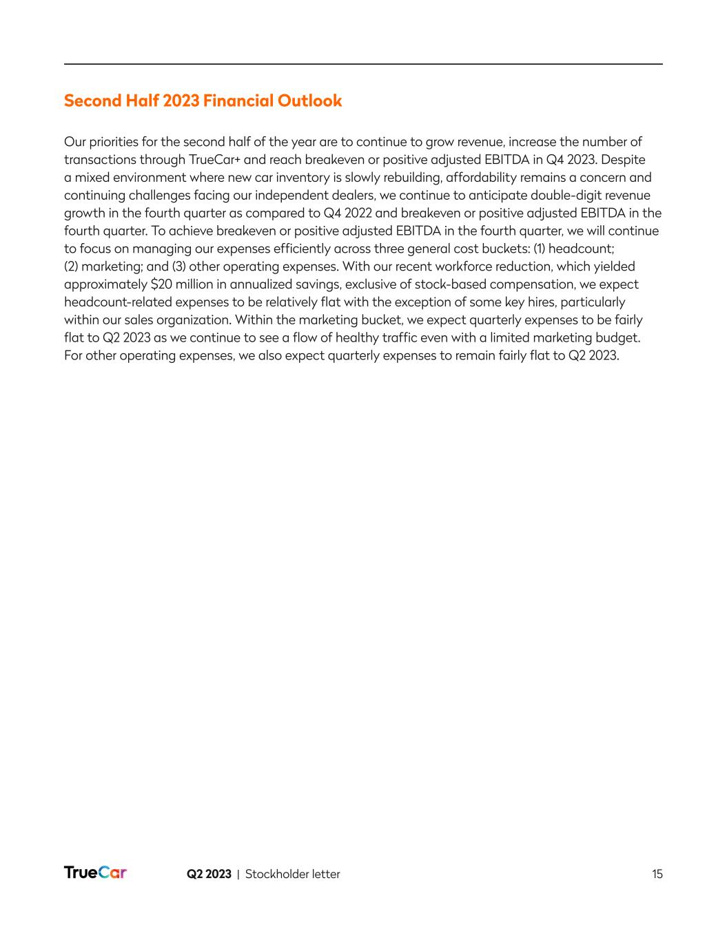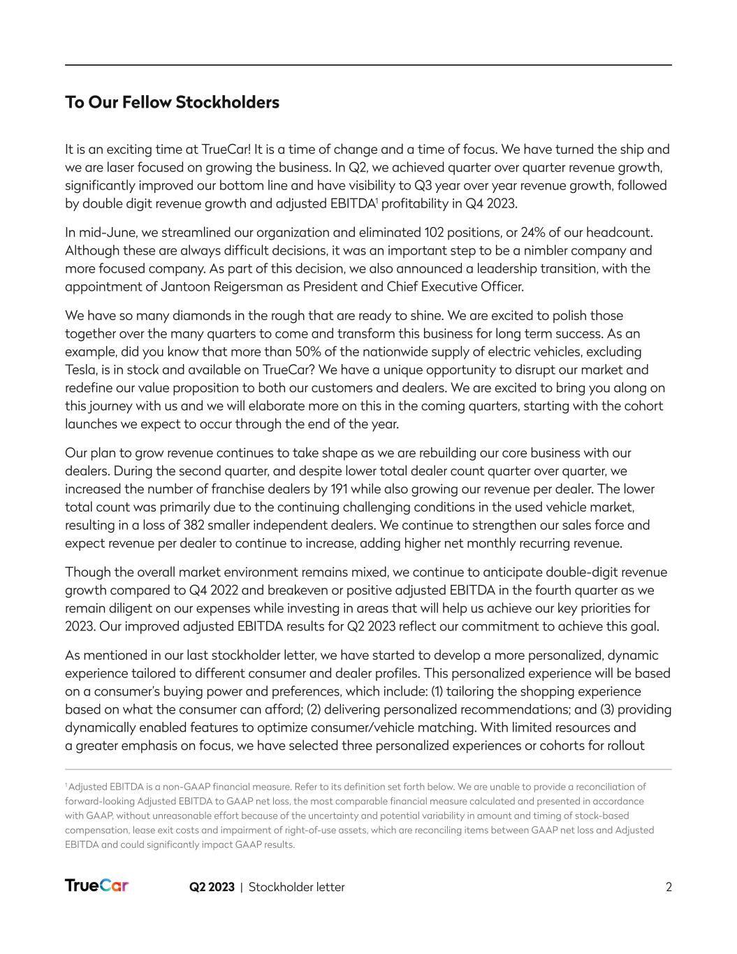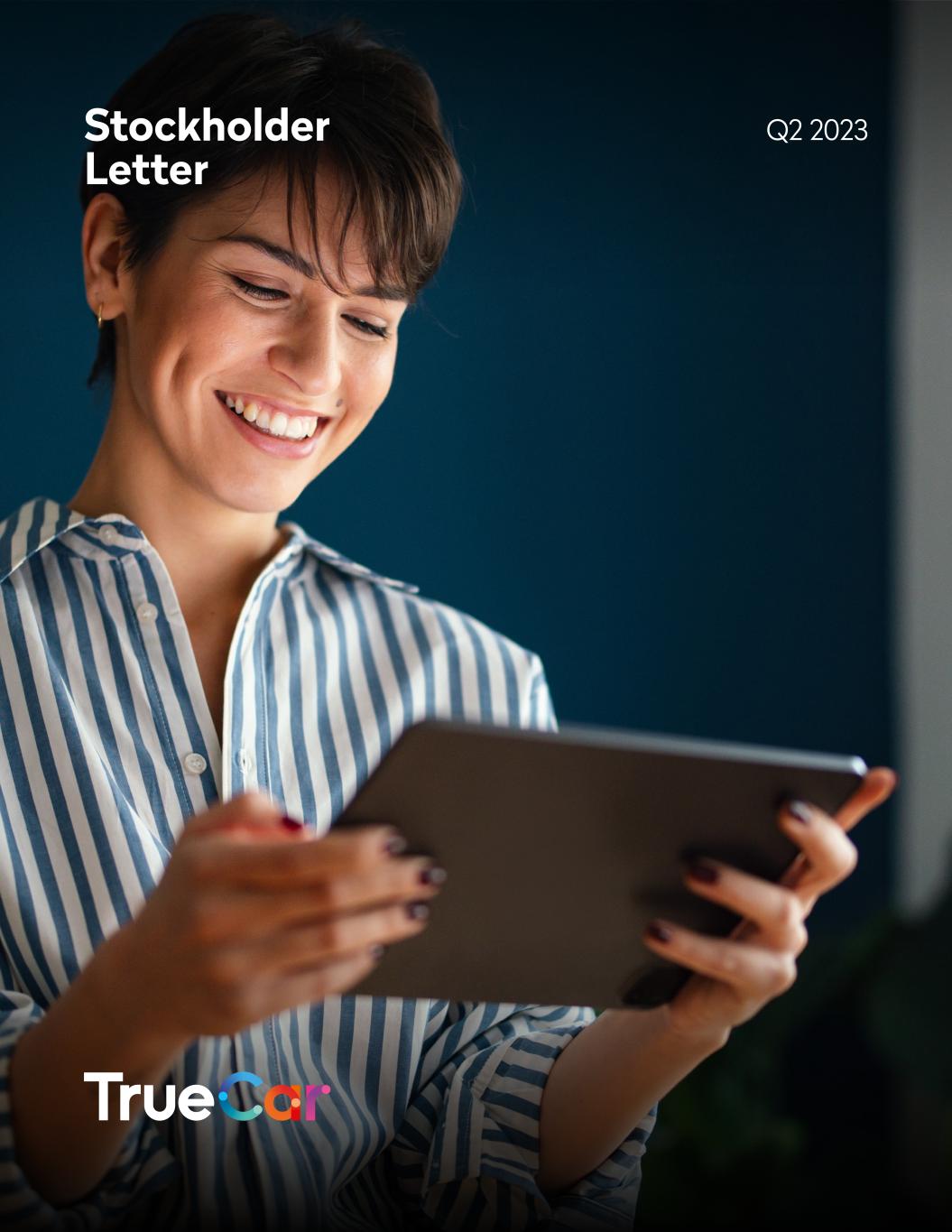Q2 2023 | Stockholder letter 2 To Our Fellow Stockholders It is an exciting time at TrueCar! It is a time of change and a time of focus. We have turned the ship and we are laser focused on growing the business. In Q2, we achieved quarter over quarter revenue growth, significantly improved our bottom line and have visibility to Q3 year over year revenue growth, followed by double digit revenue growth and adjusted EBITDA1 profitability in Q4 2023. In mid-June, we streamlined our organization and eliminated 102 positions, or 24% of our headcount. Although these are always difficult decisions, it was an important step to be a nimbler company and more focused company. As part of this decision, we also announced a leadership transition, with the appointment of Jantoon Reigersman as President and Chief Executive Officer. We have so many diamonds in the rough that are ready to shine. We are excited to polish those together over the many quarters to come and transform this business for long term success. As an example, did you know that more than 50% of the nationwide supply of electric vehicles, excluding Tesla, is in stock and available on TrueCar? We have a unique opportunity to disrupt our market and redefine our value proposition to both our customers and dealers. We are excited to bring you along on this journey with us and we will elaborate more on this in the coming quarters, starting with the cohort launches we expect to occur through the end of the year. Our plan to grow revenue continues to take shape as we are rebuilding our core business with our dealers. During the second quarter, and despite lower total dealer count quarter over quarter, we increased the number of franchise dealers by 191 while also growing our revenue per dealer. The lower total count was primarily due to the continuing challenging conditions in the used vehicle market, resulting in a loss of 382 smaller independent dealers. We continue to strengthen our sales force and expect revenue per dealer to continue to increase, adding higher net monthly recurring revenue. Though the overall market environment remains mixed, we continue to anticipate double-digit revenue growth compared to Q4 2022 and breakeven or positive adjusted EBITDA in the fourth quarter as we remain diligent on our expenses while investing in areas that will help us achieve our key priorities for 2023. Our improved adjusted EBITDA results for Q2 2023 reflect our commitment to achieve this goal. As mentioned in our last stockholder letter, we have started to develop a more personalized, dynamic experience tailored to different consumer and dealer profiles. This personalized experience will be based on a consumer’s buying power and preferences, which include: (1) tailoring the shopping experience based on what the consumer can afford; (2) delivering personalized recommendations; and (3) providing dynamically enabled features to optimize consumer/vehicle matching. With limited resources and a greater emphasis on focus, we have selected three personalized experiences or cohorts for rollout 1 Adjusted EBITDA is a non-GAAP financial measure. Refer to its definition set forth below. We are unable to provide a reconciliation of forward-looking Adjusted EBITDA to GAAP net loss, the most comparable financial measure calculated and presented in accordance with GAAP, without unreasonable effort because of the uncertainty and potential variability in amount and timing of stock-based compensation, lease exit costs and impairment of right-of-use assets, which are reconciling items between GAAP net loss and Adjusted EBITDA and could significantly impact GAAP results.