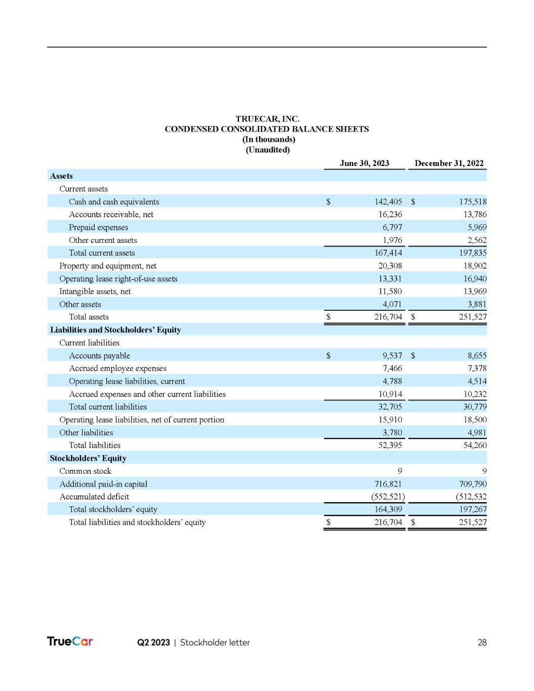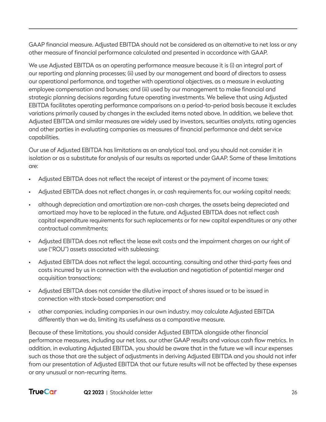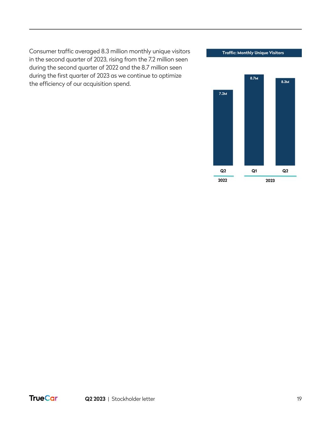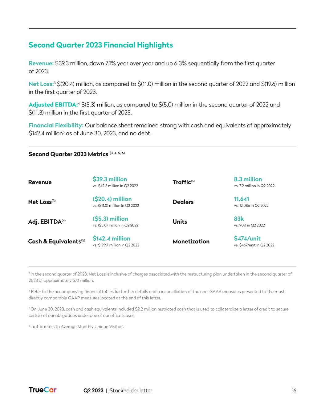 Q2 2023 | Stockholder letter 2 To Our Fellow Stockholders It is an exciting time at TrueCar! It is a time of change and a time of focus. We have turned the ship and we are laser focused on growing the business. In Q2, we achieved quarter over quarter revenue growth, significantly improved our bottom line and have visibility to Q3 year over year revenue growth, followed by double digit revenue growth and adjusted EBITDA1 profitability in Q4 2023. In mid-June, we streamlined our organization and eliminated 102 positions, or 24% of our headcount. Although these are always difficult decisions, it was an important step to be a nimbler company and more focused company. As part of this decision, we also announced a leadership transition, with the appointment of Jantoon Reigersman as President and Chief Executive Officer. We have so many diamonds in the rough that are ready to shine. We are excited to polish those together over the many quarters to come and transform this business for long term success. As an example, did you know that more than 50% of the nationwide supply of electric vehicles, excluding Tesla, is in stock and available on TrueCar? We have a unique opportunity to disrupt our market and redefine our value proposition to both our customers and dealers. We are excited to bring you along on this journey with us and we will elaborate more on this in the coming quarters, starting with the cohort launches we expect to occur through the end of the year. Our plan to grow revenue continues to take shape as we are rebuilding our core business with our dealers. During the second quarter, and despite lower total dealer count quarter over quarter, we increased the number of franchise dealers by 191 while also growing our revenue per dealer. The lower total count was primarily due to the continuing challenging conditions in the used vehicle market, resulting in a loss of 382 smaller independent dealers. We continue to strengthen our sales force and expect revenue per dealer to continue to increase, adding higher net monthly recurring revenue. Though the overall market environment remains mixed, we continue to anticipate double-digit revenue growth compared to Q4 2022 and breakeven or positive adjusted EBITDA in the fourth quarter as we remain diligent on our expenses while investing in areas that will help us achieve our key priorities for 2023. Our improved adjusted EBITDA results for Q2 2023 reflect our commitment to achieve this goal. As mentioned in our last stockholder letter, we have started to develop a more personalized, dynamic experience tailored to different consumer and dealer profiles. This personalized experience will be based on a consumer’s buying power and preferences, which include: (1) tailoring the shopping experience based on what the consumer can afford; (2) delivering personalized recommendations; and (3) providing dynamically enabled features to optimize consumer/vehicle matching. With limited resources and a greater emphasis on focus, we have selected three personalized experiences or cohorts for rollout 1 Adjusted EBITDA is a non-GAAP financial measure. Refer to its definition set forth below. We are unable to provide a reconciliation of forward-looking Adjusted EBITDA to GAAP net loss, the most comparable financial measure calculated and presented in accordance with GAAP, without unreasonable effort because of the uncertainty and potential variability in amount and timing of stock-based compensation, lease exit costs and impairment of right-of-use assets, which are reconciling items between GAAP net loss and Adjusted EBITDA and could significantly impact GAAP results.