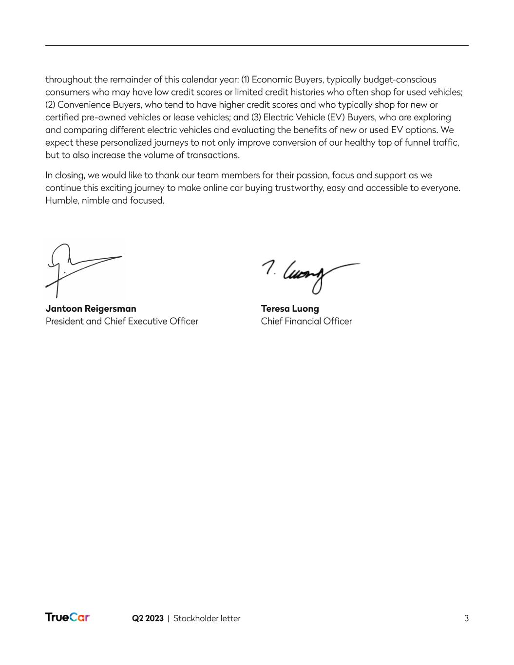 Q2 2023 | Stockholder letter 3 throughout the remainder of this calendar year: (1) Economic Buyers, typically budget-conscious consumers who may have low credit scores or limited credit histories who often shop for used vehicles; (2) Convenience Buyers, who tend to have higher credit scores and who typically shop for new or certified pre-owned vehicles or lease vehicles; and (3) Electric Vehicle (EV) Buyers, who are exploring and comparing different electric vehicles and evaluating the benefits of new or used EV options. We expect these personalized journeys to not only improve conversion of our healthy top of funnel traffic, but to also increase the volume of transactions. In closing, we would like to thank our team members for their passion, focus and support as we continue this exciting journey to make online car buying trustworthy, easy and accessible to everyone. Humble, nimble and focused. Jantoon Reigersman President and Chief Executive Officer Teresa Luong Chief Financial Officer