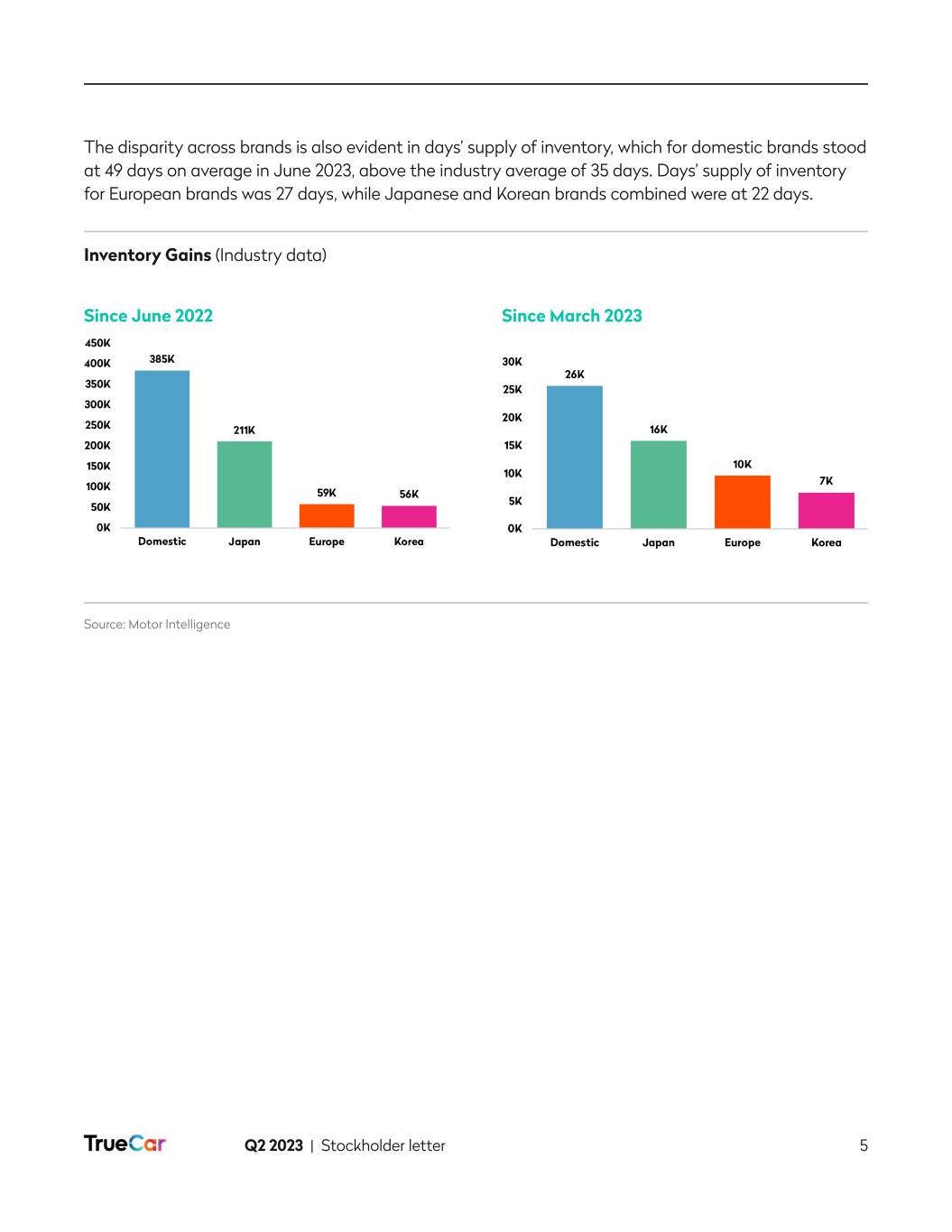 Q2 2023 | Stockholder letter 4 Market Environment During the second quarter, new vehicle inventory declined slightly from the 1.8 million units seen in March 2023 before rising back to 1.9 million units at the end of June. Affordability remains a concern for many consumers as interest rates remain high and vehicle markups are significantly higher than pre-pandemic periods, increasing the overall cost of leasing or financing vehicles. Domestic brands continue to garner the largest share of inventory gains. New vehicle inventory rose to 1.9 million units in June 2023, up 62.1% or approximately 711 thousand units from June 2022. On a sequential basis, new vehicle inventory increased by a modest 3.2% or 58 thousand units from March 2023. While this progress has improved significantly year over year, current year inventory improvement has slowed and is far below pre-pandemic levels of 3.5 million to 4 million units. Domestic OEM brands continue to garner a larger share of the gains. Source: Motor Intelligence New Vehicle Inventory (Industry)