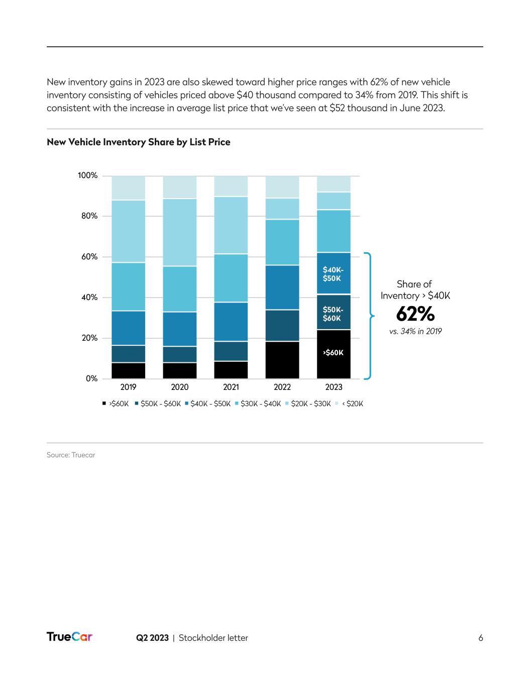 Q2 2023 | Stockholder letter 6 New inventory gains in 2023 are also skewed toward higher price ranges with 62% of new vehicle inventory consisting of vehicles priced above $40 thousand compared to 34% from 2019. This shift is consistent with the increase in average list price that we’ve seen at $52 thousand in June 2023. New Vehicle Inventory Share by List Price Source: Truecar