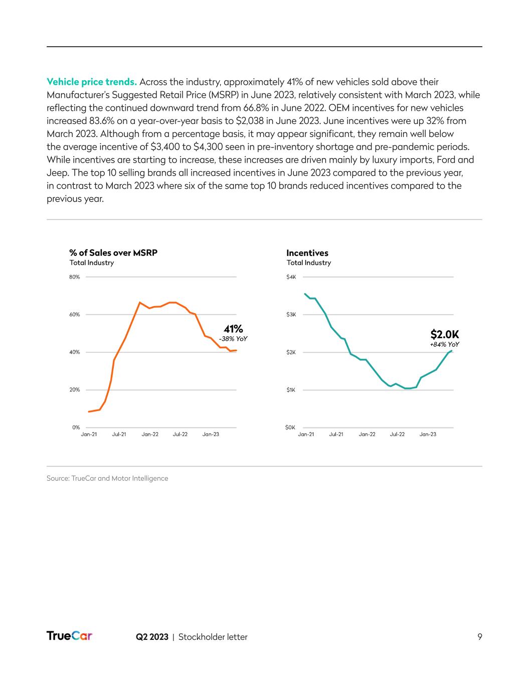 Q2 2023 | Stockholder letter 9 Vehicle price trends. Across the industry, approximately 41% of new vehicles sold above their Manufacturer’s Suggested Retail Price (MSRP) in June 2023, relatively consistent with March 2023, while reflecting the continued downward trend from 66.8% in June 2022. OEM incentives for new vehicles increased 83.6% on a year-over-year basis to $2,038 in June 2023. June incentives were up 32% from March 2023. Although from a percentage basis, it may appear significant, they remain well below the average incentive of $3,400 to $4,300 seen in pre-inventory shortage and pre-pandemic periods. While incentives are starting to increase, these increases are driven mainly by luxury imports, Ford and Jeep. The top 10 selling brands all increased incentives in June 2023 compared to the previous year, in contrast to March 2023 where six of the same top 10 brands reduced incentives compared to the previous year. Source: TrueCar and Motor Intelligence