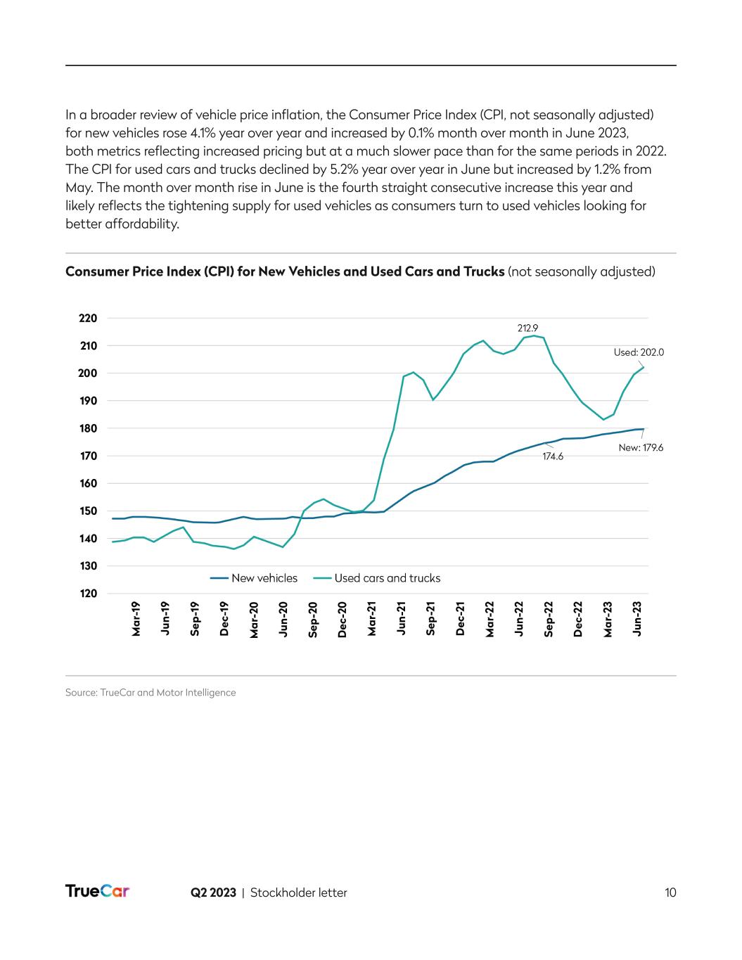 Q2 2023 | Stockholder letter 10 In a broader review of vehicle price inflation, the Consumer Price Index (CPI, not seasonally adjusted) for new vehicles rose 4.1% year over year and increased by 0.1% month over month in June 2023, both metrics reflecting increased pricing but at a much slower pace than for the same periods in 2022. The CPI for used cars and trucks declined by 5.2% year over year in June but increased by 1.2% from May. The month over month rise in June is the fourth straight consecutive increase this year and likely reflects the tightening supply for used vehicles as consumers turn to used vehicles looking for better affordability. Consumer Price Index (CPI) for New Vehicles and Used Cars and Trucks (not seasonally adjusted) Source: TrueCar and Motor Intelligence