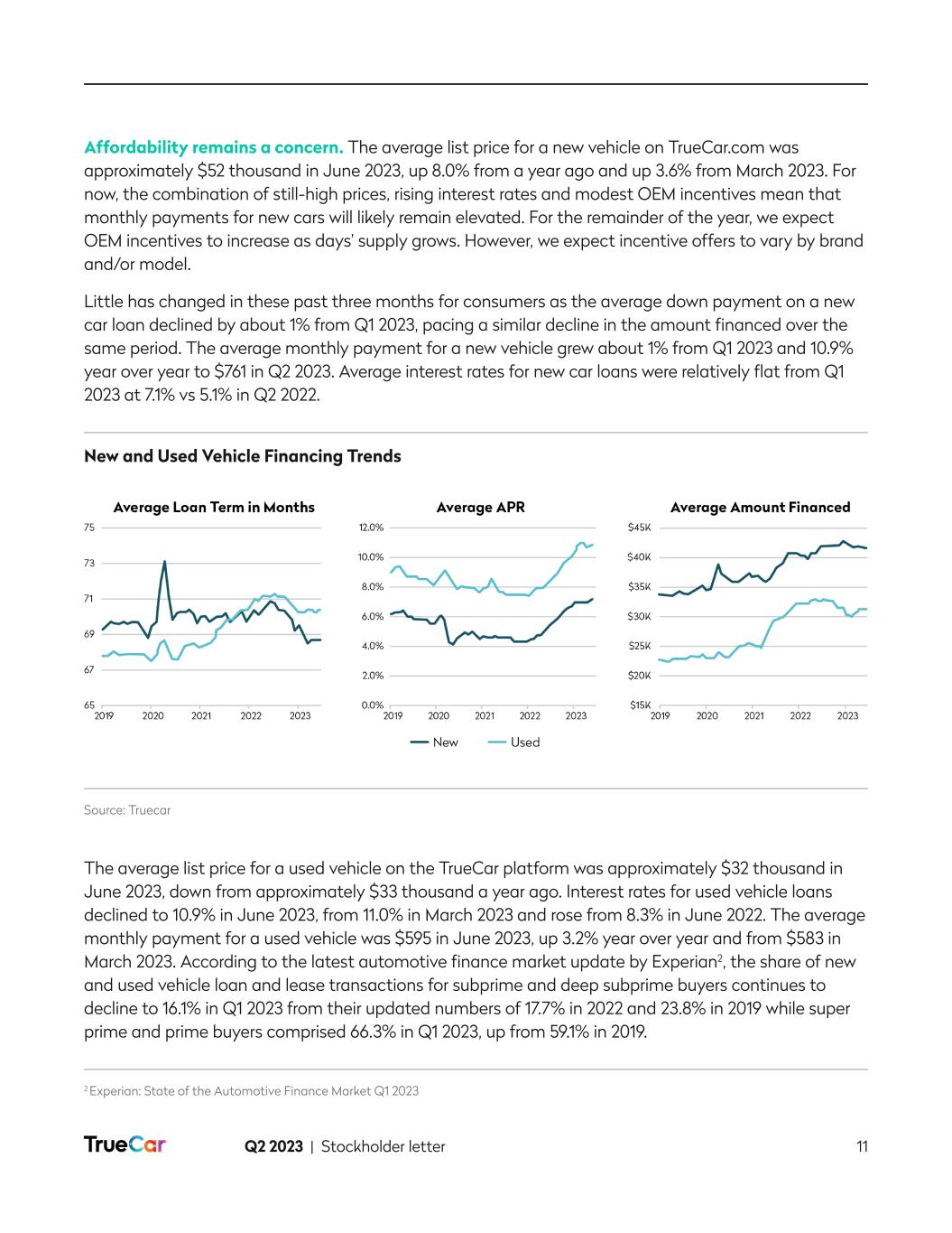 Q2 2023 | Stockholder letter 11 Affordability remains a concern. The average list price for a new vehicle on TrueCar.com was approximately $52 thousand in June 2023, up 8.0% from a year ago and up 3.6% from March 2023. For now, the combination of still-high prices, rising interest rates and modest OEM incentives mean that monthly payments for new cars will likely remain elevated. For the remainder of the year, we expect OEM incentives to increase as days’ supply grows. However, we expect incentive offers to vary by brand and/or model. Little has changed in these past three months for consumers as the average down payment on a new car loan declined by about 1% from Q1 2023, pacing a similar decline in the amount financed over the same period. The average monthly payment for a new vehicle grew about 1% from Q1 2023 and 10.9% year over year to $761 in Q2 2023. Average interest rates for new car loans were relatively flat from Q1 2023 at 7.1% vs 5.1% in Q2 2022. New and Used Vehicle Financing Trends Source: Truecar The average list price for a used vehicle on the TrueCar platform was approximately $32 thousand in June 2023, down from approximately $33 thousand a year ago. Interest rates for used vehicle loans declined to 10.9% in June 2023, from 11.0% in March 2023 and rose from 8.3% in June 2022. The average monthly payment for a used vehicle was $595 in June 2023, up 3.2% year over year and from $583 in March 2023. According to the latest automotive finance market update by Experian2, the share of new and used vehicle loan and lease transactions for subprime and deep subprime buyers continues to decline to 16.1% in Q1 2023 from their updated numbers of 17.7% in 2022 and 23.8% in 2019 while super prime and prime buyers comprised 66.3% in Q1 2023, up from 59.1% in 2019. 2 Experian: State of the Automotive Finance Market Q1 2023