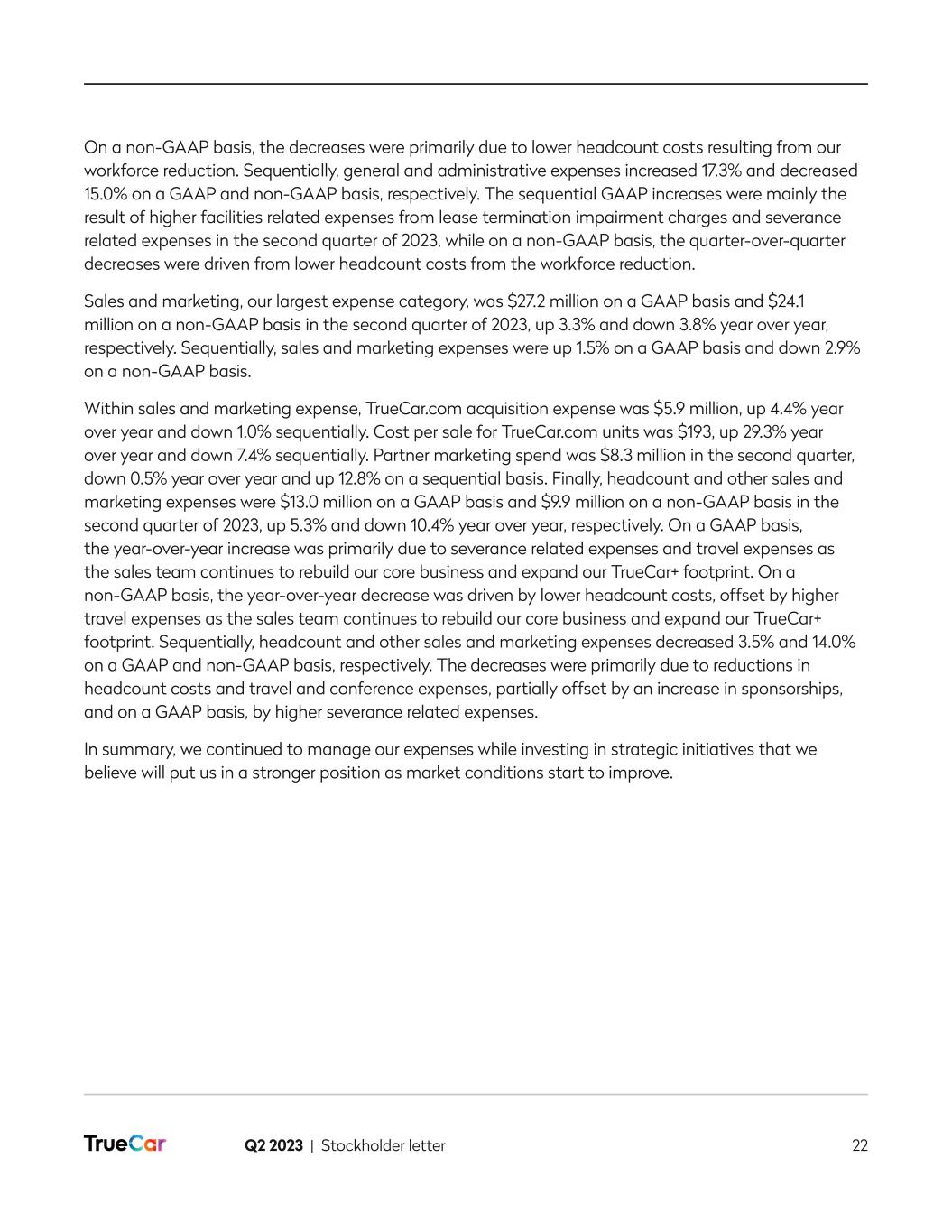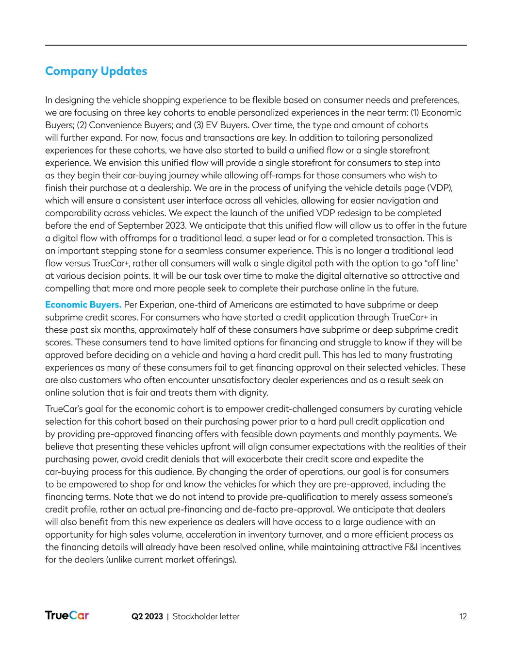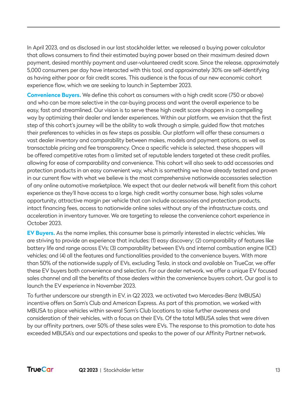 Q2 2023 | Stockholder letter 12 Company Updates In designing the vehicle shopping experience to be flexible based on consumer needs and preferences, we are focusing on three key cohorts to enable personalized experiences in the near term: (1) Economic Buyers; (2) Convenience Buyers; and (3) EV Buyers. Over time, the type and amount of cohorts will further expand. For now, focus and transactions are key. In addition to tailoring personalized experiences for these cohorts, we have also started to build a unified flow or a single storefront experience. We envision this unified flow will provide a single storefront for consumers to step into as they begin their car-buying journey while allowing off-ramps for those consumers who wish to finish their purchase at a dealership. We are in the process of unifying the vehicle details page (VDP), which will ensure a consistent user interface across all vehicles, allowing for easier navigation and comparability across vehicles. We expect the launch of the unified VDP redesign to be completed before the end of September 2023. We anticipate that this unified flow will allow us to offer in the future a digital flow with offramps for a traditional lead, a super lead or for a completed transaction. This is an important stepping stone for a seamless consumer experience. This is no longer a traditional lead flow versus TrueCar+, rather all consumers will walk a single digital path with the option to go “off line” at various decision points. It will be our task over time to make the digital alternative so attractive and compelling that more and more people seek to complete their purchase online in the future. Economic Buyers. Per Experian, one-third of Americans are estimated to have subprime or deep subprime credit scores. For consumers who have started a credit application through TrueCar+ in these past six months, approximately half of these consumers have subprime or deep subprime credit scores. These consumers tend to have limited options for financing and struggle to know if they will be approved before deciding on a vehicle and having a hard credit pull. This has led to many frustrating experiences as many of these consumers fail to get financing approval on their selected vehicles. These are also customers who often encounter unsatisfactory dealer experiences and as a result seek an online solution that is fair and treats them with dignity. TrueCar’s goal for the economic cohort is to empower credit-challenged consumers by curating vehicle selection for this cohort based on their purchasing power prior to a hard pull credit application and by providing pre-approved financing offers with feasible down payments and monthly payments. We believe that presenting these vehicles upfront will align consumer expectations with the realities of their purchasing power, avoid credit denials that will exacerbate their credit score and expedite the car-buying process for this audience. By changing the order of operations, our goal is for consumers to be empowered to shop for and know the vehicles for which they are pre-approved, including the financing terms. Note that we do not intend to provide pre-qualification to merely assess someone’s credit profile, rather an actual pre-financing and de-facto pre-approval. We anticipate that dealers will also benefit from this new experience as dealers will have access to a large audience with an opportunity for high sales volume, acceleration in inventory turnover, and a more efficient process as the financing details will already have been resolved online, while maintaining attractive F&I incentives for the dealers (unlike current market offerings).