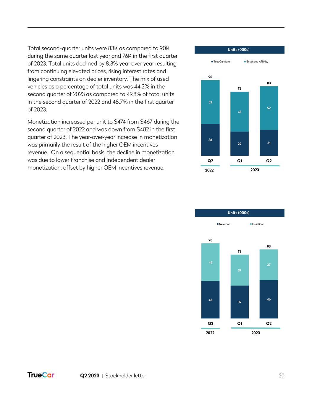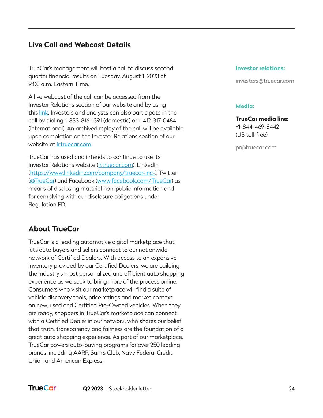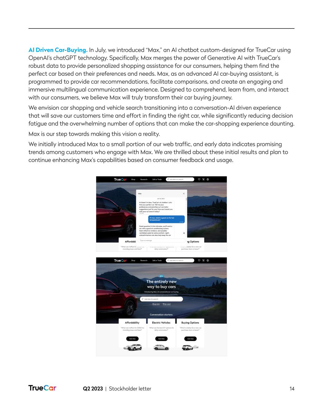 Q2 2023 | Stockholder letter 13 In April 2023, and as disclosed in our last stockholder letter, we released a buying power calculator that allows consumers to find their estimated buying power based on their maximum desired down payment, desired monthly payment and user-volunteered credit score. Since the release, approximately 5,000 consumers per day have interacted with this tool, and approximately 30% are self-identifying as having either poor or fair credit scores. This audience is the focus of our new economic cohort experience flow, which we are seeking to launch in September 2023. Convenience Buyers. We define this cohort as consumers with a high credit score (750 or above) and who can be more selective in the car-buying process and want the overall experience to be easy, fast and streamlined. Our vision is to serve these high credit score shoppers in a compelling way by optimizing their dealer and lender experiences. Within our platform, we envision that the first step of this cohort’s journey will be the ability to walk through a simple, guided flow that matches their preferences to vehicles in as few steps as possible. Our platform will offer these consumers a vast dealer inventory and comparability between makes, models and payment options, as well as transactable pricing and fee transparency. Once a specific vehicle is selected, these shoppers will be offered competitive rates from a limited set of reputable lenders targeted at these credit profiles, allowing for ease of comparability and convenience. This cohort will also seek to add accessories and protection products in an easy convenient way, which is something we have already tested and proven in our current flow with what we believe is the most comprehensive nationwide accessories selection of any online automotive marketplace. We expect that our dealer network will benefit from this cohort experience as they’ll have access to a large, high credit worthy consumer base, high sales volume opportunity, attractive margin per vehicle that can include accessories and protection products, intact financing fees, access to nationwide online sales without any of the infrastructure costs, and acceleration in inventory turnover. We are targeting to release the convenience cohort experience in October 2023. EV Buyers. As the name implies, this consumer base is primarily interested in electric vehicles. We are striving to provide an experience that includes: (1) easy discovery; (2) comparability of features like battery life and range across EVs; (3) comparability between EVs and internal combustion engine (ICE) vehicles; and (4) all the features and functionalities provided to the convenience buyers. With more than 50% of the nationwide supply of EVs, excluding Tesla, in stock and available on TrueCar, we offer these EV buyers both convenience and selection. For our dealer network, we offer a unique EV focused sales channel and all the benefits of those dealers within the convenience buyers cohort. Our goal is to launch the EV experience in November 2023. To further underscore our strength in EV, in Q2 2023, we activated two Mercedes-Benz (MBUSA) incentive offers on Sam’s Club and American Express. As part of this promotion, we worked with MBUSA to place vehicles within several Sam’s Club locations to raise further awareness and consideration of their vehicles, with a focus on their EVs. Of the total MBUSA sales that were driven by our affinity partners, over 50% of these sales were EVs. The response to this promotion to date has exceeded MBUSA’s and our expectations and speaks to the power of our Affinity Partner network.