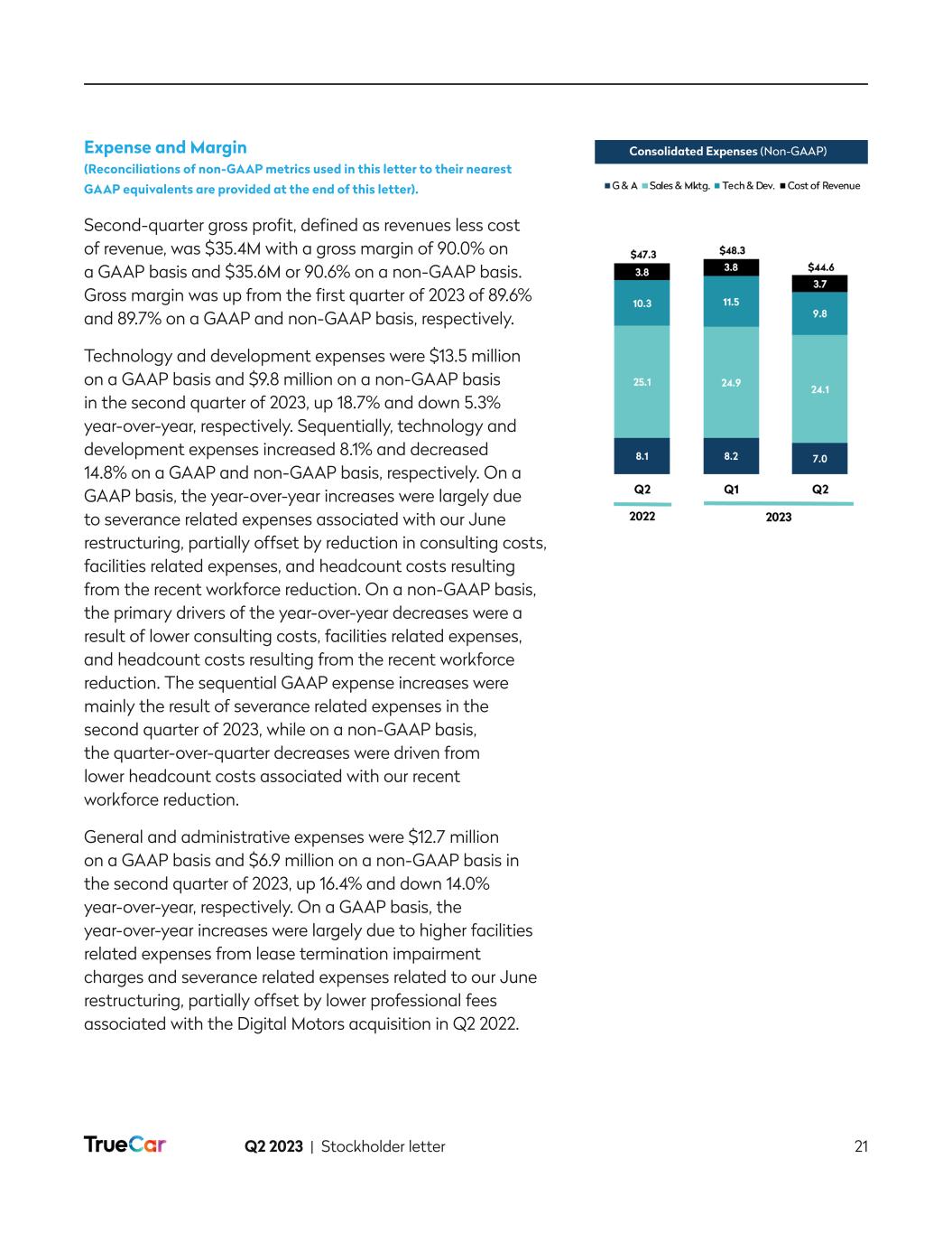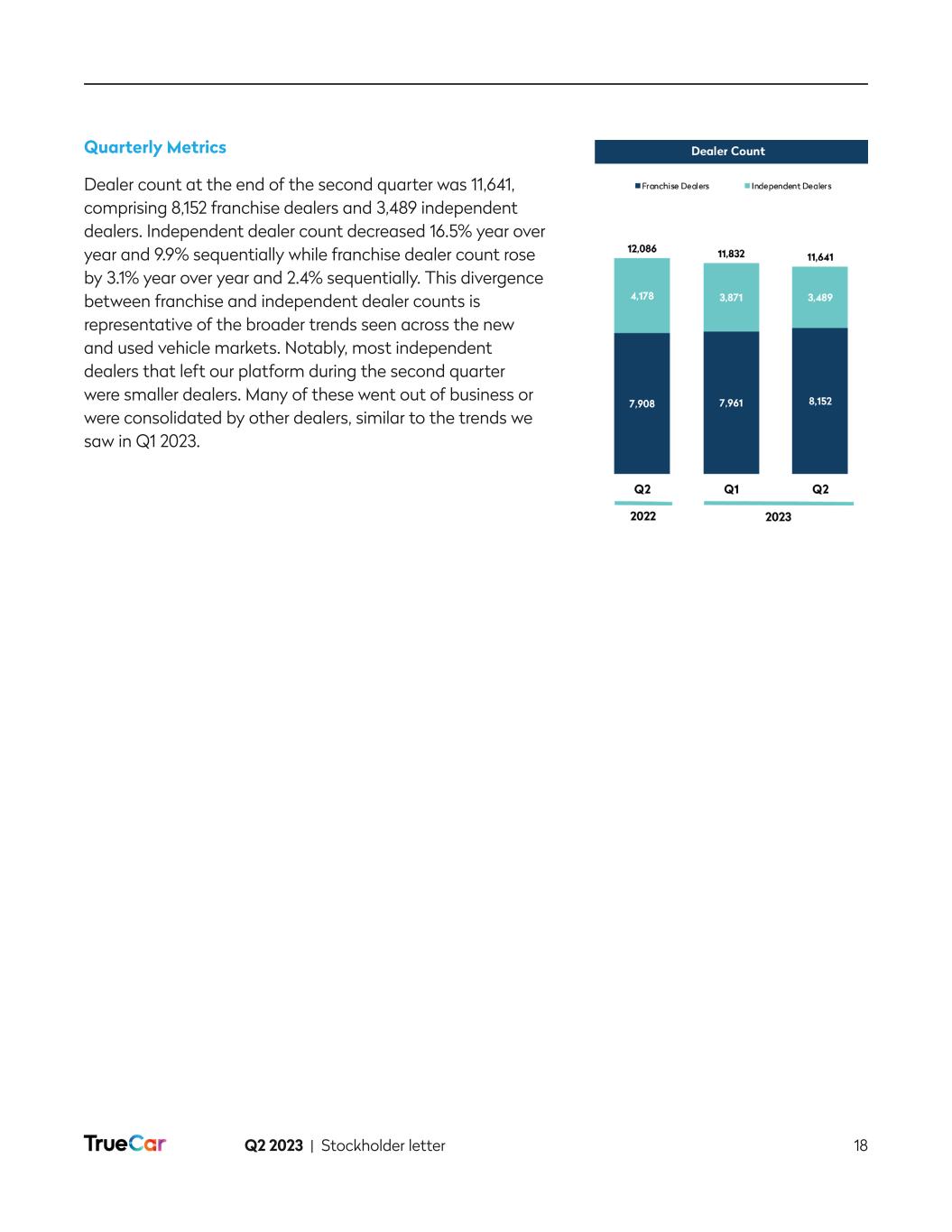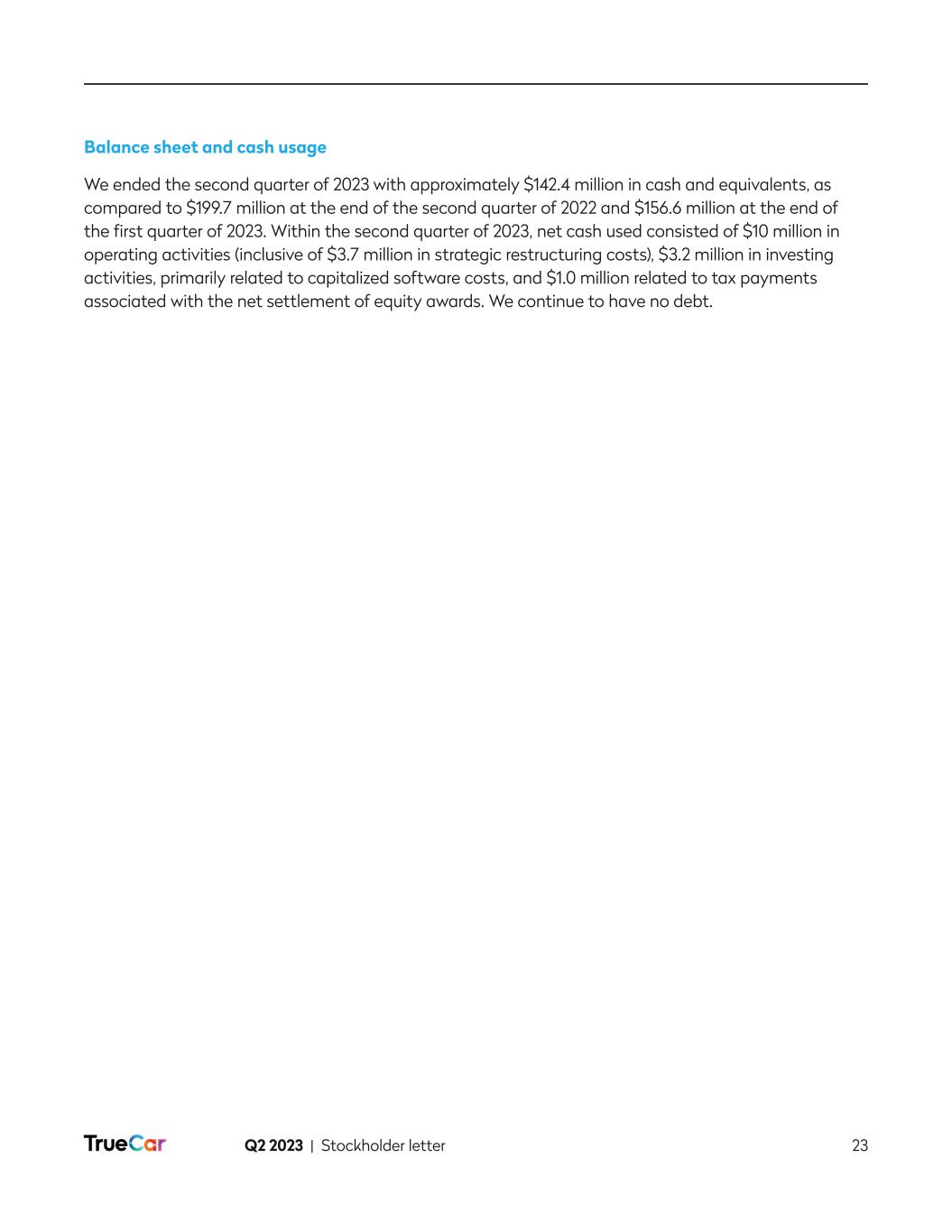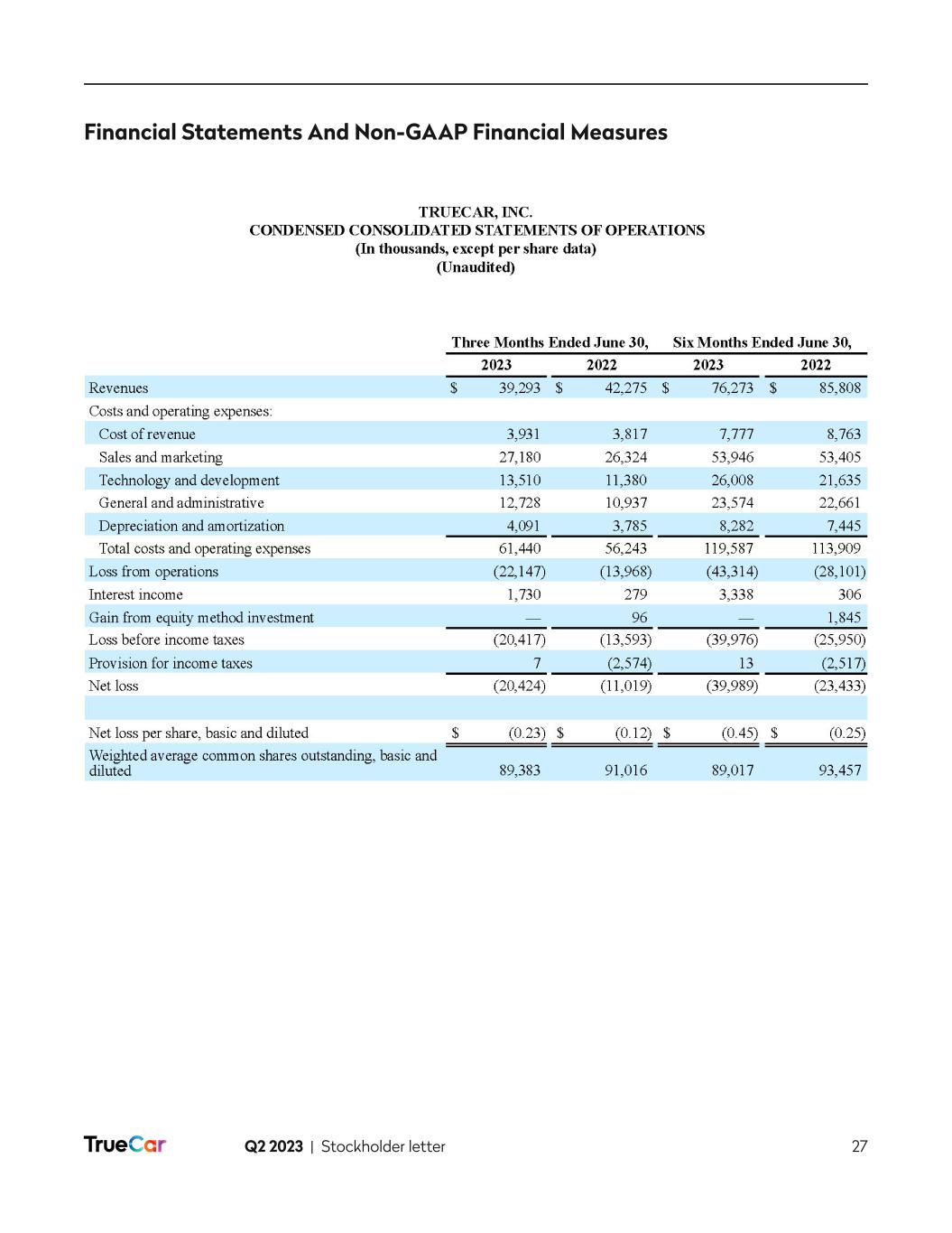 Q2 2023 | Stockholder letter 13 In April 2023, and as disclosed in our last stockholder letter, we released a buying power calculator that allows consumers to find their estimated buying power based on their maximum desired down payment, desired monthly payment and user-volunteered credit score. Since the release, approximately 5,000 consumers per day have interacted with this tool, and approximately 30% are self-identifying as having either poor or fair credit scores. This audience is the focus of our new economic cohort experience flow, which we are seeking to launch in September 2023. Convenience Buyers. We define this cohort as consumers with a high credit score (750 or above) and who can be more selective in the car-buying process and want the overall experience to be easy, fast and streamlined. Our vision is to serve these high credit score shoppers in a compelling way by optimizing their dealer and lender experiences. Within our platform, we envision that the first step of this cohort’s journey will be the ability to walk through a simple, guided flow that matches their preferences to vehicles in as few steps as possible. Our platform will offer these consumers a vast dealer inventory and comparability between makes, models and payment options, as well as transactable pricing and fee transparency. Once a specific vehicle is selected, these shoppers will be offered competitive rates from a limited set of reputable lenders targeted at these credit profiles, allowing for ease of comparability and convenience. This cohort will also seek to add accessories and protection products in an easy convenient way, which is something we have already tested and proven in our current flow with what we believe is the most comprehensive nationwide accessories selection of any online automotive marketplace. We expect that our dealer network will benefit from this cohort experience as they’ll have access to a large, high credit worthy consumer base, high sales volume opportunity, attractive margin per vehicle that can include accessories and protection products, intact financing fees, access to nationwide online sales without any of the infrastructure costs, and acceleration in inventory turnover. We are targeting to release the convenience cohort experience in October 2023. EV Buyers. As the name implies, this consumer base is primarily interested in electric vehicles. We are striving to provide an experience that includes: (1) easy discovery; (2) comparability of features like battery life and range across EVs; (3) comparability between EVs and internal combustion engine (ICE) vehicles; and (4) all the features and functionalities provided to the convenience buyers. With more than 50% of the nationwide supply of EVs, excluding Tesla, in stock and available on TrueCar, we offer these EV buyers both convenience and selection. For our dealer network, we offer a unique EV focused sales channel and all the benefits of those dealers within the convenience buyers cohort. Our goal is to launch the EV experience in November 2023. To further underscore our strength in EV, in Q2 2023, we activated two Mercedes-Benz (MBUSA) incentive offers on Sam’s Club and American Express. As part of this promotion, we worked with MBUSA to place vehicles within several Sam’s Club locations to raise further awareness and consideration of their vehicles, with a focus on their EVs. Of the total MBUSA sales that were driven by our affinity partners, over 50% of these sales were EVs. The response to this promotion to date has exceeded MBUSA’s and our expectations and speaks to the power of our Affinity Partner network.