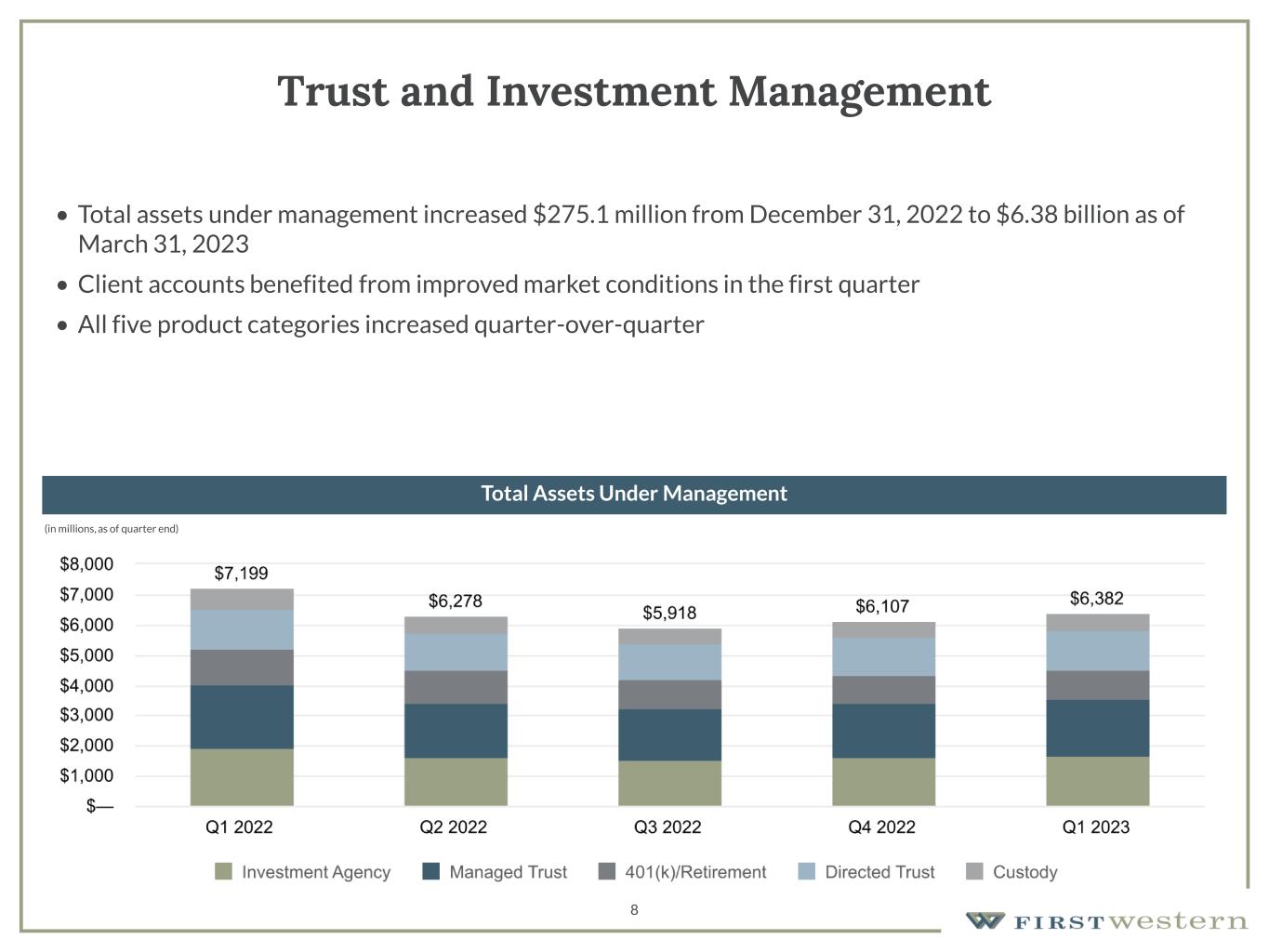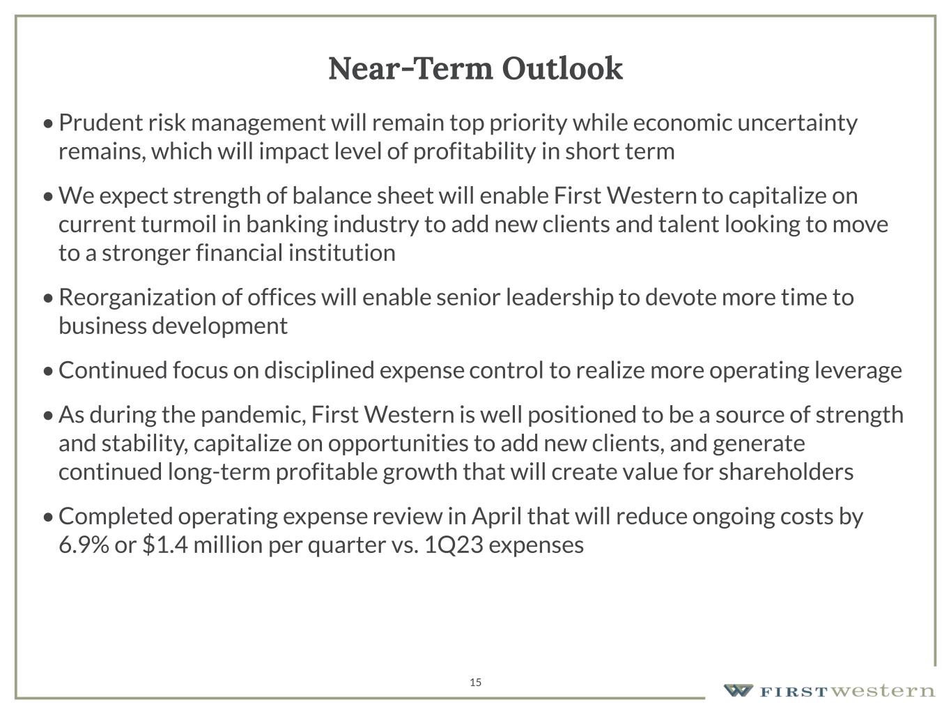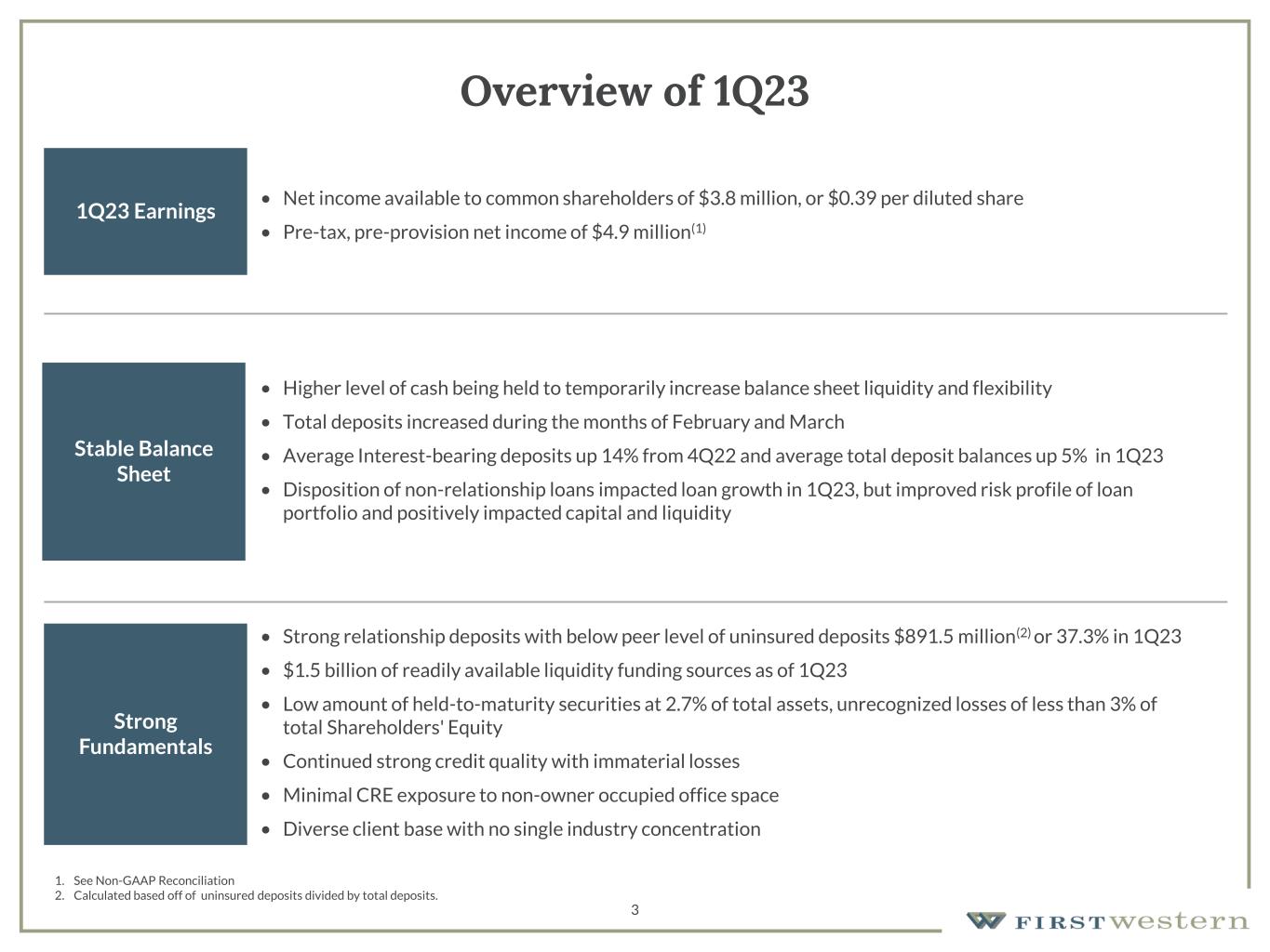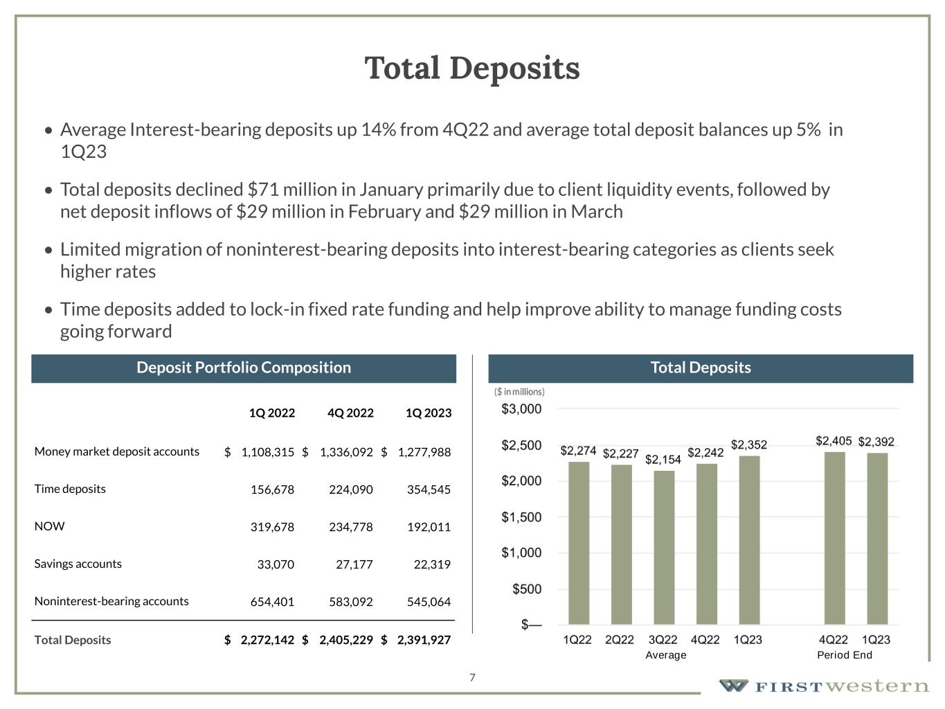 Scott C. Wylie, CEO of First Western, commented, “First Western continues to be a source of stability and strength for our clients, as we have throughout our history. As part of our prudent approach to risk management, we have built a highly diversified client base with no meaningful concentrations in any particular industry or asset class. Our diversified and granular deposit base has helped us to avoid the concentration risk that has led to the recent troubles seen at other banks, and during the month of March, we had an increase in total deposits.