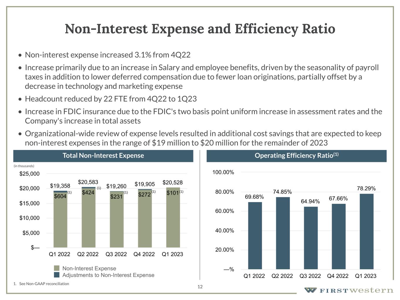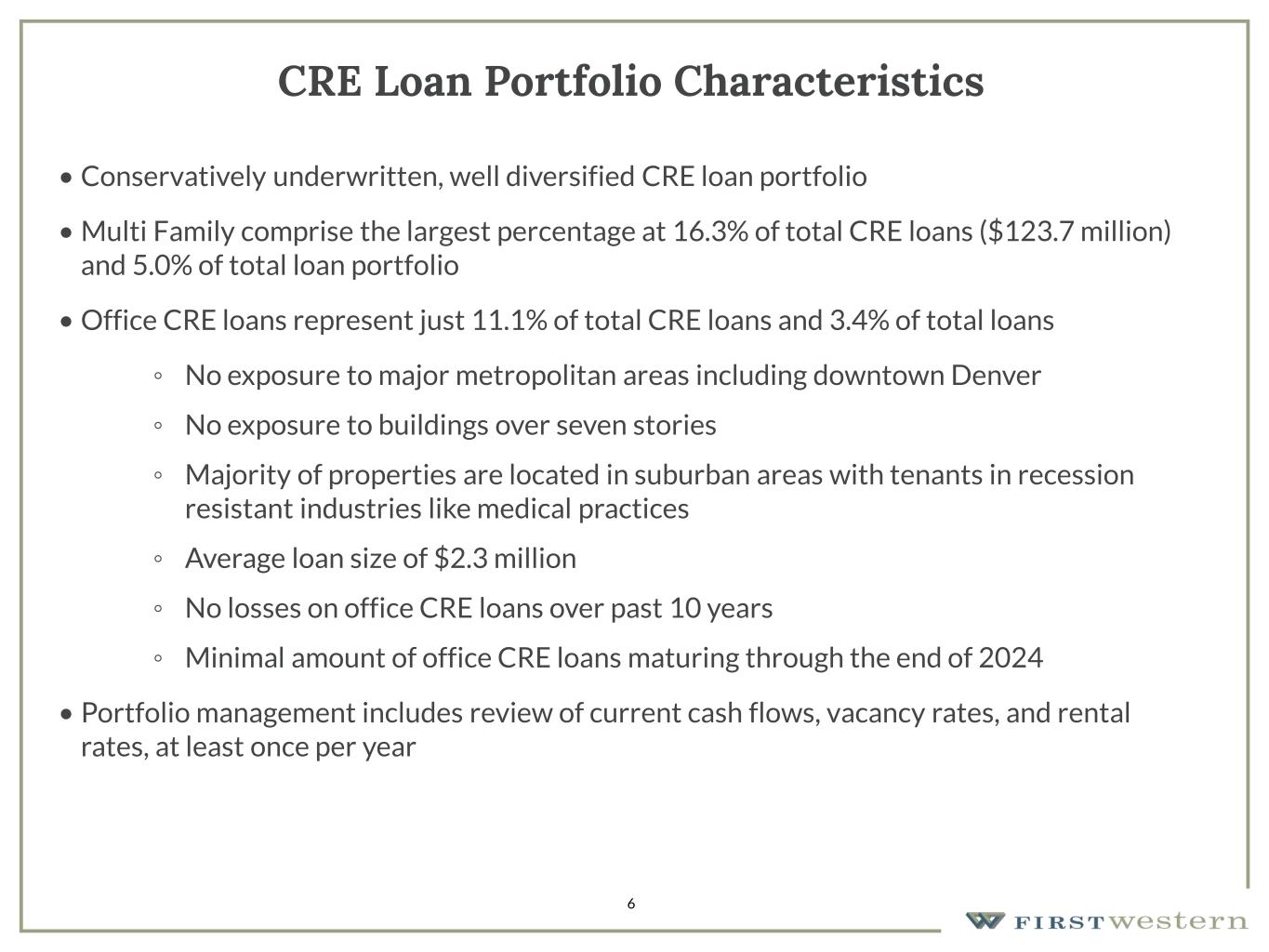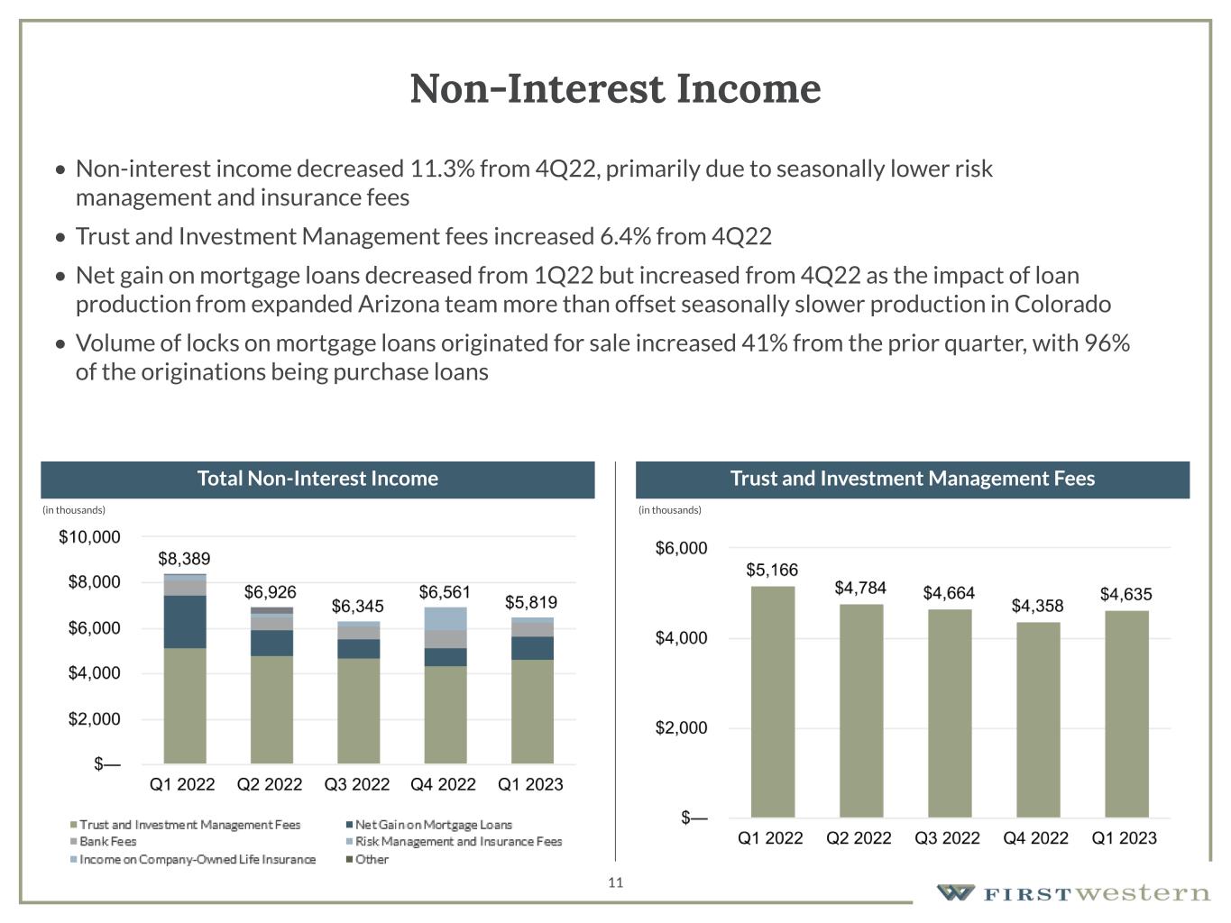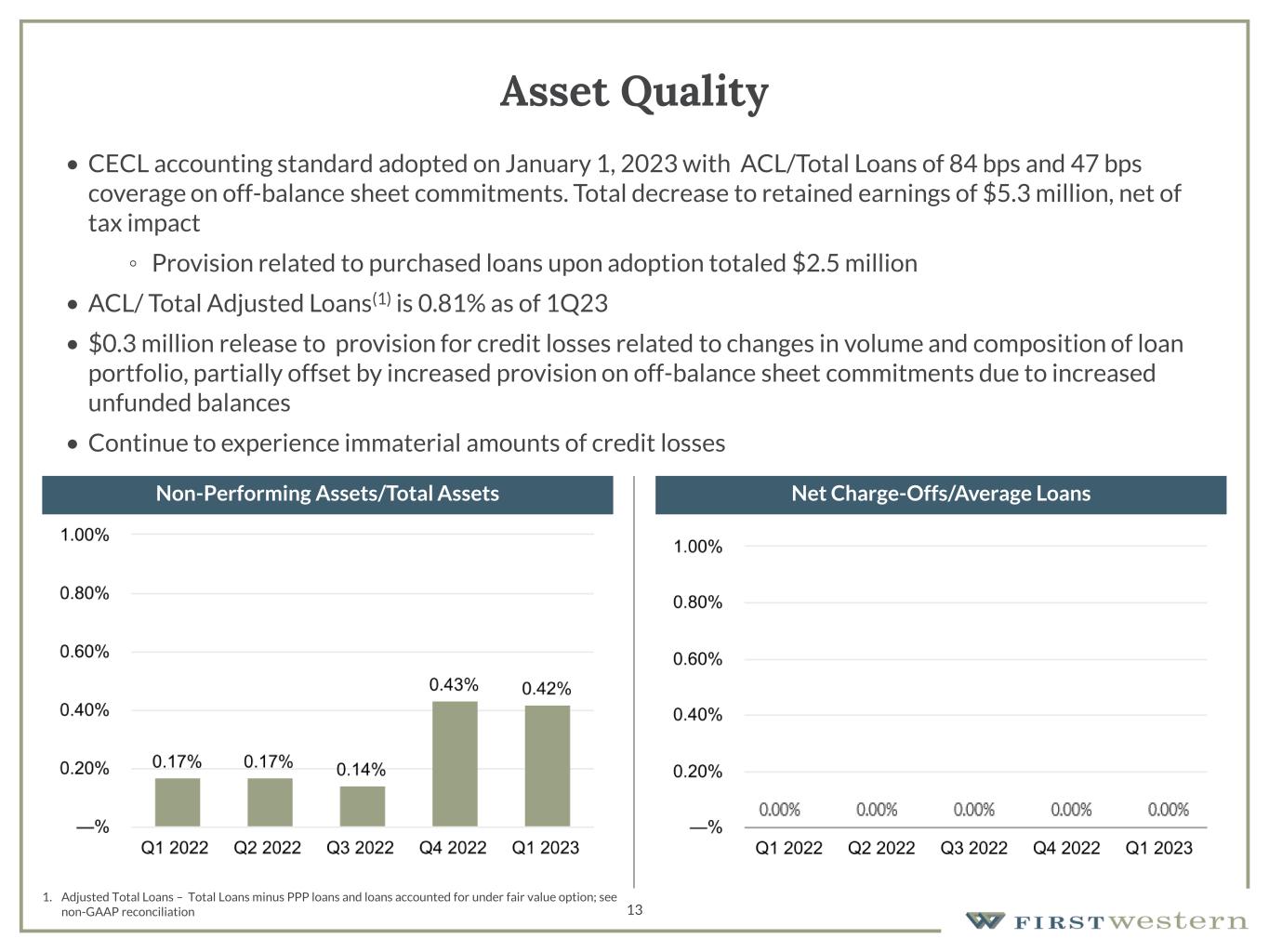 Scott C. Wylie, CEO of First Western, commented, “First Western continues to be a source of stability and strength for our clients, as we have throughout our history. As part of our prudent approach to risk management, we have built a highly diversified client base with no meaningful concentrations in any particular industry or asset class. Our diversified and granular deposit base has helped us to avoid the concentration risk that has led to the recent troubles seen at other banks, and during the month of March, we had an increase in total deposits.
