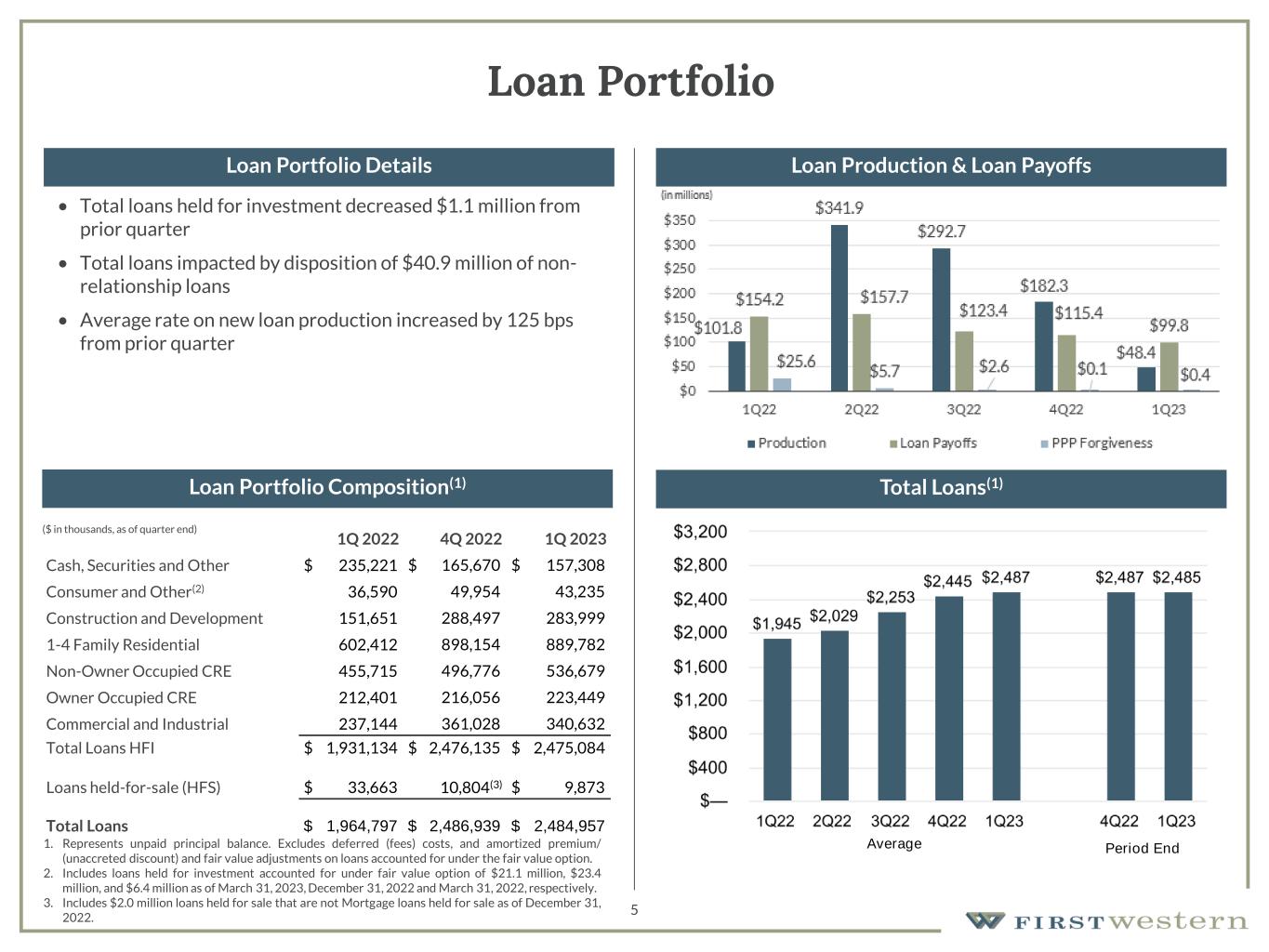 •Total deposits decreased slightly to $2.39 billion, or 0.6%, from $2.41 billion as of Q4 2022, and were up 5.3% from $2.27 billion as of Q1 2022