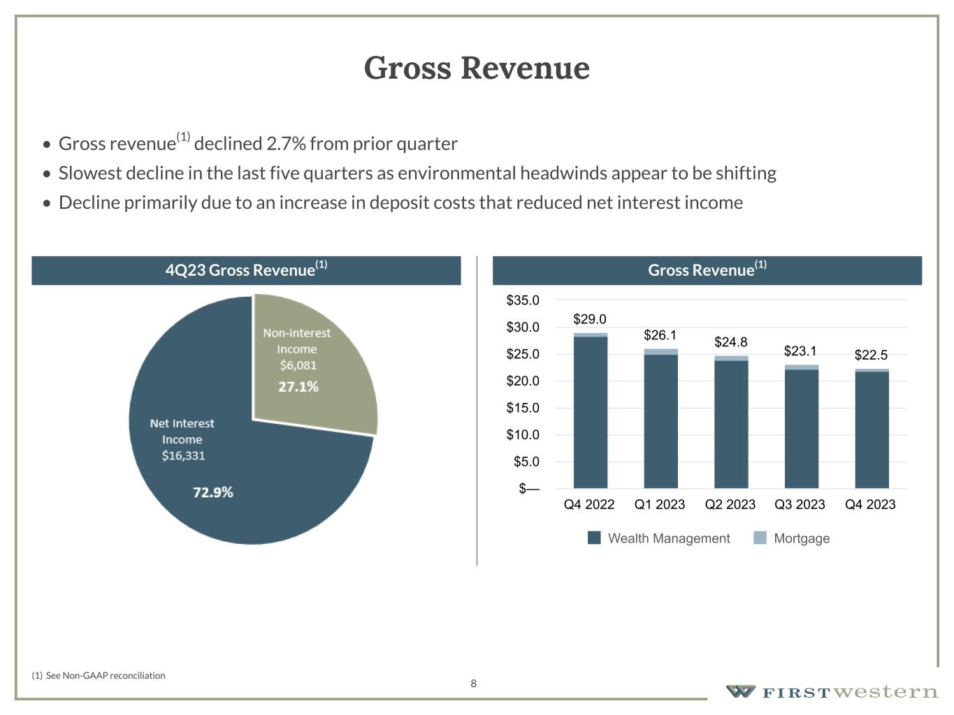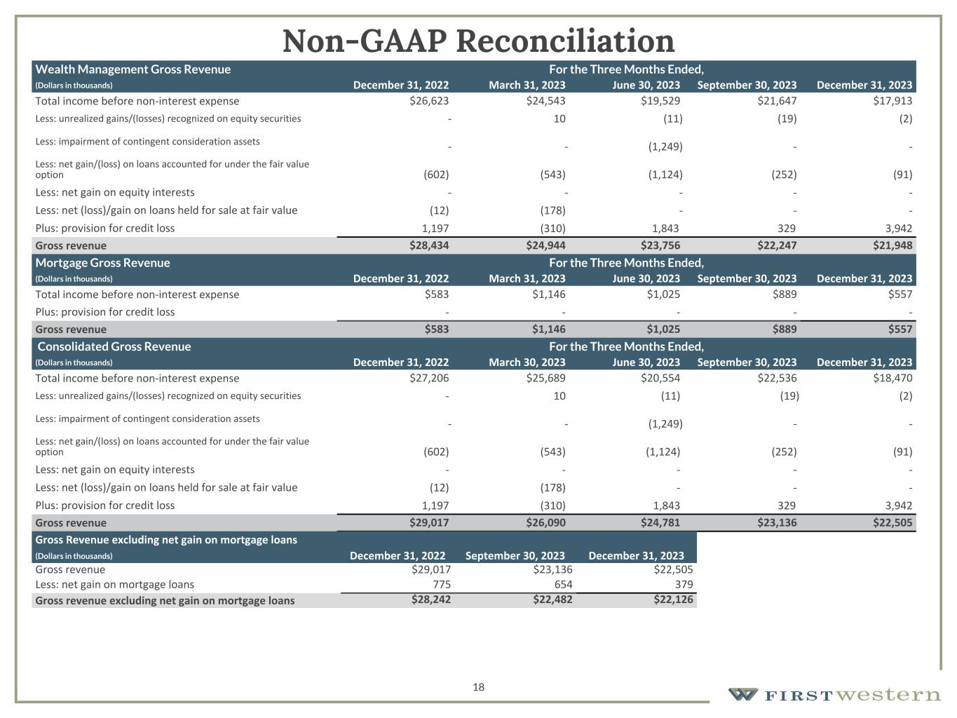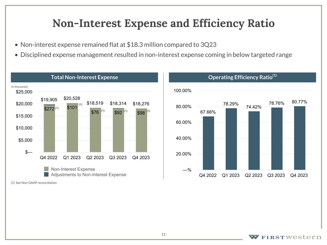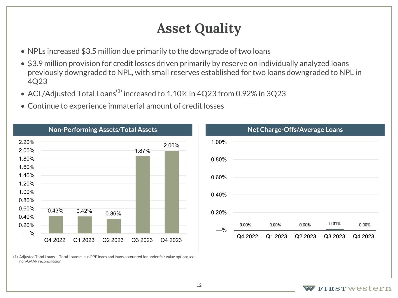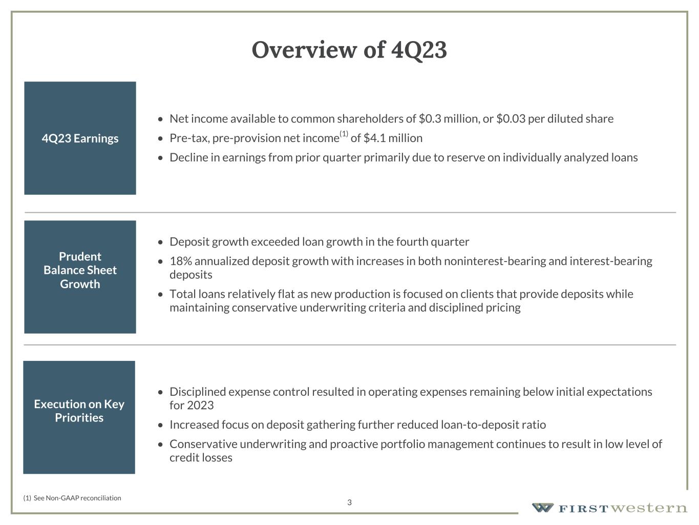 Scott C. Wylie, CEO of First Western, commented, "While an increase in our estimated provision for credit losses reduced our profitability in the fourth quarter, we continued to execute on our strategic priorities including maintaining disciplined expense control while adding new deposit relationships. Our deposit focus resulted in 18% annualized growth in total deposits during the quarter and further reduced our loan-to-deposit ratio to be in-line with our year-end goal of 100%, while our new loan production focused on clients that also bring deposits to the bank.