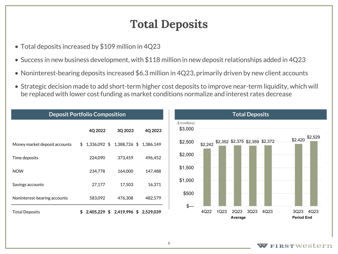 •Total deposits increased to $2.53 billion, or 4.5%, from $2.42 billion as of Q3 2023