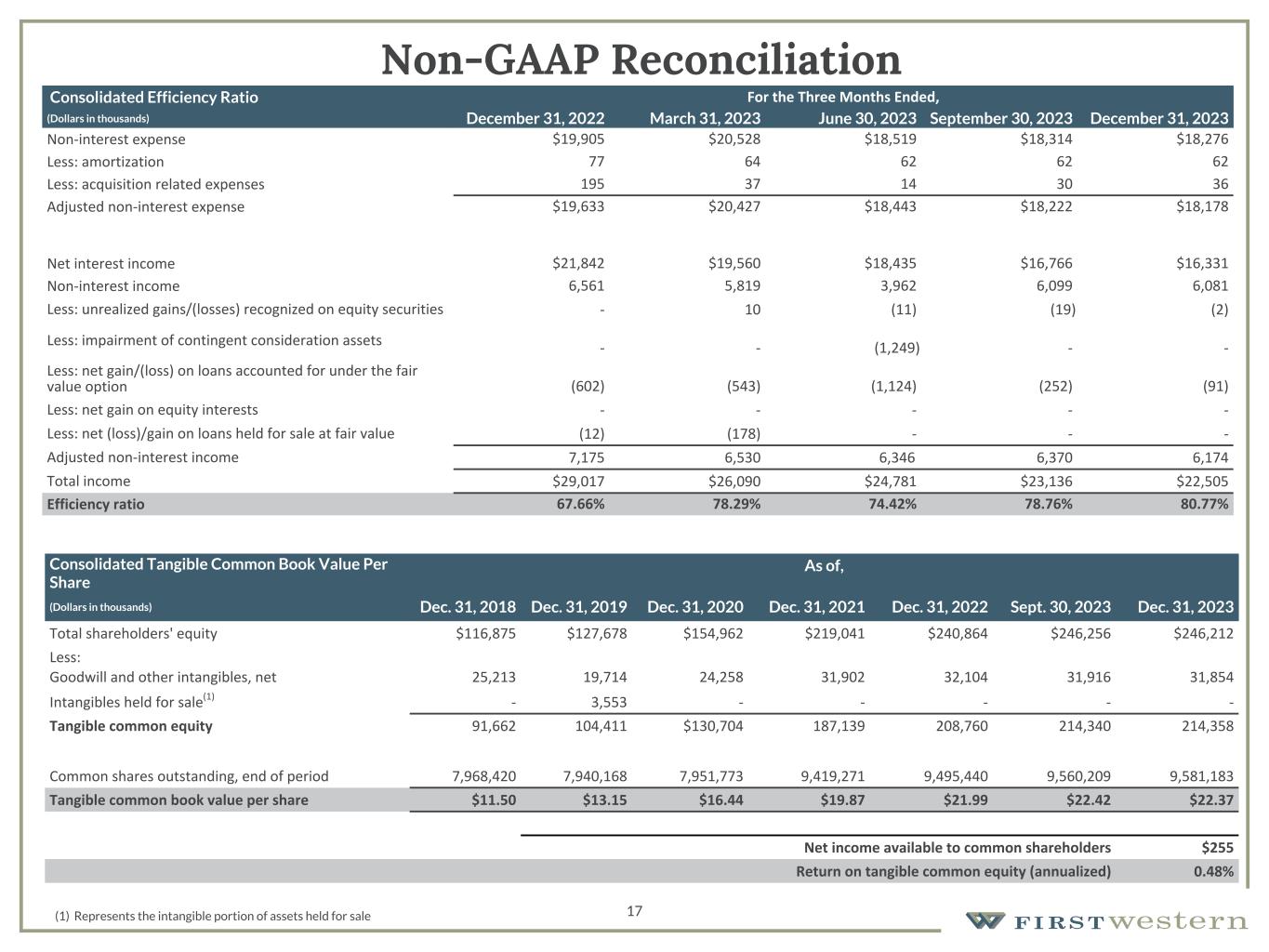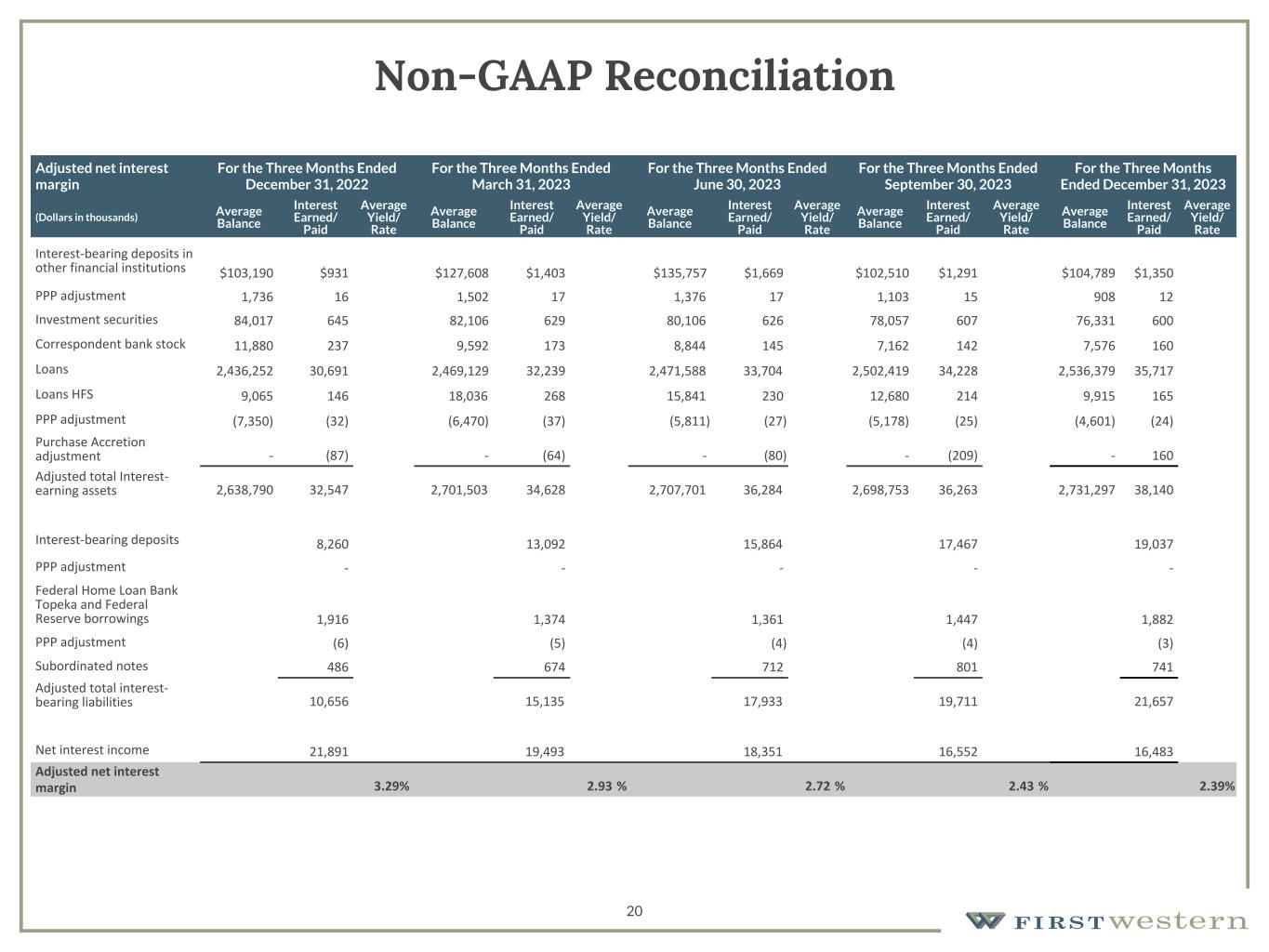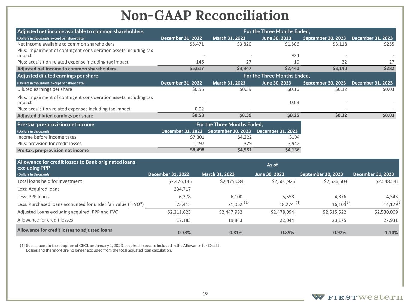 (3)As of December 31, 2023 and September 30, 2023, the adjustment for PPP loans includes acquired PPP loans as acquired loans are included in total loans held for investment as a result of the adoption of ASC 326. As of December 31, 2022, the adjustment for PPP loans did not include acquired PPP loans, as those were already included in the loans acquired adjustment.
