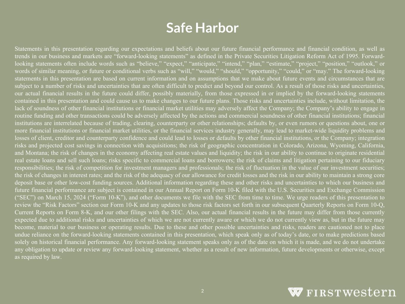 コロラド州デンバー、2024年7月23日 - ファースト・ウェスタン・ファイナンシャル・インク(以下「ファースト・ウェスタン」または「当社」)(NASDAQ:MYFW)は本日、2024年6月30日に終了した第2四半期の決算を発表しました。