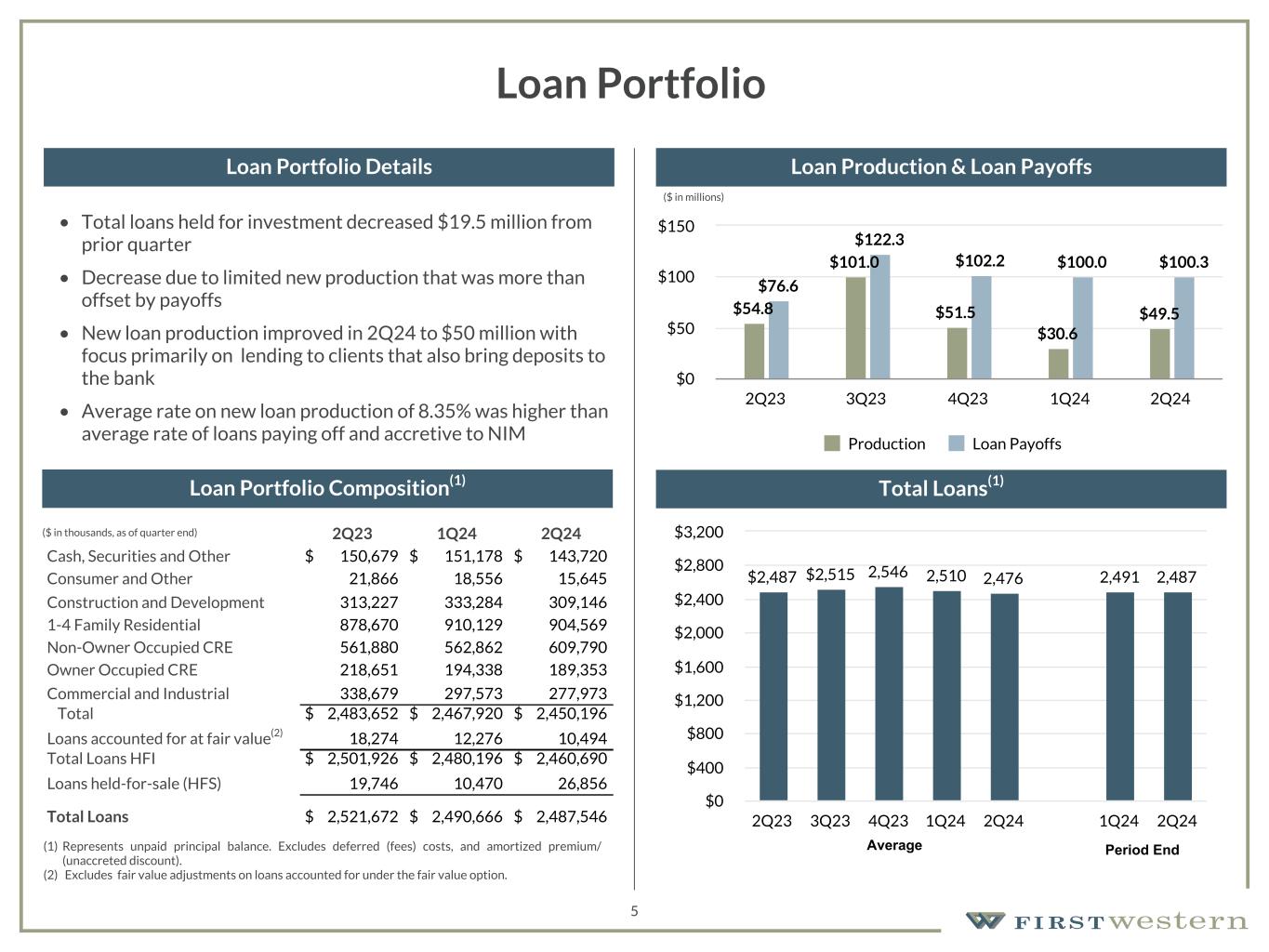 2024年6月30日現在の投資用貸出金総額は24.6億ドルで、2024年3月31日現在の24.8億ドルから0.8%減少した。この減少は、建設、現金、有価証券、その他、商業・工業用ポートフォリ オの純減によるもので、商業用不動産ポートフォリオの純増により一部相殺された。2023年第2四半期との比較では、投資目的で保有する貸出金総額は前年同期比1.6%減少し、2023年6月30日現在では25億ドルとなりました。