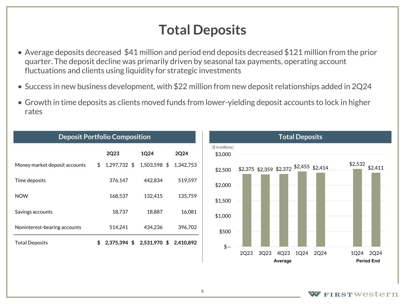 預金総額は2024年3月31日現在の25億3,000万ドルに対し、2024年6月30日現在では24億1,000万ドルであった。これは主に、季節的な納税、営業勘定の変動、および顧客が戦略的投資に流動性を使用したことによるものである。2023年第2四半期との比較では、預金総額は2023年6月30日時点の23億8,000万ドルから増加しましたが、これは主に預金関係の新規および拡大による有利子預金によるものです。