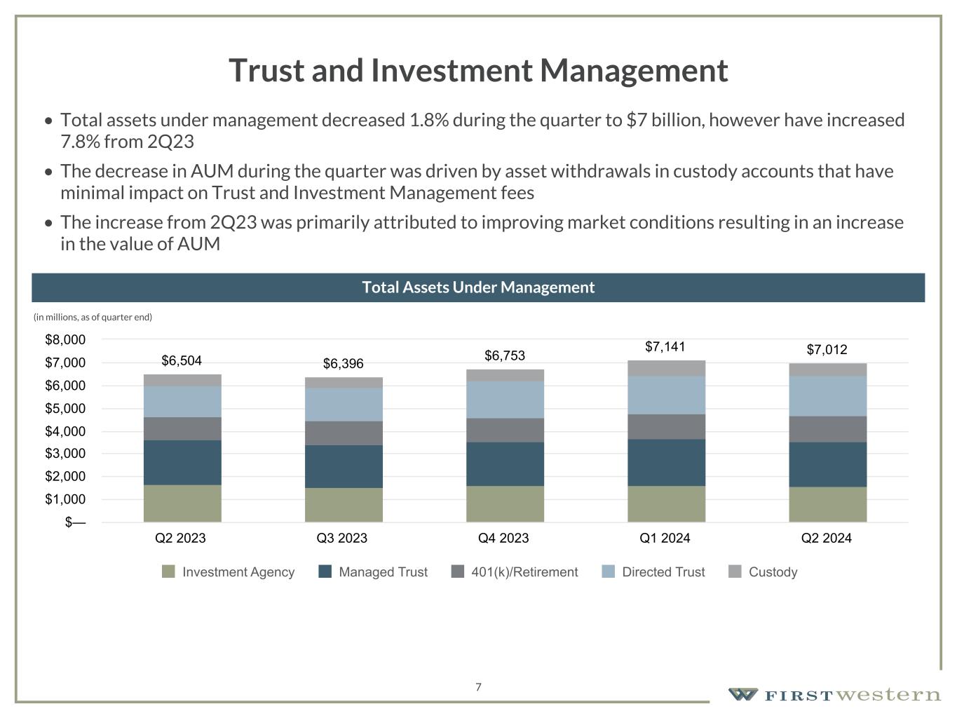 第 2 四半期の運用資産残高(AUM)は、2024 年 3 月 31 日現在の 71.4 億ドルから 2024 年 6 月 30 日現在 70.1 億ドルに減少しました。当四半期のAUM減少は、信託報酬および資産運用報酬にほとんど影響を与えないカストディ口座の資産引き出しによるものです。AUM総額は2023年6月30日時点の65.0億ドルから0.51万ドル増加したが、これは主に前年同期比で市況が改善し、AUMの価値が増加したことによるものである。