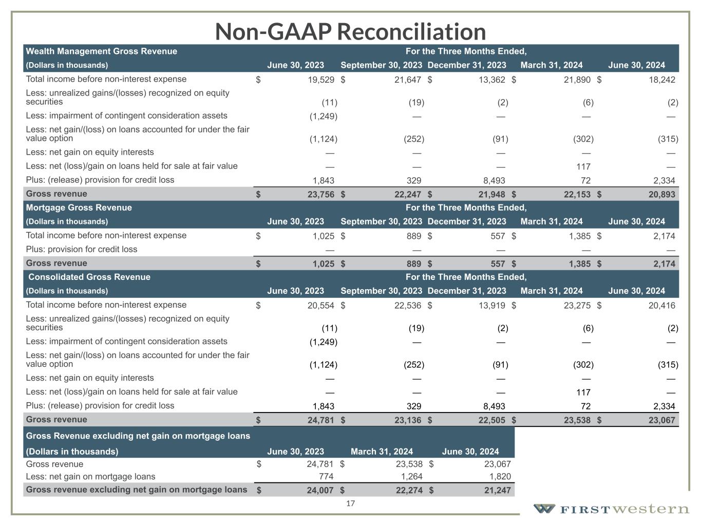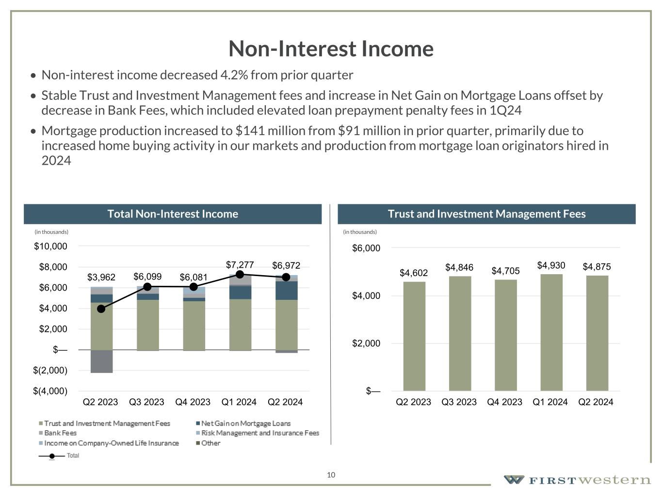 2024 年第 2 四半期の非金利費用控除前利益合計は、2024 年第 1 四半期の 2,330 万ドルに対し、2,040 万ドルであった。総収益(1) は、2024 年第 1 四半期の 2,350 万ドルに対し、2024 年第 2 四半期は 2,310 万ドルでした。非金利費用前利益合計の減少は、主に貸倒引当金繰入額の増加によるものです。2023 年第 2 四半期との比較では、無利息費用調整前利益は 2,060 万ドルから 0.7%減少しました。総収益は、2023 年第 2 四半期の 2,480 万ドルから 6.9%減少しました。これは、預金コスト増加による支払利息増加の結果、正味受取利息が減少したことによるもので、受取 利息および住宅ローン純益の増加により一部相殺されました。