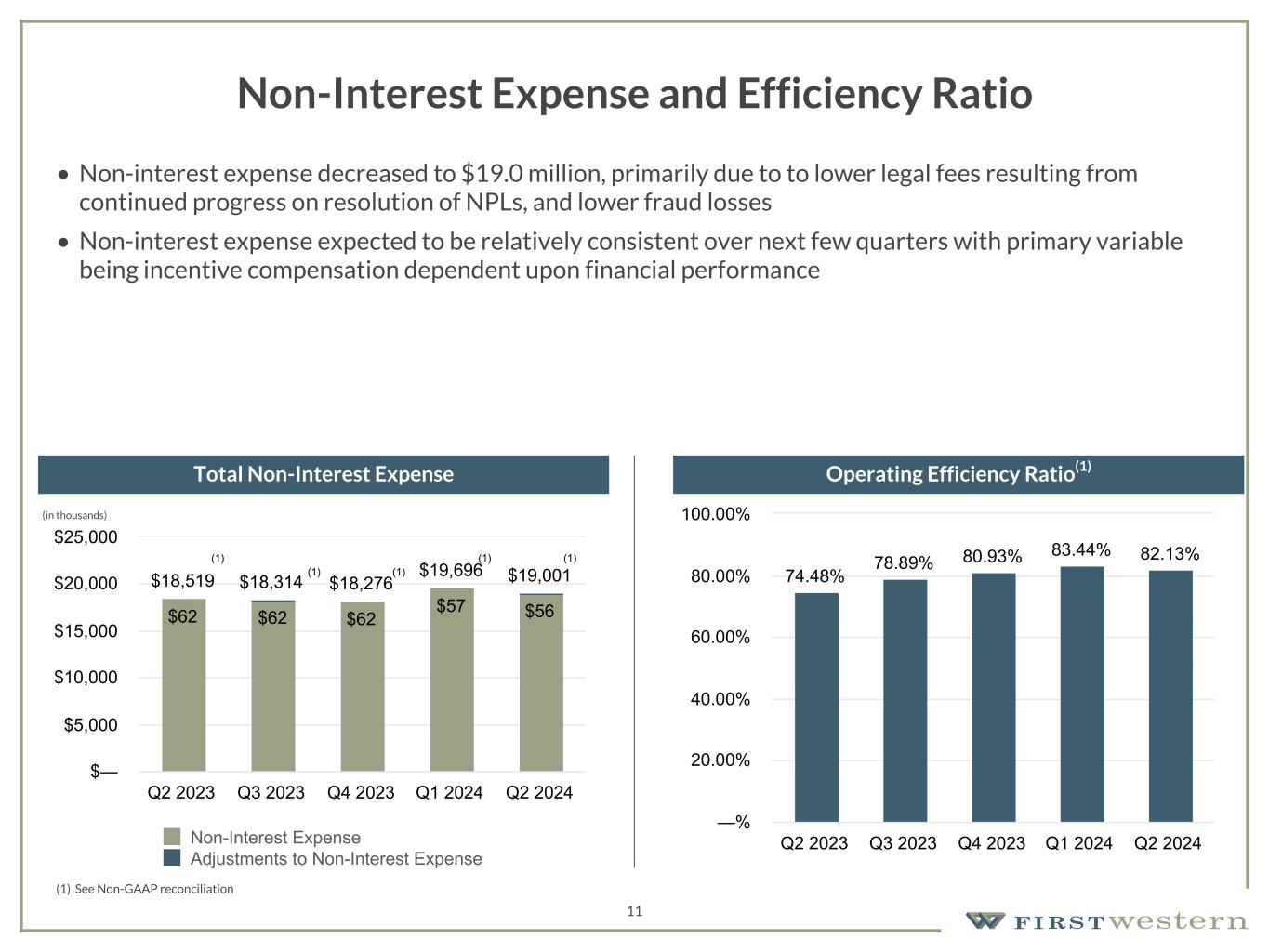 2024 年第 2 四半期の非金利費用は、前年同期の 1,970 万ドルに対し、1,900 万ドルとなった。これは、弁護士費用および不正行為による損失が減少したことによるものである。