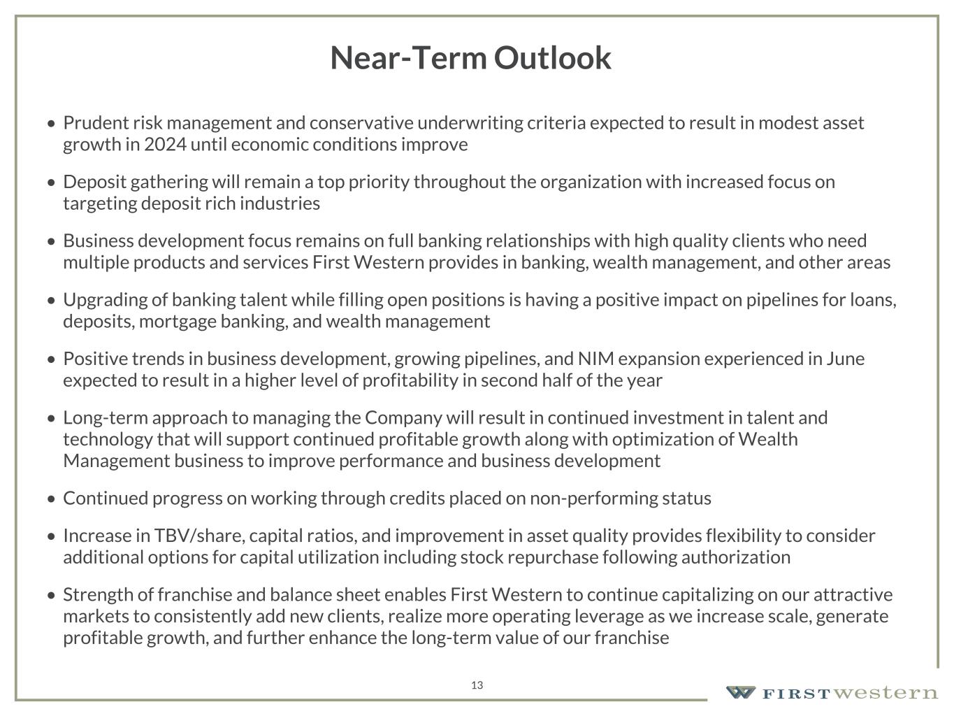 ファースト・ウェスタンのスコット・C・ワイリー最高経営責任者(CEO)は次のようにコメントした。「第2四半期も引き続き慎重なリスク管理を優先し、新規貸出を控えめに行った結果、当四半期のバランスシートは比較的横ばいで推移しました。また、規律ある経費管理の維持、新規預金取引の増加、ウェルス・マネジメント事業とモーゲージ・バンキング事業からの非金利収益の好調な寄与など、戦略的優先事項の実行も引き続き順調に進み、慎重なバランスシート管理と相まって、1株当たり有形簿価はさらに上昇しました。当四半期の業績は、6 月の貸出残高と預金残高がともに増加し、純利鞘も拡大したことから、好調に推移しました。