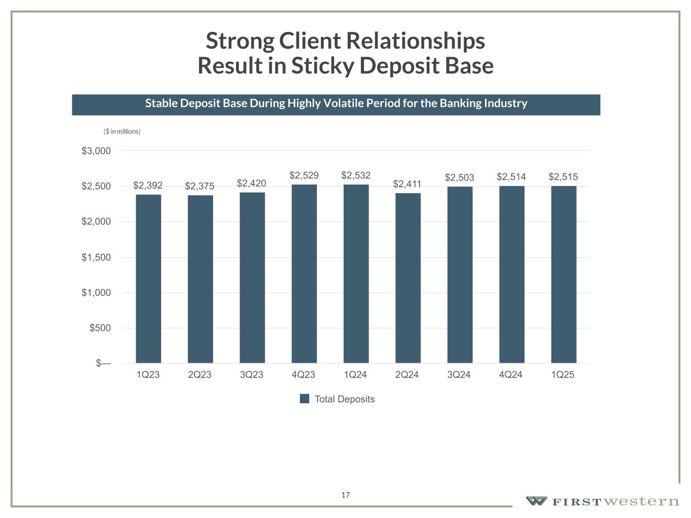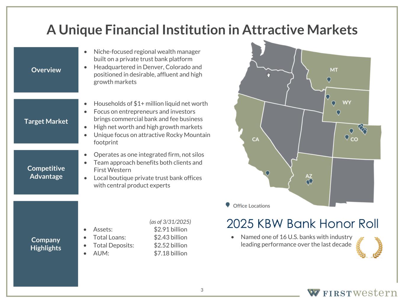 Safe Harbor 2 This presentation contains “forward-looking statements” within the meaning of Section 27A of the Securities Act of 1933, as amended, and Section 21E of the Securities Exchange Act of 1934, as amended. These forward-looking statements reflect the current views of First Western Financial, Inc.’s (“First Western”) management with respect to, among other things, future events and First Western’s financial performance. These statements are often, but not always, made through the use of words or phrases such as “may,” “should,” “could,” “predict,” “potential,” “believe,” “will likely result,” “expect,” “continue,” “will,” “anticipate,” “seek,” “estimate,” “intend,” “plan,” “position,” “project,” “future” “forecast,” “goal,” “target,” “would” and “outlook,” or the negative variations of those words or other comparable words of a future or forward-looking nature. These forward-looking statements are not historical facts, and are based on current expectations, estimates and projections about First Western’s industry, management’s beliefs and certain assumptions made by management, many of which, by their nature, are inherently uncertain and beyond First Western’s control. Accordingly, First Western cautions you that any such forward-looking statements are not guarantees of future performance and are subject to risks, assumptions and uncertainties that are difficult to predict. Although First Western believes that the expectations reflected in these forward-looking statements are reasonable as of the date made, actual results may prove to be materially different from the results expressed or implied by the forward-looking statements. The following risks and uncertainties, among others, could cause actual results and future events to differ materially from those set forth or contemplated in the forward-looking statements: the risk of geographic concentration in Colorado, Arizona, Wyoming, California, and Montana; the risk of changes in the economy affecting real estate values and liquidity; the risk in our ability to continue to originate residential real estate loans and sell such loans; risks specific to commercial loans and borrowers; the risk of claims and litigation pertaining to our fiduciary responsibilities; the risk of changes in interest rates could reduce our net interest margins and net interest income; increased credit risk, including as a result of deterioration in economic conditions, could require us to increase our allowance for credit losses and could have a material adverse effect on our results of operations and financial condition; the risk in our ability to maintain a strong core deposit base or other low-cost funding sources. Additional information regarding these and other risks and uncertainties to which our business and future financial performance are subject is contained in our Annual Report on Form 10-K filed with the U.S. Securities and Exchange Commission (“SEC”) on March 7, 2025 and other documents we file with the SEC from time to time. All subsequent written and oral forward-looking statements attributable to First Western or persons acting on First Western’s behalf are expressly qualified in their entirety by this paragraph. Forward-looking statements speak only as of the date of this presentation. First Western undertakes no obligation to publicly update or otherwise revise any forward-looking statements, whether as a result of new information, future events or otherwise (except as required by law). Certain of the information contained herein may be derived from information provided by industry sources. The Company believes that such information is accurate and the sources from which it has been obtained are reliable; however, the Company cannot guaranty the accuracy of such information and has not independently verified such information. This presentation contains certain non-GAAP financial measures intended to supplement, not substitute for, comparable GAAP measures. Reconciliations of non-GAAP financial measures to GAAP financial measures are provided at the end of this presentation. Numbers in the presentation may not sum due to rounding. Our common stock is not a deposit or savings account. Our common stock is not insured by the Federal Deposit Insurance Corporation or any governmental agency or instrumentality. Except as otherwise indicated, this presentation speaks as of the date hereof. The delivery of this presentation shall not, under any circumstances, create any implication that there has been no change in the affairs of the Company after the date hereof.