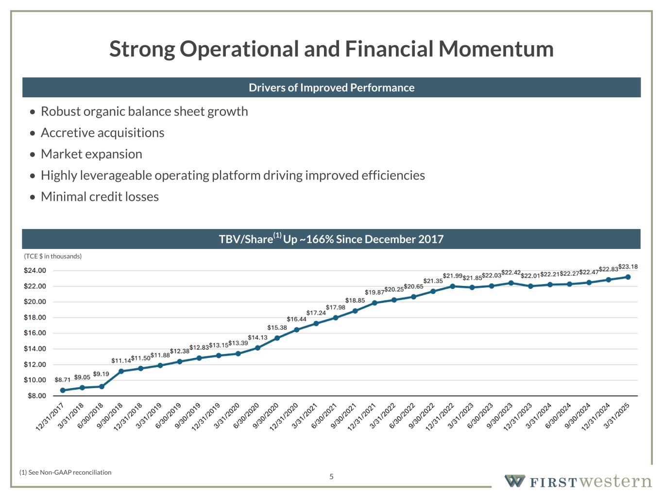 157 180 196 164 166 168 62 94 111 154 161 132 122 125 129 76 78 86 255 255 255 Chart color Table color Special Headlines Slide Headlines / Text on light background Primary Colors Secondary Colors Primary Background / Call Out Boxes / Text on dark background Chart color Table Color Tertiary Colors Chart color Table Color Chart Color Chart Color Approved Fonts AaBbCc 123 Lora (bold) Slide Headlines / Special Headlines AaBbCc 123 Lato (regular, bold, italics) Body Copy / Subheadings / Small Text Descriptions 4 Investment Highlights Successful Execution on Growth Strategies Attractive Markets and Business Model Strong Earnings Momentum • Significant revenue growth driving improved operating leverage and higher profitability since pre-IPO • TBV/share(1) increased ~152% since the IPO • Continued scale expected to drive further leverage and generate returns consistent with a high performing institution over long term • Chairman and CEO has previously built and sold three banks for substantial gains for shareholders • COO has been instrumental in building the MYFW franchise over 18 years at the institution • Highly aligned with shareholder interests as insiders own ~15.5% of total shares outstanding(2) • Discounted valuation trading at 0.93x TBV/share(3) Proven Management Team, High Insider Ownership, and Discounted Valuation • Track record of combining organic growth and market expansion with accretive acquisitions to enhance franchise value • Total assets up 178% since the IPO with substantial increases in revenue and EPS • Strengthening commercial banking platform creating more diverse loan portfolio and lower-cost deposit base • Growing institution operating in high growth markets • Attractive, stable deposit base with noninterest-bearing and money market accounts comprising 79% of total deposits as of 3/31/2025 • Conservative underwriting and affluent client base results in minimal credit losses • Client relationships deepen over time with banking, planning, trust and investment services (1) See Non-GAAP reconciliation (2) Represents beneficial ownership as defined within the April 2025 Proxy Statement (3) As of May 28, 2025