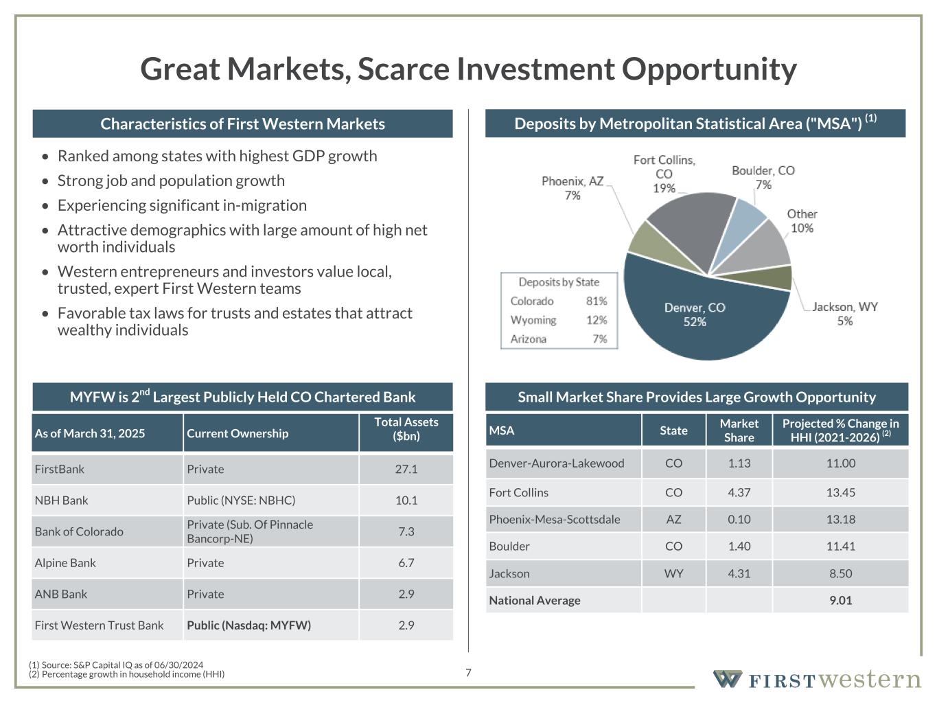 157 180 196 164 166 168 62 94 111 154 161 132 122 125 129 76 78 86 255 255 255 Chart color Table color Special Headlines Slide Headlines / Text on light background Primary Colors Secondary Colors Primary Background / Call Out Boxes / Text on dark background Chart color Table Color Tertiary Colors Chart color Table Color Chart Color Chart Color Approved Fonts AaBbCc 123 Lora (bold) Slide Headlines / Special Headlines AaBbCc 123 Lato (regular, bold, italics) Body Copy / Subheadings / Small Text Descriptions 3 A Unique Financial Institution in Attractive Markets Overview • Niche-focused regional wealth manager built on a private trust bank platform • Headquartered in Denver, Colorado and positioned in desirable, affluent and high growth markets Target Market • Households of $1+ million liquid net worth • Focus on entrepreneurs and investors brings commercial bank and fee business • High net worth and high growth markets • Unique focus on attractive Rocky Mountain footprint Company Highlights Competitive Advantage (as of 3/31/2025) • Assets: $2.91 billion • Total Loans: $2.43 billion • Total Deposits: $2.52 billion • AUM: $7.18 billion • Operates as one integrated firm, not silos • Team approach benefits both clients and First Western • Local boutique private trust bank offices with central product experts • Named one of 16 U.S. banks with industry leading performance over the last decade