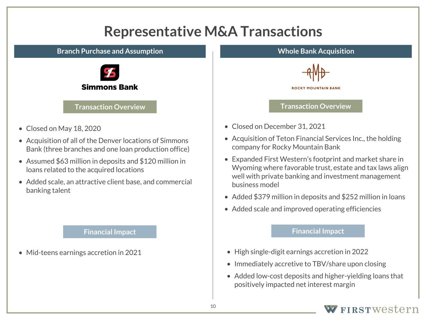 157 180 196 164 166 168 62 94 111 154 161 132 122 125 129 76 78 86 255 255 255 Chart color Table color Special Headlines Slide Headlines / Text on light background Primary Colors Secondary Colors Primary Background / Call Out Boxes / Text on dark background Chart color Table Color Tertiary Colors Chart color Table Color Chart Color Chart Color Approved Fonts AaBbCc 123 Lora (bold) Slide Headlines / Special Headlines AaBbCc 123 Lato (regular, bold, italics) Body Copy / Subheadings / Small Text Descriptions 9 Revenue Growth Strategies Expand commercial loan production platform • Upgraded C&I product and service capabilities • Building expertise in specific vertical markets • Capitalize on growing reputation to attract additional experienced commercial banking talent Expand into new markets with attractive demographics • Add infill and adjacent market locations • Built team and revenue base to open office in Broomfield, CO in 2021 • Full-service Bozeman, MT office opened in 2023 Execute on revenue initiatives in existing markets • Differentiate with local, expert, trusted teams • Cross-sell MYFW’s larger offering of planning, insurance, retirement, insurance, and investment products • Continue adding banking and B2B talent to further accelerate market share gains Execute on low- risk strategic transactions that add value to the MYFW franchise • Execute on minimally dilutive acquisitions • Leverage infrastructure through branch acquisition transactions • Proactive expansion, acquisition team