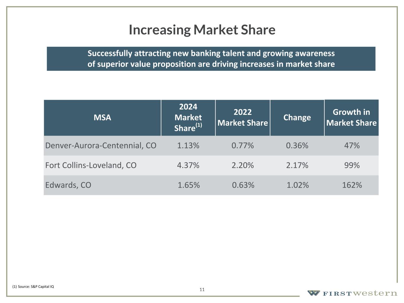 157 180 196 164 166 168 62 94 111 154 161 132 122 125 129 76 78 86 255 255 255 Chart color Table color Special Headlines Slide Headlines / Text on light background Primary Colors Secondary Colors Primary Background / Call Out Boxes / Text on dark background Chart color Table Color Tertiary Colors Chart color Table Color Chart Color Chart Color Approved Fonts AaBbCc 123 Lora (bold) Slide Headlines / Special Headlines AaBbCc 123 Lato(regular, bold, italics) Body Copy / Subheadings / Small Text Descriptions 11 Increasing Market Share Successfully attracting new banking talent and growing awareness of superior value proposition are driving increases in market share MSA 2024 Market Share(1) 2022 Market Share Change Growth in Market Share Denver-Aurora-Centennial, CO 1.13% 0.77% 0.36% 47% Fort Collins-Loveland, CO 4.37% 2.20% 2.17% 99% Edwards, CO 1.65% 0.63% 1.02% 162% (1) Source: S&P Capital IQ