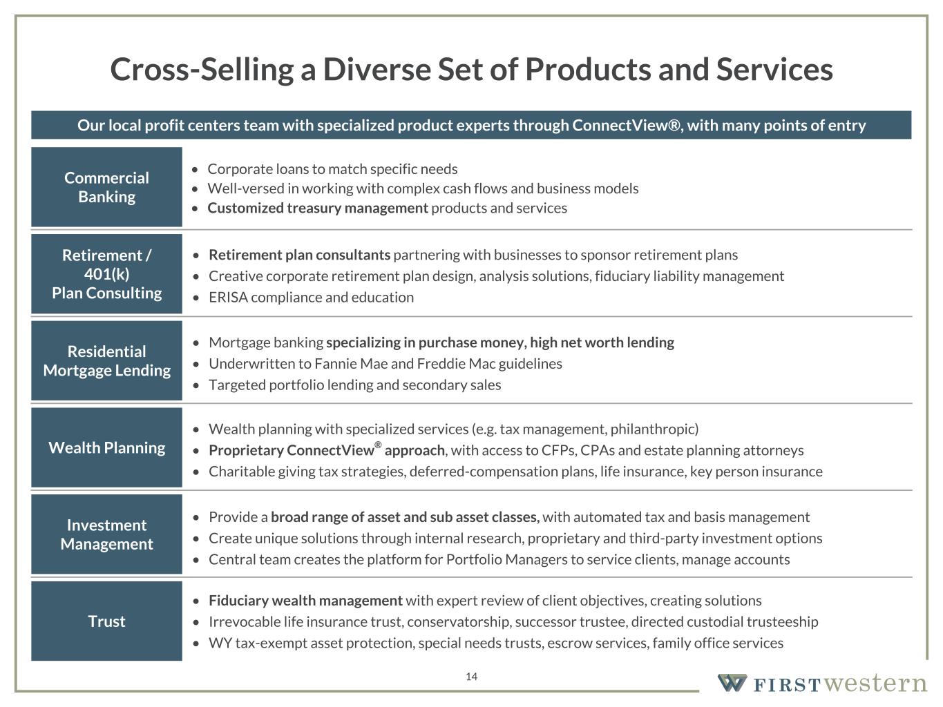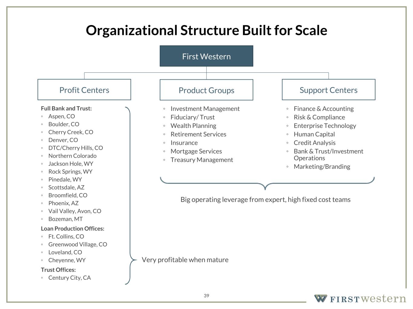 157 180 196 164 166 168 62 94 111 154 161 132 122 125 129 76 78 86 255 255 255 Chart color Table color Special Headlines Slide Headlines / Text on light background Primary Colors Secondary Colors Primary Background / Call Out Boxes / Text on dark background Chart color Table Color Tertiary Colors Chart color Table Color Chart Color Chart Color Approved Fonts AaBbCc 123 Lora (bold) Slide Headlines / Special Headlines AaBbCc 123 Lato (regular, bold, italics) Body Copy / Subheadings / Small Text Descriptions 39 Organizational Structure Built for Scale Full Bank and Trust: ◦ Aspen, CO ◦ Boulder, CO ◦ Cherry Creek, CO ◦ Denver, CO ◦ DTC/Cherry Hills, CO ◦ Northern Colorado ◦ Jackson Hole, WY ◦ Rock Springs, WY ◦ Pinedale, WY ◦ Scottsdale, AZ ◦ Broomfield, CO ◦ Phoenix, AZ ◦ Vail Valley, Avon, CO ◦ Bozeman, MT Loan Production Offices: ◦ Ft. Collins, CO ◦ Greenwood Village, CO ◦ Loveland, CO ◦ Cheyenne, WY Trust Offices: ◦ Century City, CA ◦ Investment Management ◦ Fiduciary/ Trust ◦ Wealth Planning ◦ Retirement Services ◦ Insurance ◦ Mortgage Services ◦ Treasury Management First Western Profit Centers Product Groups Support Centers ◦ Finance & Accounting ◦ Risk & Compliance ◦ Enterprise Technology ◦ Human Capital ◦ Credit Analysis ◦ Bank & Trust/Investment Operations ◦ Marketing/Branding Big operating leverage from expert, high fixed cost teams Very profitable when mature