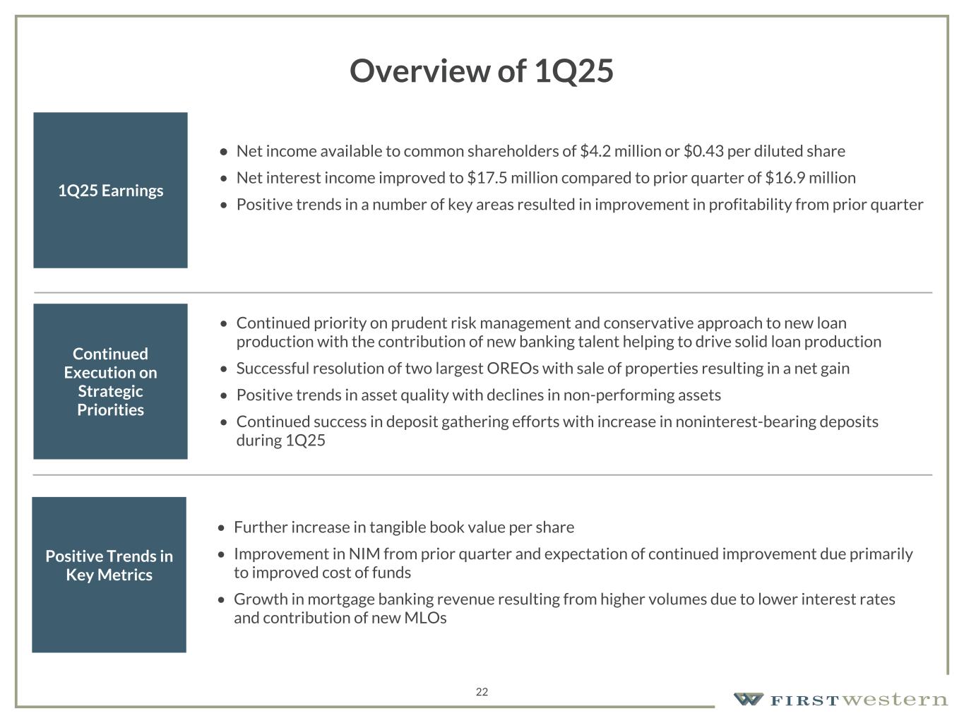 157 180 196 164 166 168 62 94 111 154 161 132 122 125 129 76 78 86 255 255 255 Chart color Table color Special Headlines Slide Headlines / Text on light background Primary Colors Secondary Colors Primary Background / Call Out Boxes / Text on dark background Chart color Table Color Tertiary Colors Chart color Table Color Chart Color Chart Color Approved Fonts AaBbCc 123 Lora (bold) Slide Headlines / Special Headlines AaBbCc 123 Lato(regular, bold, italics) Body Copy / Subheadings / Small Text Descriptions Overview of 1Q25 1Q25 Earnings • Net income available to common shareholders of $4.2 million or $0.43 per diluted share • Net interest income improved to $17.5 million compared to prior quarter of $16.9 million • Positive trends in a number of key areas resulted in improvement in profitability from prior quarter Continued Execution on Strategic Priorities • Continued priority on prudent risk management and conservative approach to new loan production with the contribution of new banking talent helping to drive solid loan production • Successful resolution of two largest OREOs with sale of properties resulting in a net gain • Positive trends in asset quality with declines in non-performing assets • Continued success in deposit gathering efforts with increase in noninterest-bearing deposits during 1Q25 Positive Trends in Key Metrics • Further increase in tangible book value per share • Improvement in NIM from prior quarter and expectation of continued improvement due primarily to improved cost of funds • Growth in mortgage banking revenue resulting from higher volumes due to lower interest rates and contribution of new MLOs 22