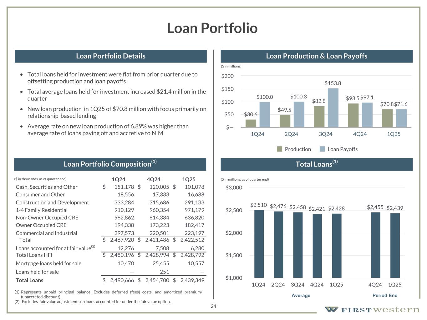 157 180 196 164 166 168 62 94 111 154 161 132 122 125 129 76 78 86 255 255 255 Chart color Table color Special Headlines Slide Headlines / Text on light background Primary Colors Secondary Colors Primary Background / Call Out Boxes / Text on dark background Chart color Table Color Tertiary Colors Chart color Table Color Chart Color Chart Color Approved Fonts AaBbCc 123 Lora (bold) Slide Headlines / Special Headlines AaBbCc 123 Lato(regular, bold, italics) Body Copy / Subheadings / Small Text Descriptions 23 Net Income Available to Common Shareholders and Earnings per Share • Net income of $4.2 million, or $0.43 diluted earnings per share, in 1Q25 • Tangible book value per share(1) increased 2.1% to $23.30 Net Income Available to Common Shareholders Diluted Earnings per Share $2,515 $1,076 $2,134 $2,748 $4,185 1Q24 2Q24 3Q24 4Q24 1Q25 $0 $1,000 $2,000 $3,000 $4,000 $5,000 $0.26 $0.11 $0.22 $0.28 $0.43 1Q24 2Q24 3Q24 4Q24 1Q25 $— $0.10 $0.20 $0.30 $0.40 $0.50 (1) See Non-GAAP reconciliation within the appendix