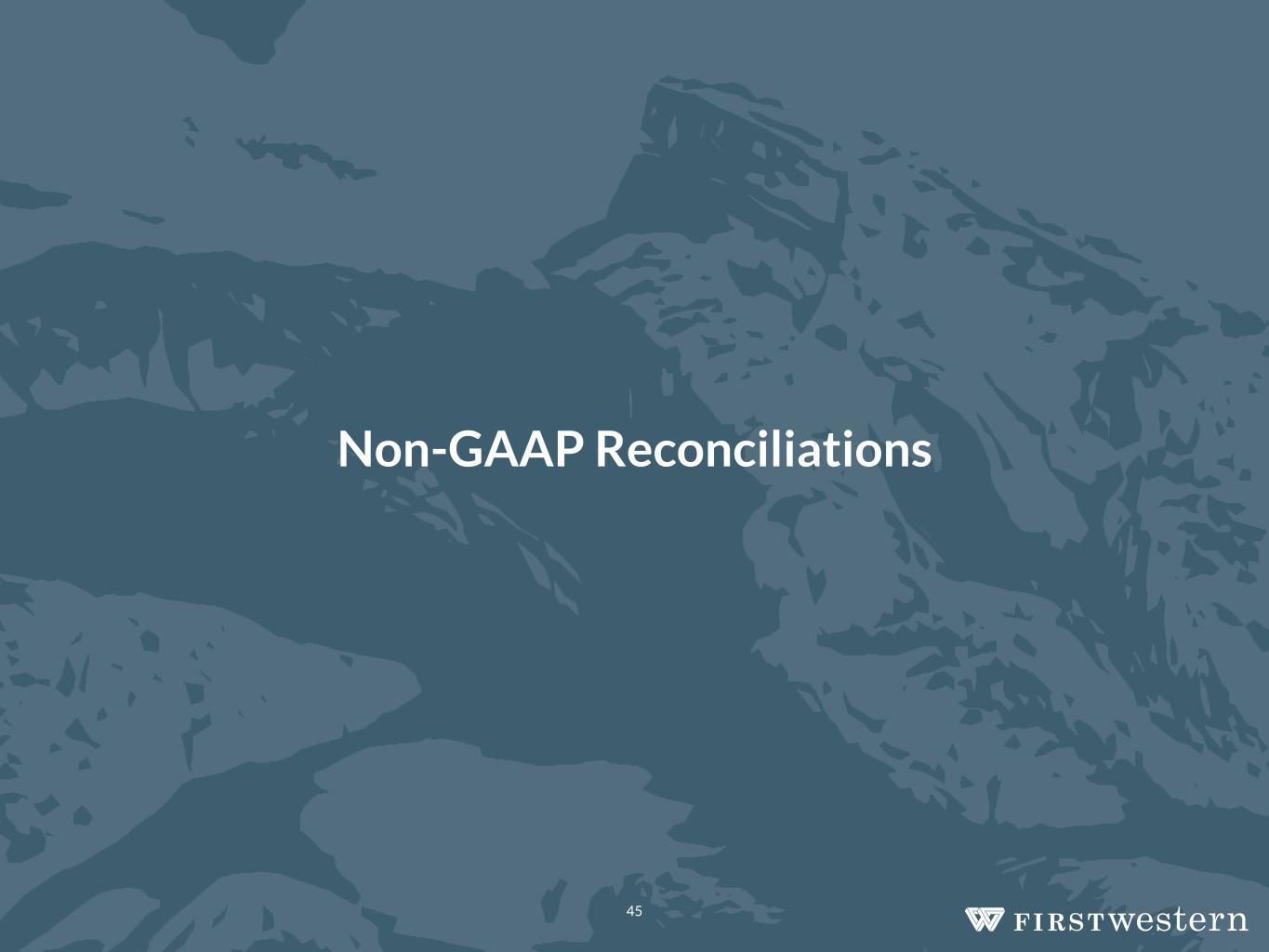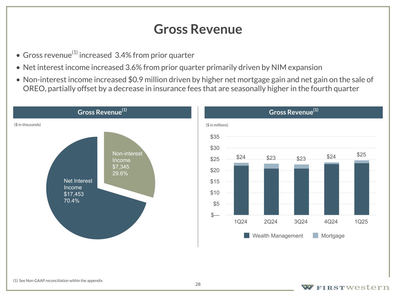 157 180 196 164 166 168 62 94 111 154 161 132 122 125 129 76 78 86 255 255 255 Chart color Table color Special Headlines Slide Headlines / Text on light background Primary Colors Secondary Colors Primary Background / Call Out Boxes / Text on dark background Chart color Table Color Tertiary Colors Chart color Table Color Chart Color Chart Color Approved Fonts AaBbCc 123 Lora (bold) Slide Headlines / Special Headlines AaBbCc 123 Lato (regular, bold, italics) Body Copy / Subheadings / Small Text Descriptions 50 Non-GAAP Reconciliation Wealth Management Gross Revenue For the Three Months Ended, (Dollars in thousands) 31-Mar-24 30-Jun-24 30-Sep-24 31-Dec-24 31-Mar-25 Total income before non-interest expense $ 21,890 $ 18,242 $ 20,296 $ 23,540 $ 23,468 Less: Unrealized (loss) gain recognized on equity securities (6) (2) 24 (49) 11 Less: Net (loss) gain on loans accounted for under the fair value option (302) (315) (233) (149) 6 Less: Net gain (loss) on loans held for sale at fair value 117 — — (222) 222 Plus: Provision for (release of) credit losses 72 2,334 501 (974) 80 Gross revenue $ 22,153 $ 20,893 $ 21,006 $ 22,986 $ 23,309 Mortgage Gross Revenue For the Three Months Ended, (Dollars in thousands) 31-Mar-24 30-Jun-24 30-Sep-24 31-Dec-24 31-Mar-25 Total income before non-interest expense $ 1,385 $ 2,174 $ 1,743 $ 801 $ 1,250 Gross revenue $ 1,385 $ 2,174 $ 1,743 $ 801 $ 1,250 Consolidated Gross Revenue For the Three Months Ended, (Dollars in thousands) 31-Mar-24 30-Jun-24 30-Sep-24 31-Dec-24 31-Mar-25 Total income before non-interest expense $ 23,275 $ 20,416 $ 22,039 $ 24,341 $ 24,718 Less: Unrealized (loss) gain recognized on equity securities (6) (2) 24 (49) 11 Less: Net loss (gain) on loans accounted for under the fair value option (302) (315) (233) (149) 6 Less: Net gain (loss) on loans held for sale at fair value 117 — — (222) 222 Plus: Provision for (release of) credit losses 72 2,334 501 (974) 80 Gross revenue $ 23,538 $ 23,067 $ 22,749 $ 23,787 $ 24,559