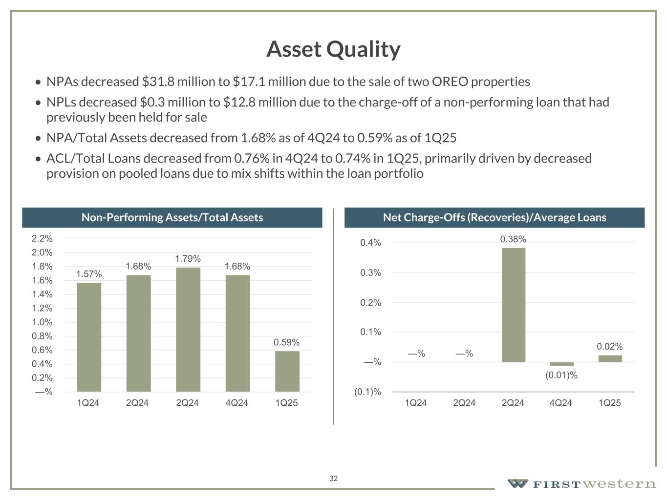 157 180 196 164 166 168 62 94 111 154 161 132 122 125 129 76 78 86 255 255 255 Chart color Table color Special Headlines Slide Headlines / Text on light background Primary Colors Secondary Colors Primary Background / Call Out Boxes / Text on dark background Chart color Table Color Tertiary Colors Chart color Table Color Chart Color Chart Color Approved Fonts AaBbCc 123 Lora (bold) Slide Headlines / Special Headlines AaBbCc 123 Lato (regular, bold, italics) Body Copy / Subheadings / Small Text Descriptions 31 Non-Interest Expense and Efficiency Ratio • Non-interest expense decreased to $19.4 million from $20.4 million in the fourth quarter of 2024, primarily driven by a one-time $1.1 million OREO write-down recognized in 4Q24 • Non-interest expense decreased $0.3 million from $19.7 million in the first quarter of 2024 in spite of ongoing inflationary pressures • The efficiency ratio improved in the quarter from 80.74% as of 4Q24 to 79.16% as of 1Q25 • The efficiency ratio improved 4.52% from 83.68% as of 1Q24 (1) See Non-GAAP reconciliation within the appendix Adjusted Non-Interest Expense(1) Operating Efficiency Ratio(1) (1) (1) (1) $19,696 $18,972 $19,333 $19,205 $19,441 1Q24 2Q24 2Q24 4Q24 1Q25 $— $5,000 $10,000 $15,000 $20,000 $25,000 83.68% 82.25% 84.98% 80.74% 79.16% 1Q24 2Q24 2Q24 4Q24 1Q25 —% 20% 40% 60% 80% 100%($ in thousands)
