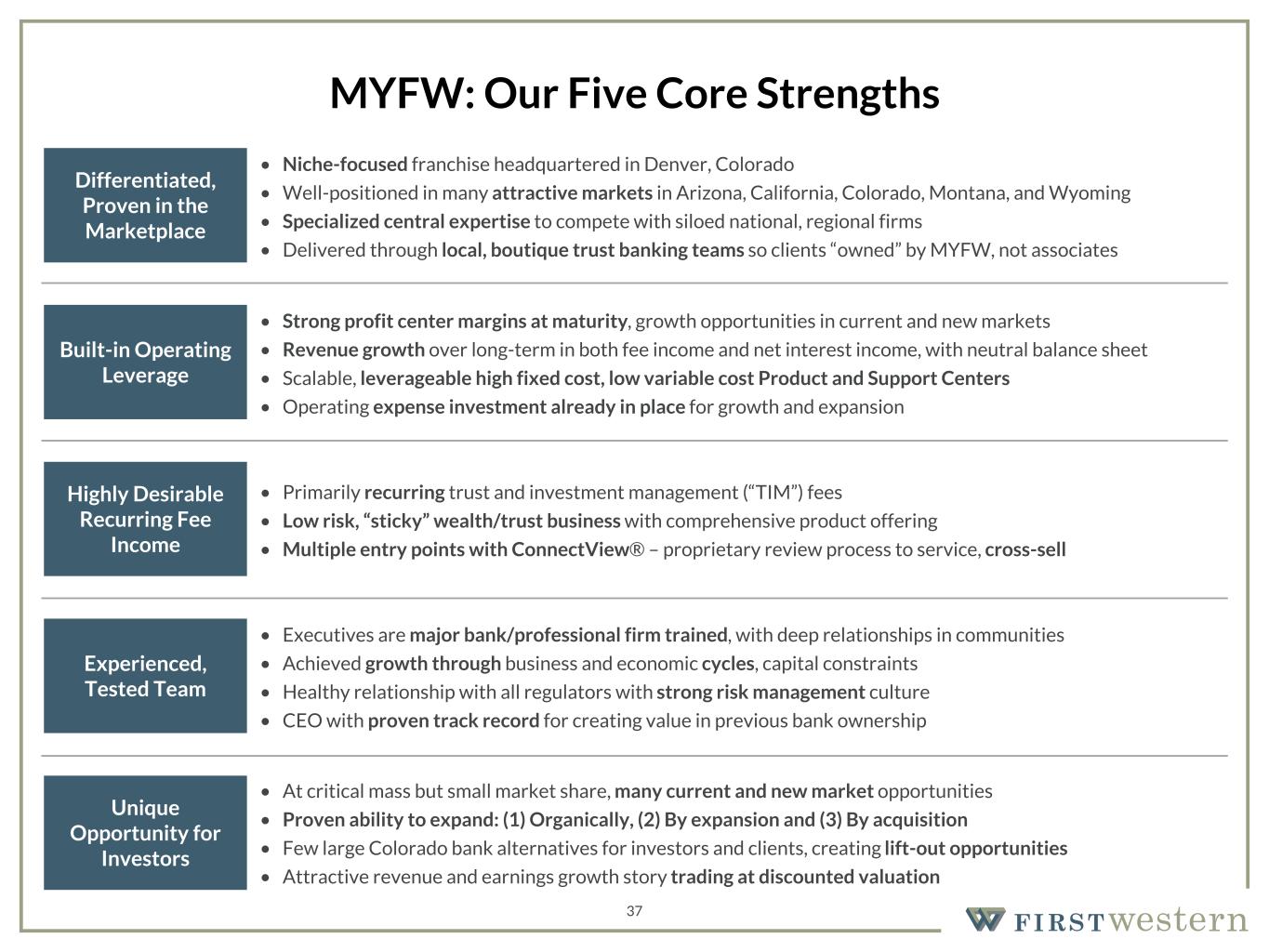 157 180 196 164 166 168 62 94 111 154 161 132 122 125 129 76 78 86 255 255 255 Chart color Table color Special Headlines Slide Headlines / Text on light background Primary Colors Secondary Colors Primary Background / Call Out Boxes / Text on dark background Chart color Table Color Tertiary Colors Chart color Table Color Chart Color Chart Color Approved Fonts AaBbCc 123 Lora (bold) Slide Headlines / Special Headlines AaBbCc 123 Lato (regular, bold, italics) Body Copy / Subheadings / Small Text Descriptions 37 MYFW: Our Five Core Strengths Differentiated, Proven in the Marketplace Built-in Operating Leverage Highly Desirable Recurring Fee Income Experienced, Tested Team Unique Opportunity for Investors • Niche-focused franchise headquartered in Denver, Colorado • Well-positioned in many attractive markets in Arizona, California, Colorado, Montana, and Wyoming • Specialized central expertise to compete with siloed national, regional firms • Delivered through local, boutique trust banking teams so clients “owned” by MYFW, not associates • Strong profit center margins at maturity, growth opportunities in current and new markets • Revenue growth over long-term in both fee income and net interest income, with neutral balance sheet • Scalable, leverageable high fixed cost, low variable cost Product and Support Centers • Operating expense investment already in place for growth and expansion • Primarily recurring trust and investment management (“TIM”) fees • Low risk, “sticky” wealth/trust business with comprehensive product offering • Multiple entry points with ConnectView® – proprietary review process to service, cross-sell • At critical mass but small market share, many current and new market opportunities • Proven ability to expand: (1) Organically, (2) By expansion and (3) By acquisition • Few large Colorado bank alternatives for investors and clients, creating lift-out opportunities • Attractive revenue and earnings growth story trading at discounted valuation • Executives are major bank/professional firm trained, with deep relationships in communities • Achieved growth through business and economic cycles, capital constraints • Healthy relationship with all regulators with strong risk management culture • CEO with proven track record for creating value in previous bank ownership