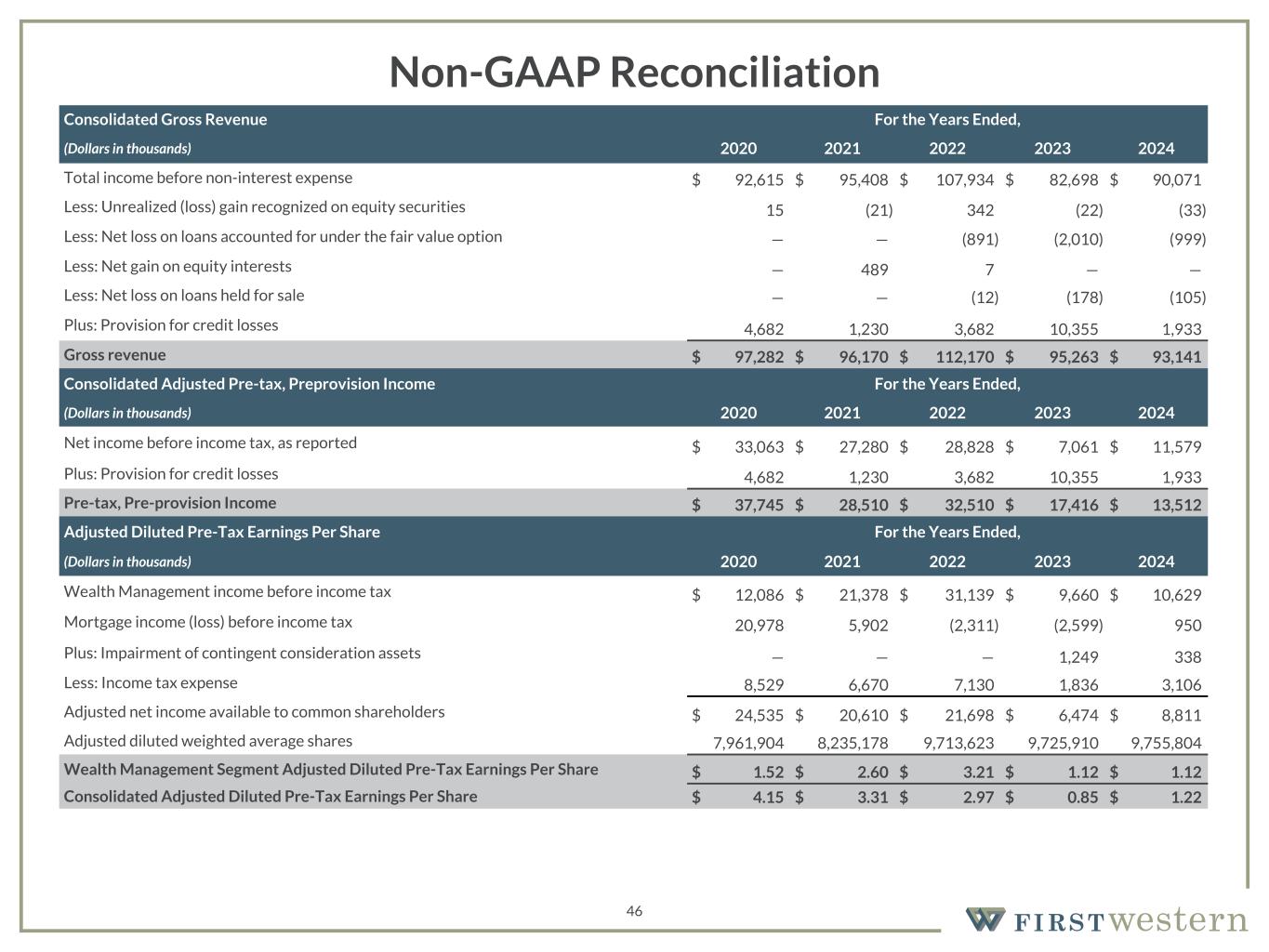 157 180 196 164 166 168 62 94 111 154 161 132 122 125 129 76 78 86 255 255 255 Chart color Table color Special Headlines Slide Headlines / Text on light background Primary Colors Secondary Colors Primary Background / Call Out Boxes / Text on dark background Chart color Table Color Tertiary Colors Chart color Table Color Chart Color Chart Color Approved Fonts AaBbCc 123 Lora (bold) Slide Headlines / Special Headlines AaBbCc 123 Lato (regular, bold, italics) Body Copy / Subheadings / Small Text Descriptions 46 Non-GAAP Reconciliation Consolidated Gross Revenue For the Years Ended, (Dollars in thousands) 2020 2021 2022 2023 2024 Total income before non-interest expense $ 92,615 $ 95,408 $ 107,934 $ 82,698 $ 90,071 Less: Unrealized (loss) gain recognized on equity securities 15 (21) 342 (22) (33) Less: Net loss on loans accounted for under the fair value option — — (891) (2,010) (999) Less: Net gain on equity interests — 489 7 — — Less: Net loss on loans held for sale — — (12) (178) (105) Plus: Provision for credit losses 4,682 1,230 3,682 10,355 1,933 Gross revenue $ 97,282 $ 96,170 $ 112,170 $ 95,263 $ 93,141 Consolidated Adjusted Pre-tax, Preprovision Income For the Years Ended, (Dollars in thousands) 2020 2021 2022 2023 2024 Net income before income tax, as reported $ 33,063 $ 27,280 $ 28,828 $ 7,061 $ 11,579 Plus: Provision for credit losses 4,682 1,230 3,682 10,355 1,933 Pre-tax, Pre-provision Income $ 37,745 $ 28,510 $ 32,510 $ 17,416 $ 13,512 Adjusted Diluted Pre-Tax Earnings Per Share For the Years Ended, (Dollars in thousands) 2020 2021 2022 2023 2024 Wealth Management income before income tax $ 12,086 $ 21,378 $ 31,139 $ 9,660 $ 10,629 Mortgage income (loss) before income tax 20,978 5,902 (2,311) (2,599) 950 Plus: Impairment of contingent consideration assets — — — 1,249 338 Less: Income tax expense 8,529 6,670 7,130 1,836 3,106 Adjusted net income available to common shareholders $ 24,535 $ 20,610 $ 21,698 $ 6,474 $ 8,811 Adjusted diluted weighted average shares 7,961,904 8,235,178 9,713,623 9,725,910 9,755,804 Wealth Management Segment Adjusted Diluted Pre-Tax Earnings Per Share $ 1.52 $ 2.60 $ 3.21 $ 1.12 $ 1.12 Consolidated Adjusted Diluted Pre-Tax Earnings Per Share $ 4.15 $ 3.31 $ 2.97 $ 0.85 $ 1.22