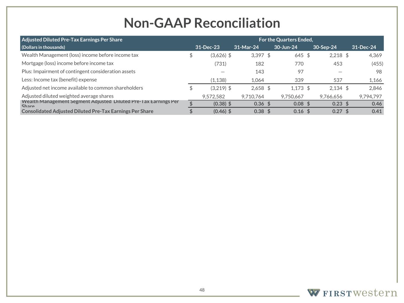 157 180 196 164 166 168 62 94 111 154 161 132 122 125 129 76 78 86 255 255 255 Chart color Table color Special Headlines Slide Headlines / Text on light background Primary Colors Secondary Colors Primary Background / Call Out Boxes / Text on dark background Chart color Table Color Tertiary Colors Chart color Table Color Chart Color Chart Color Approved Fonts AaBbCc 123 Lora (bold) Slide Headlines / Special Headlines AaBbCc 123 Lato(regular, bold, italics) Body Copy / Subheadings / Small Text Descriptions 48 Non-GAAP Reconciliation Adjusted Diluted Pre-Tax Earnings Per Share For the Quarters Ended, (Dollars in thousands) 31-Dec-23 31-Mar-24 30-Jun-24 30-Sep-24 31-Dec-24 Wealth Management (loss) income before income tax $ (3,626) $ 3,397 $ 645 $ 2,218 $ 4,369 Mortgage (loss) income before income tax (731) 182 770 453 (455) Plus: Impairment of contingent consideration assets — 143 97 — 98 Less: Income tax (benefit) expense (1,138) 1,064 339 537 1,166 Adjusted net income available to common shareholders $ (3,219) $ 2,658 $ 1,173 $ 2,134 $ 2,846 Adjusted diluted weighted average shares 9,572,582 9,710,764 9,750,667 9,766,656 9,794,797 Wealth Management Segment Adjusted Diluted Pre-Tax Earnings Per Share $ (0.38) $ 0.36 $ 0.08 $ 0.23 $ 0.46 Consolidated Adjusted Diluted Pre-Tax Earnings Per Share $ (0.46) $ 0.38 $ 0.16 $ 0.27 $ 0.41