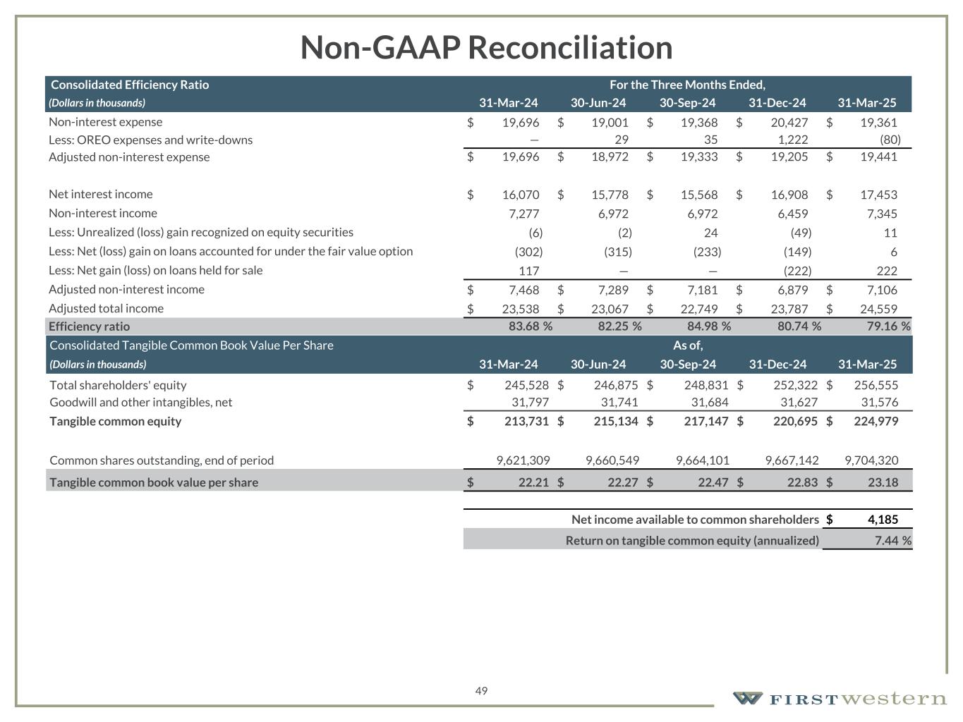 157 180 196 164 166 168 62 94 111 154 161 132 122 125 129 76 78 86 255 255 255 Chart color Table color Special Headlines Slide Headlines / Text on light background Primary Colors Secondary Colors Primary Background / Call Out Boxes / Text on dark background Chart color Table Color Tertiary Colors Chart color Table Color Chart Color Chart Color Approved Fonts AaBbCc 123 Lora (bold) Slide Headlines / Special Headlines AaBbCc 123 Lato (regular, bold, italics) Body Copy / Subheadings / Small Text Descriptions 49 Non-GAAP Reconciliation Consolidated Tangible Common Book Value Per Share As of, (Dollars in thousands) 31-Mar-24 30-Jun-24 30-Sep-24 31-Dec-24 31-Mar-25 Total shareholders' equity $ 245,528 $ 246,875 $ 248,831 $ 252,322 $ 256,555 Goodwill and other intangibles, net 31,797 31,741 31,684 31,627 31,576 Tangible common equity $ 213,731 $ 215,134 $ 217,147 $ 220,695 $ 224,979 Common shares outstanding, end of period 9,621,309 9,660,549 9,664,101 9,667,142 9,704,320 Tangible common book value per share $ 22.21 $ 22.27 $ 22.47 $ 22.83 $ 23.18 Net income available to common shareholders $ 4,185 Return on tangible common equity (annualized) 7.44 % Consolidated Efficiency Ratio For the Three Months Ended, (Dollars in thousands) 31-Mar-24 30-Jun-24 30-Sep-24 31-Dec-24 31-Mar-25 Non-interest expense $ 19,696 $ 19,001 $ 19,368 $ 20,427 $ 19,361 Less: OREO expenses and write-downs — 29 35 1,222 (80) Adjusted non-interest expense $ 19,696 $ 18,972 $ 19,333 $ 19,205 $ 19,441 Net interest income $ 16,070 $ 15,778 $ 15,568 $ 16,908 $ 17,453 Non-interest income 7,277 6,972 6,972 6,459 7,345 Less: Unrealized (loss) gain recognized on equity securities (6) (2) 24 (49) 11 Less: Net (loss) gain on loans accounted for under the fair value option (302) (315) (233) (149) 6 Less: Net gain (loss) on loans held for sale 117 — — (222) 222 Adjusted non-interest income $ 7,468 $ 7,289 $ 7,181 $ 6,879 $ 7,106 Adjusted total income $ 23,538 $ 23,067 $ 22,749 $ 23,787 $ 24,559 Efficiency ratio 83.68 % 82.25 % 84.98 % 80.74 % 79.16 %