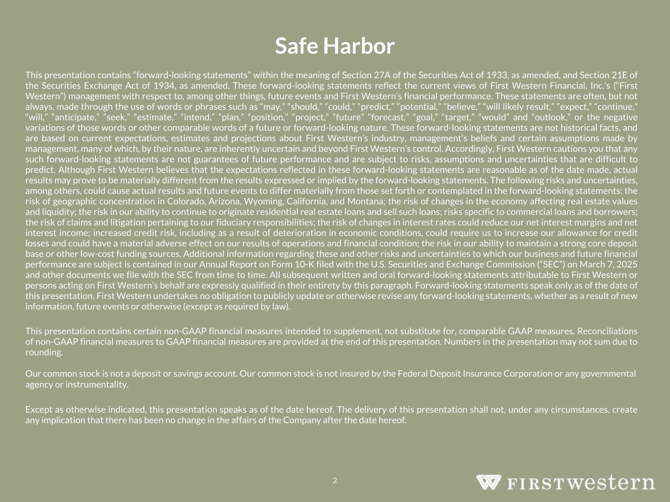 Denver, Colo., July 24, 2025 – First Western Financial, Inc. (“First Western” or the “Company”) (NASDAQ: MYFW), today reported financial results for the second quarter ended June 30, 2025.