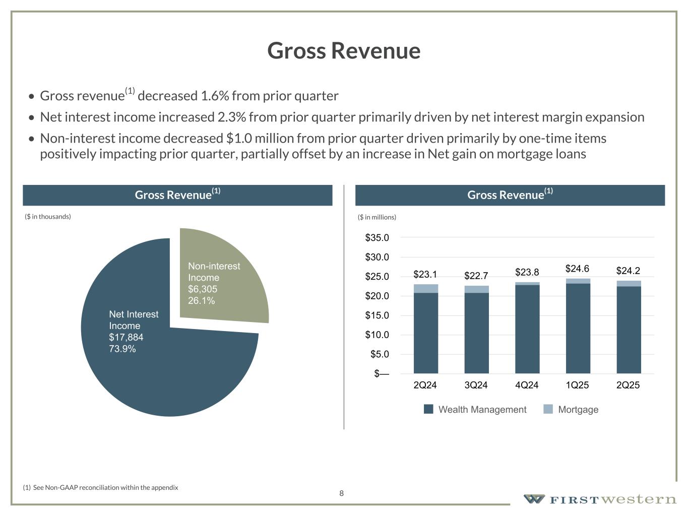Total income before non-interest expense was $22.4 million for the second quarter of 2025, a decrease of 9.3% from $24.7 million for the first quarter of 2025. Gross revenue(1) was $24.2 million for the second quarter of 2025, a decrease of 1.6% from $24.6 million for the first quarter of 2025. Relative to the first quarter of 2025, the decrease in total income before non-interest expense was primarily driven by an increase in the Provision for credit losses and decreases in Net gain on loans held for sale and Net gain on other real estate owned, partially offset by an increase in Net interest income. Relative to the second quarter of 2024, total income before non-interest expense increased 9.8% from $20.4 million and Gross revenue increased 4.8% from $23.1 million. Relative to the second quarter of 2024, the increase in total income before non-interest expense was primarily driven by an increase in Net interest income and decrease in the Provision for credit losses, partially offset by a decrease in Net gain on mortgage loans.
